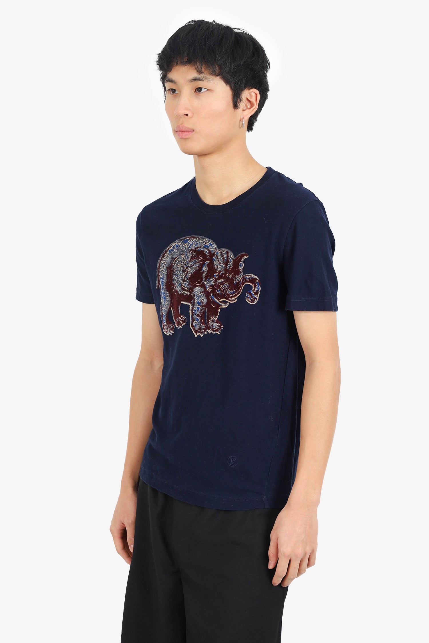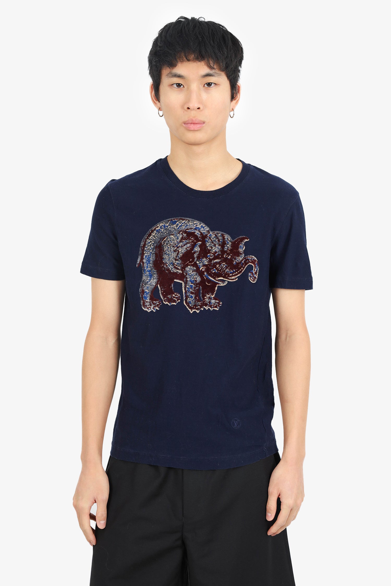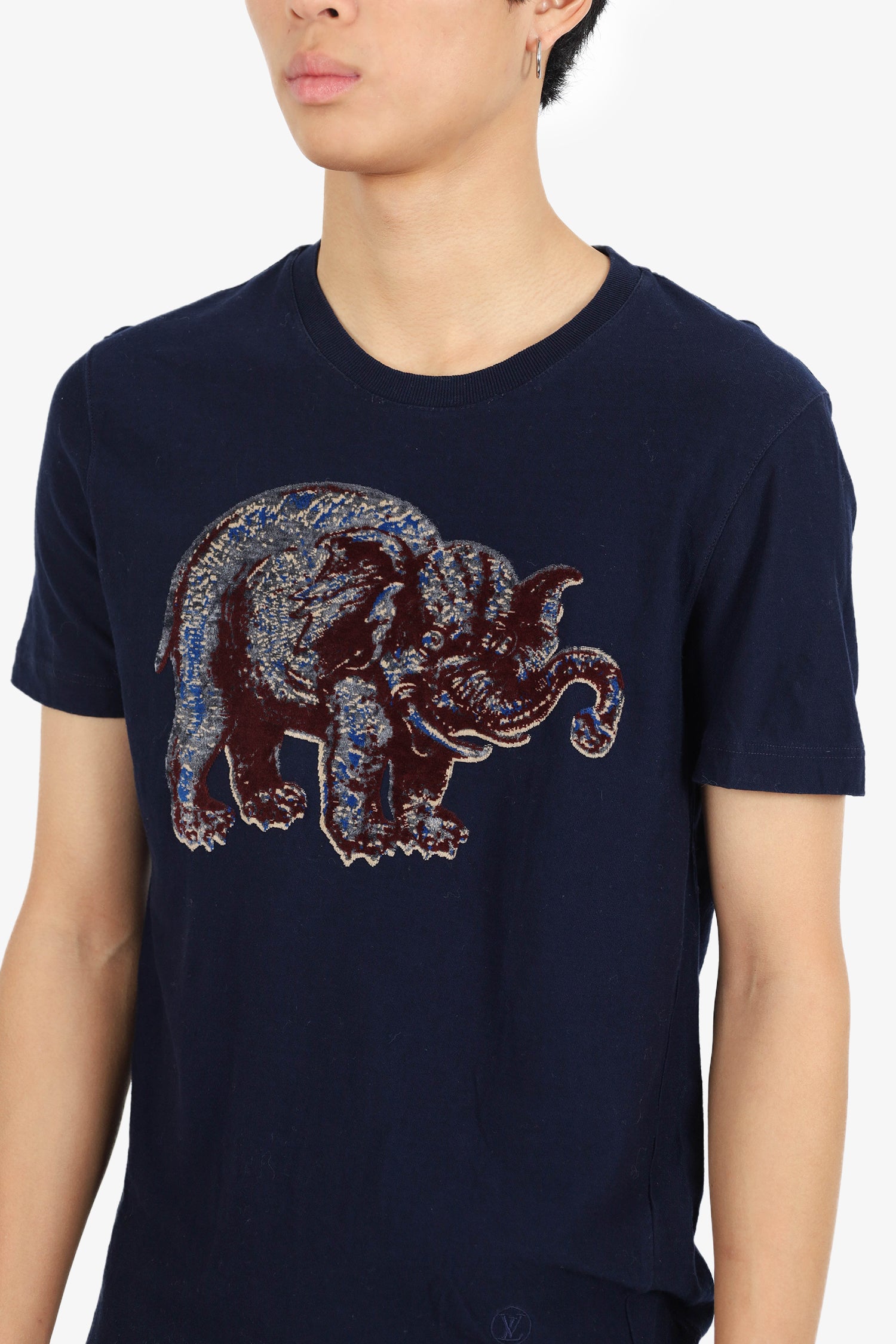 Refresh availabilityLouis Vuitton x Chapman Brothers Navy Elephant T-Shirt. Pull-on. Round neckline. Logo stitched on front bottom left. Ribbed trimming around neckline. Unlined. Tonal stitching.