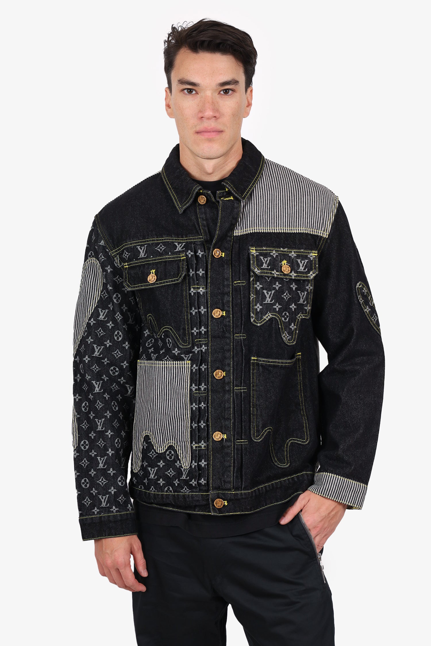 Refresh availabilityLouis Vuitton X Nigo Dark Blue Denim Monogram/Striped Jacket. Pull-on. Collared neckline. Front button-up closure. Sleeve cuffs with button-up closure. 4 exterior pockets; 2 slip and 2 flap with button-up closure. Bronze-tone hardware. Contrast stitching.