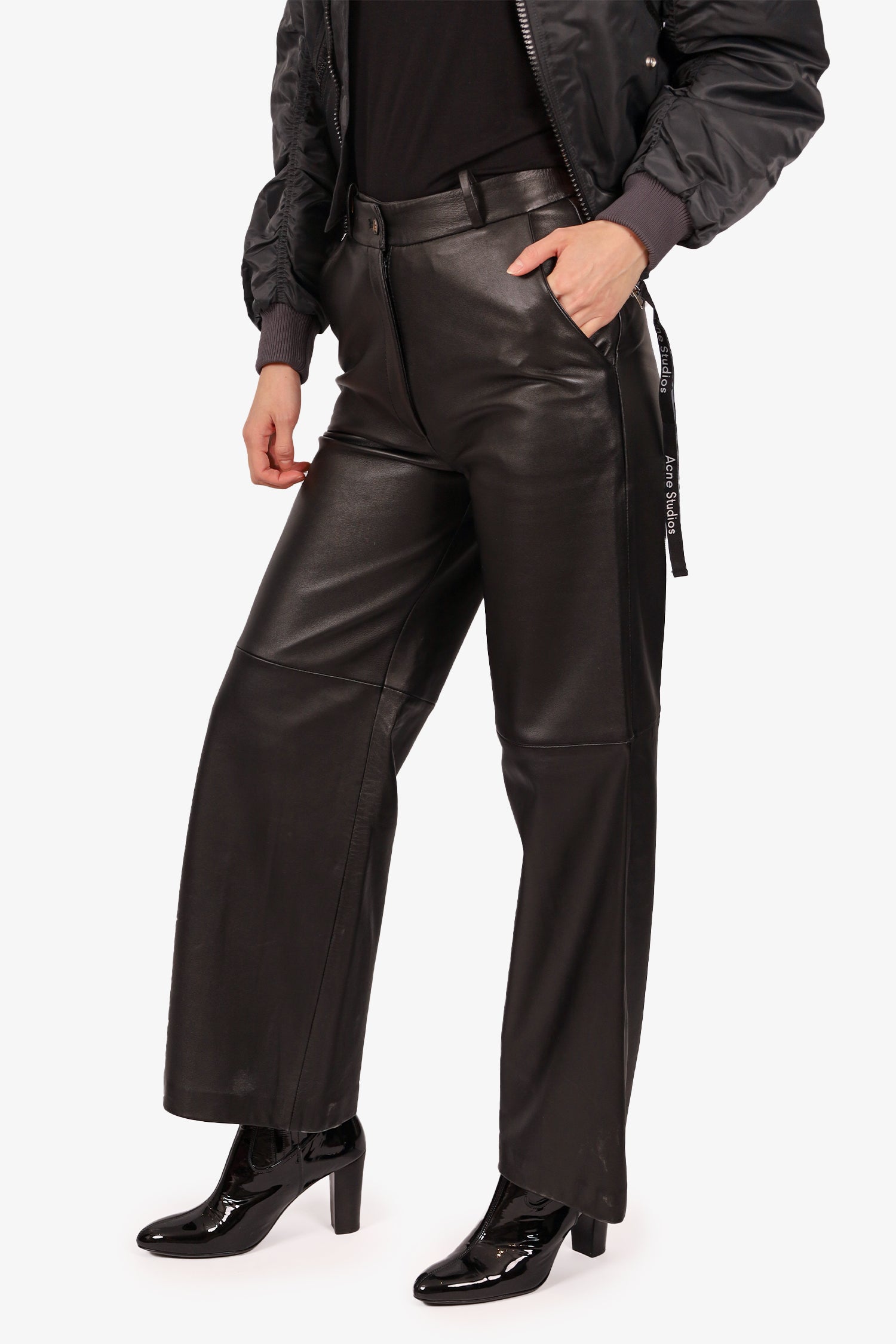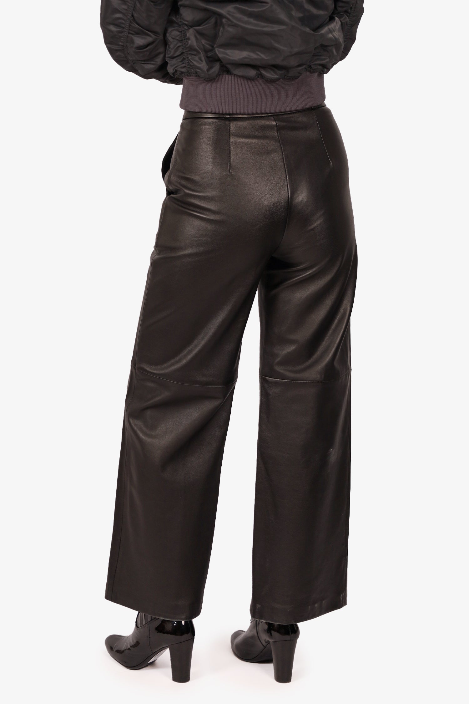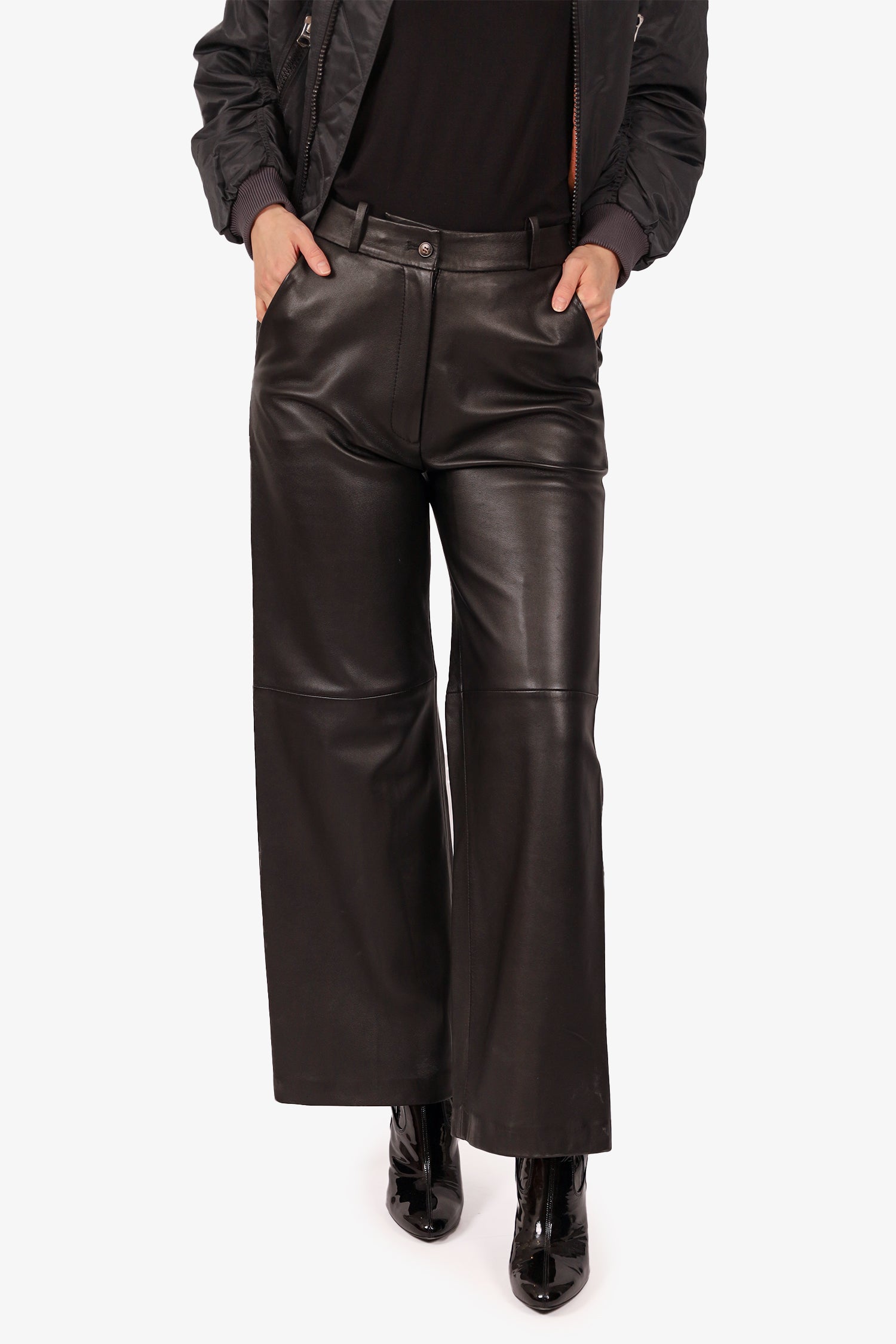 Refresh availabilityLouLou Studios Black Leather Wide Leg Pants. Front zip with button-up closure. 2 front slip pockets. Lined. Tonal stitching.