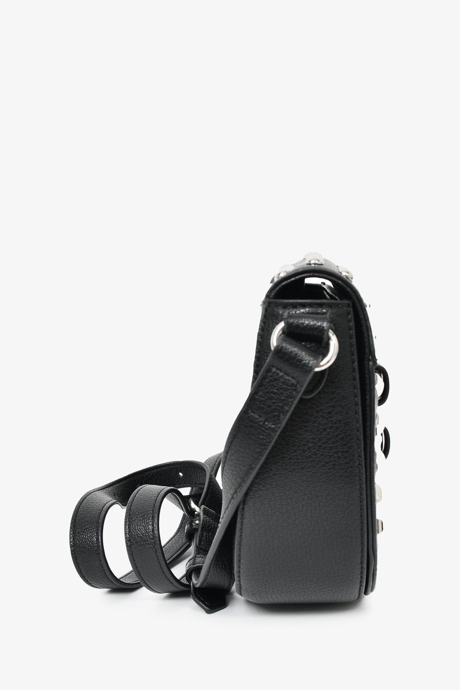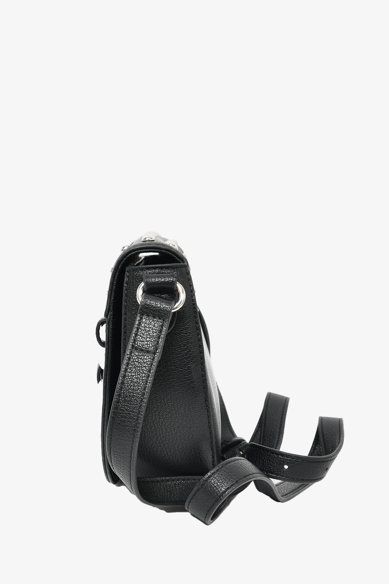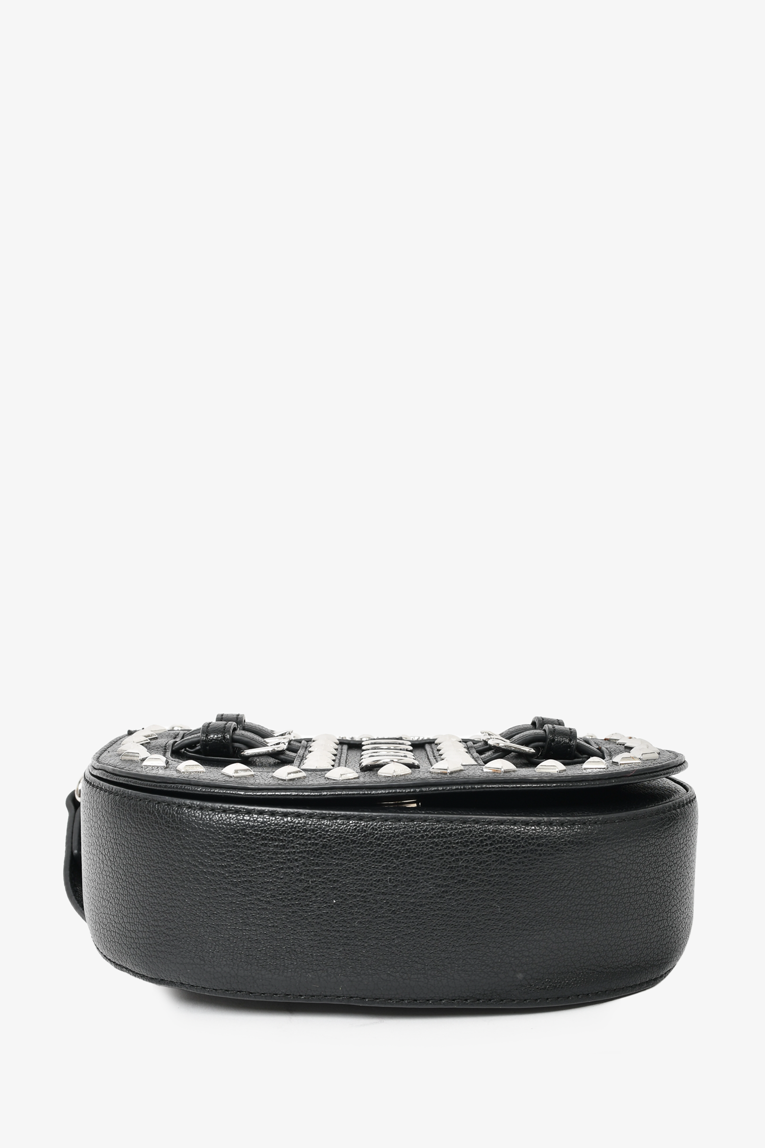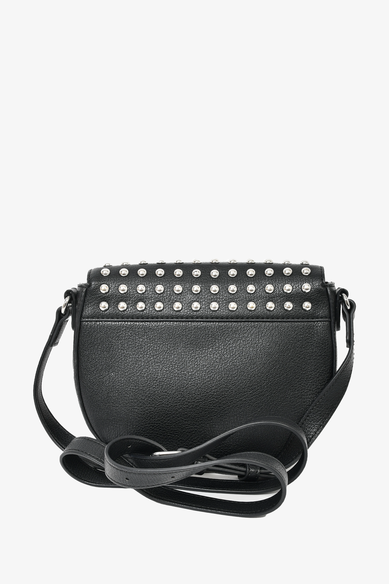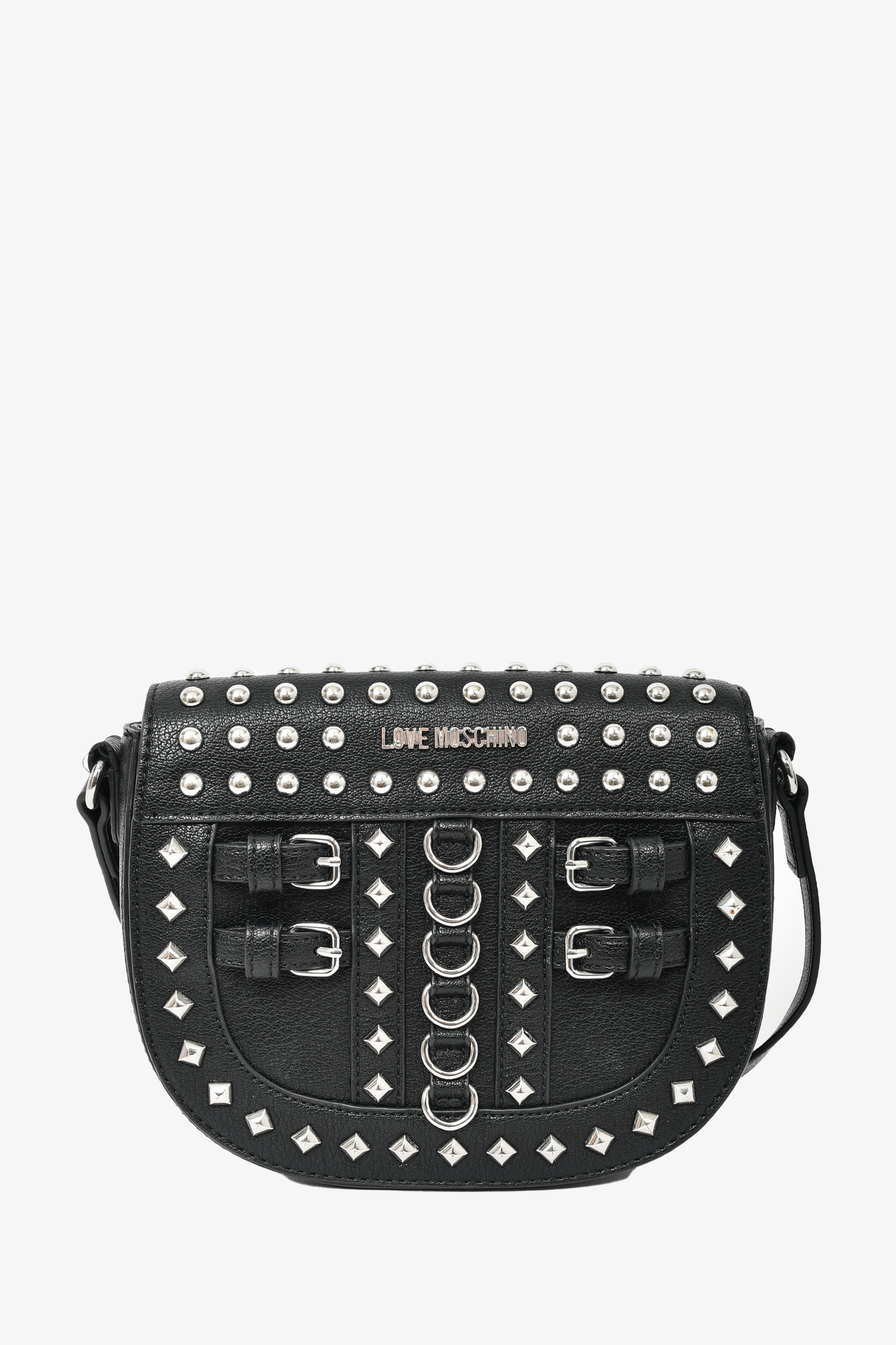 Refresh availabilityLove Moschino Black Leather Studded Crossbody Bag. Adjustable strap. Interior zip pocket. Magnetic button closure. Tonal stitching.
