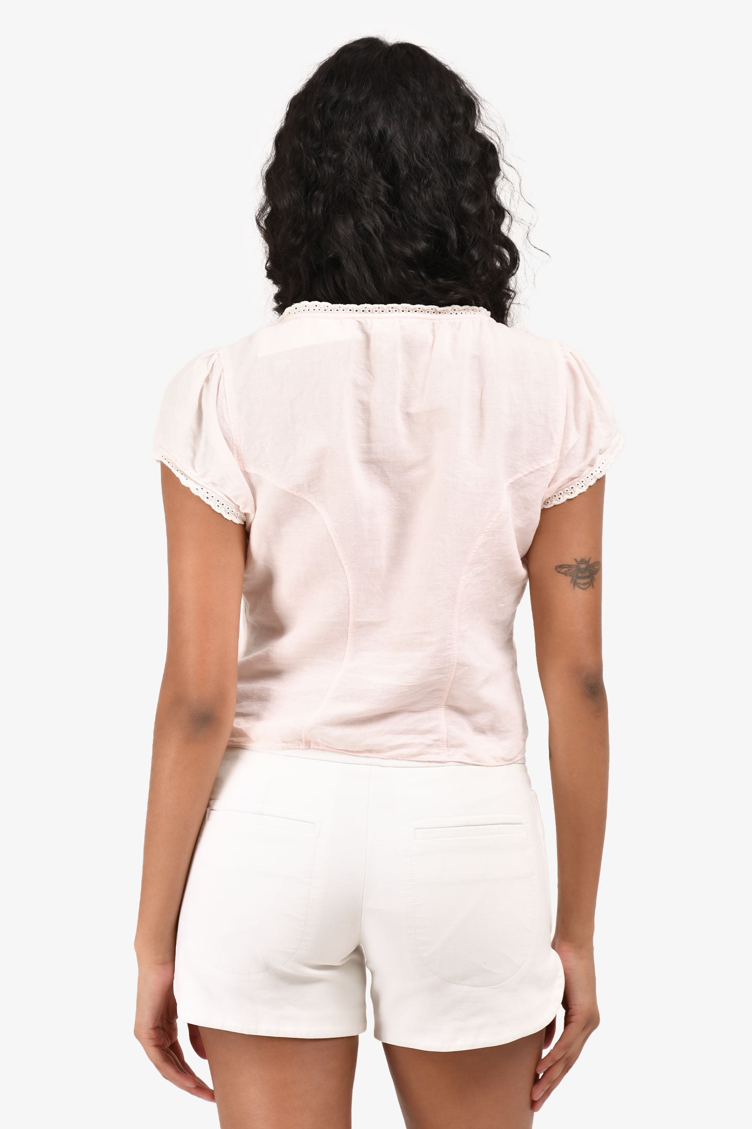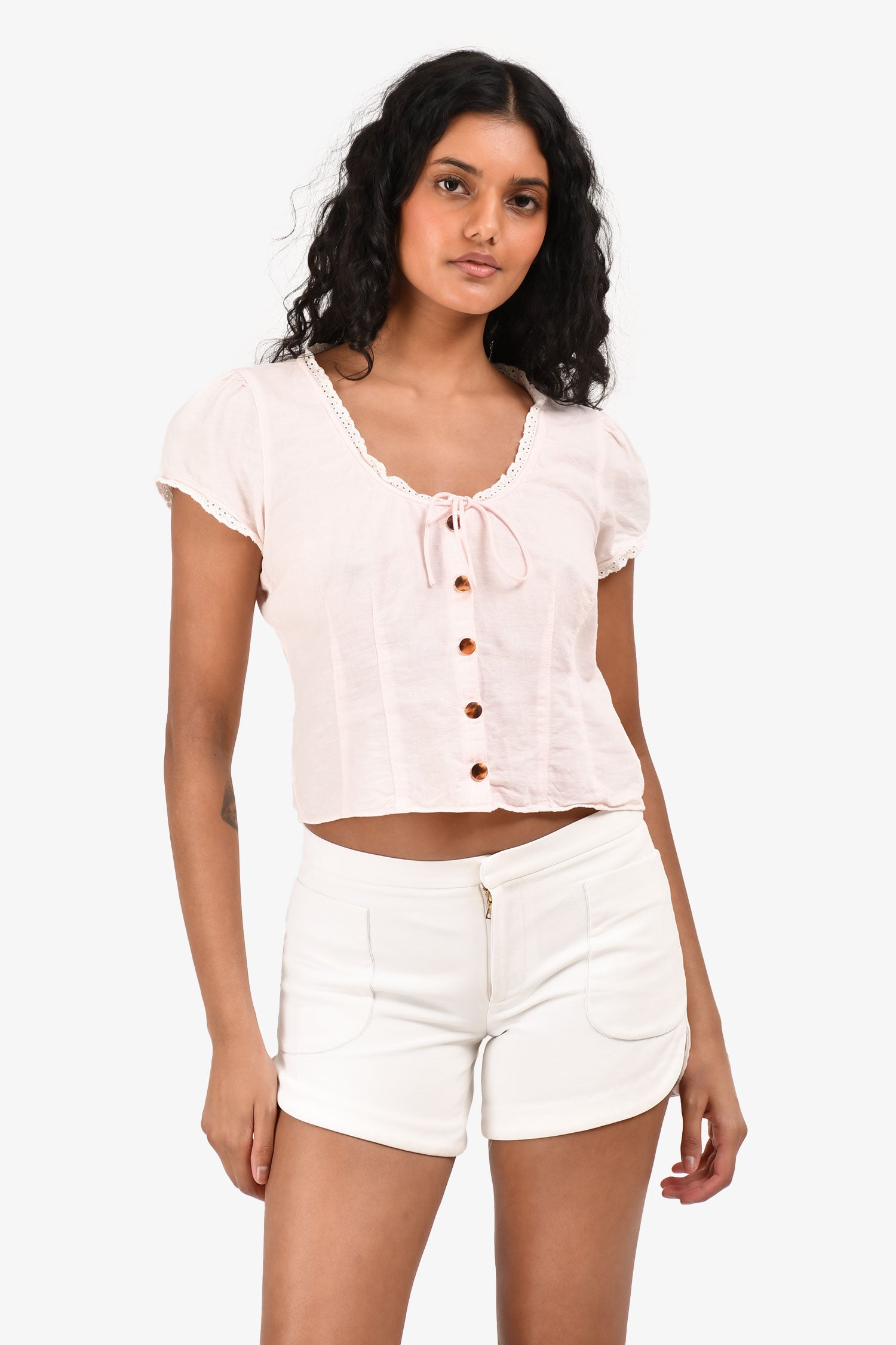 Refresh availabilityLoveShackFancy Pink Cotton Short Sleeve Top. Front button-up closure. Front tie detail. Delicate white eyelet lace trim along the neckline and sleeve hems. Tonal stitching.