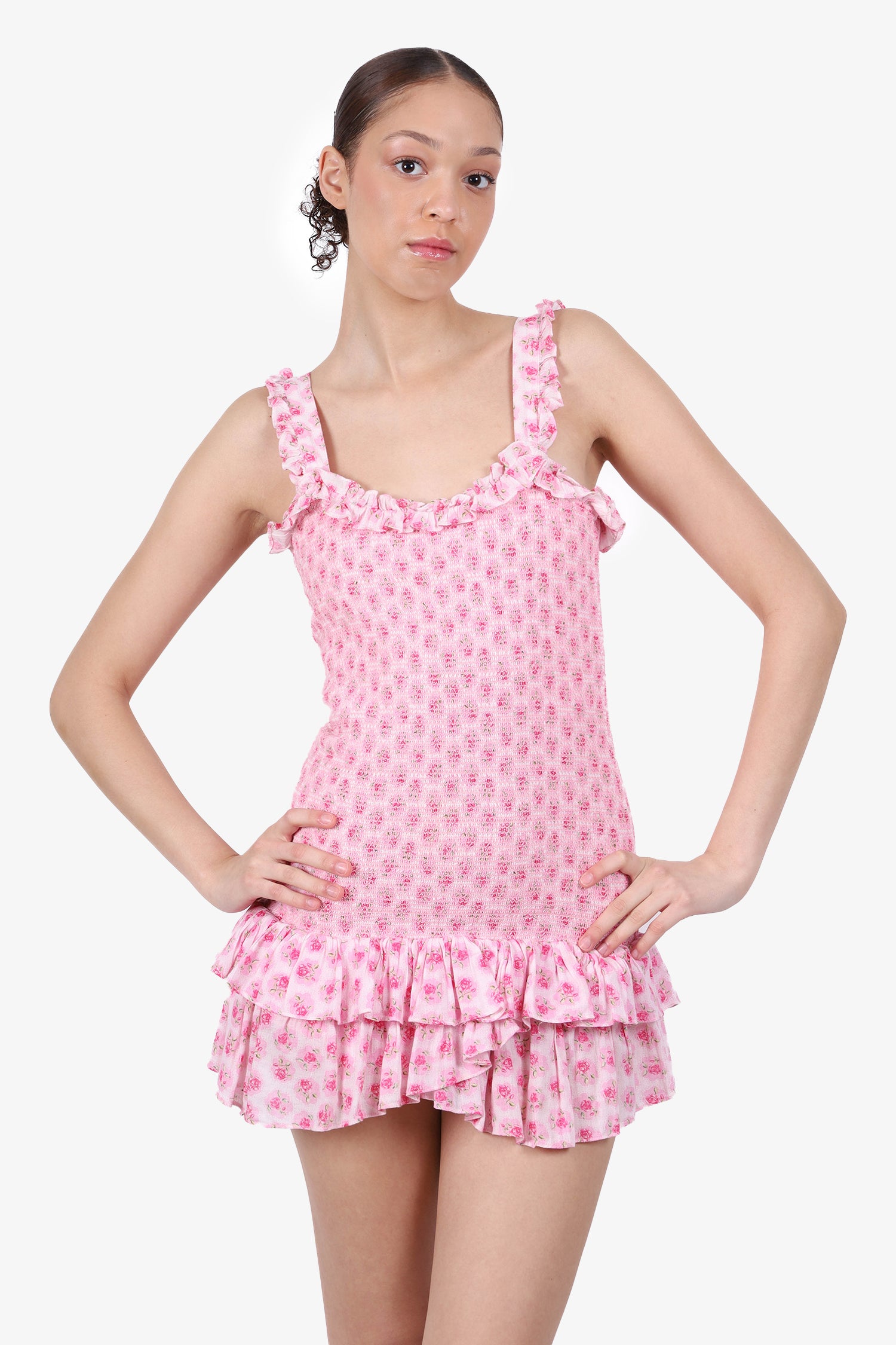 Refresh availabilityLove Shack Fancy Pink Floral Smock Mini Dress. Ruffled strap, neckline, and bottom hem.