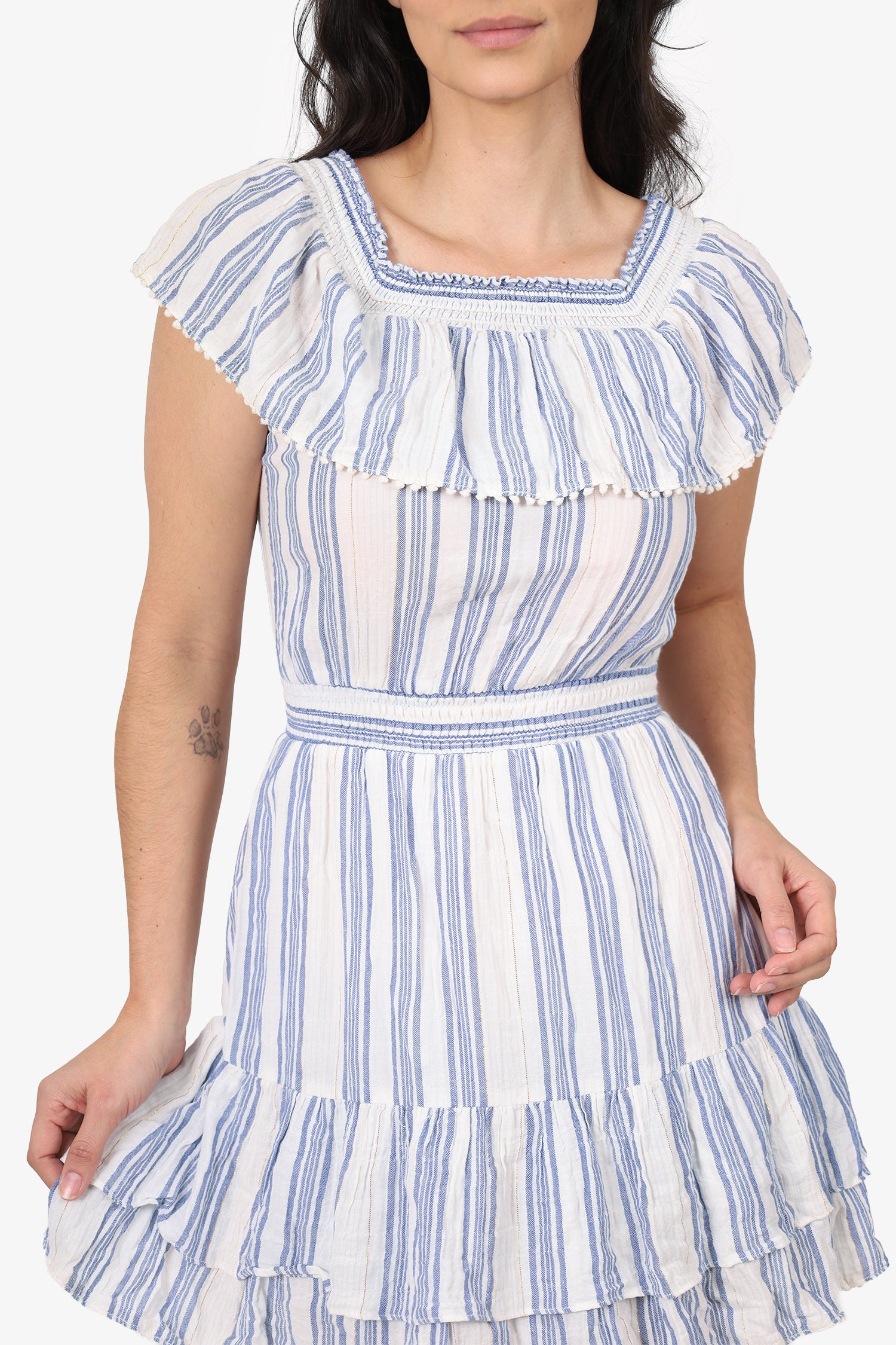 Refresh availabilityLove Shack Fancy White/Blue Striped Ruffle Mini Dress. Slip-on. Square neckline. Elasticized neckline and waistband. Lined interior. Tonal stitching.