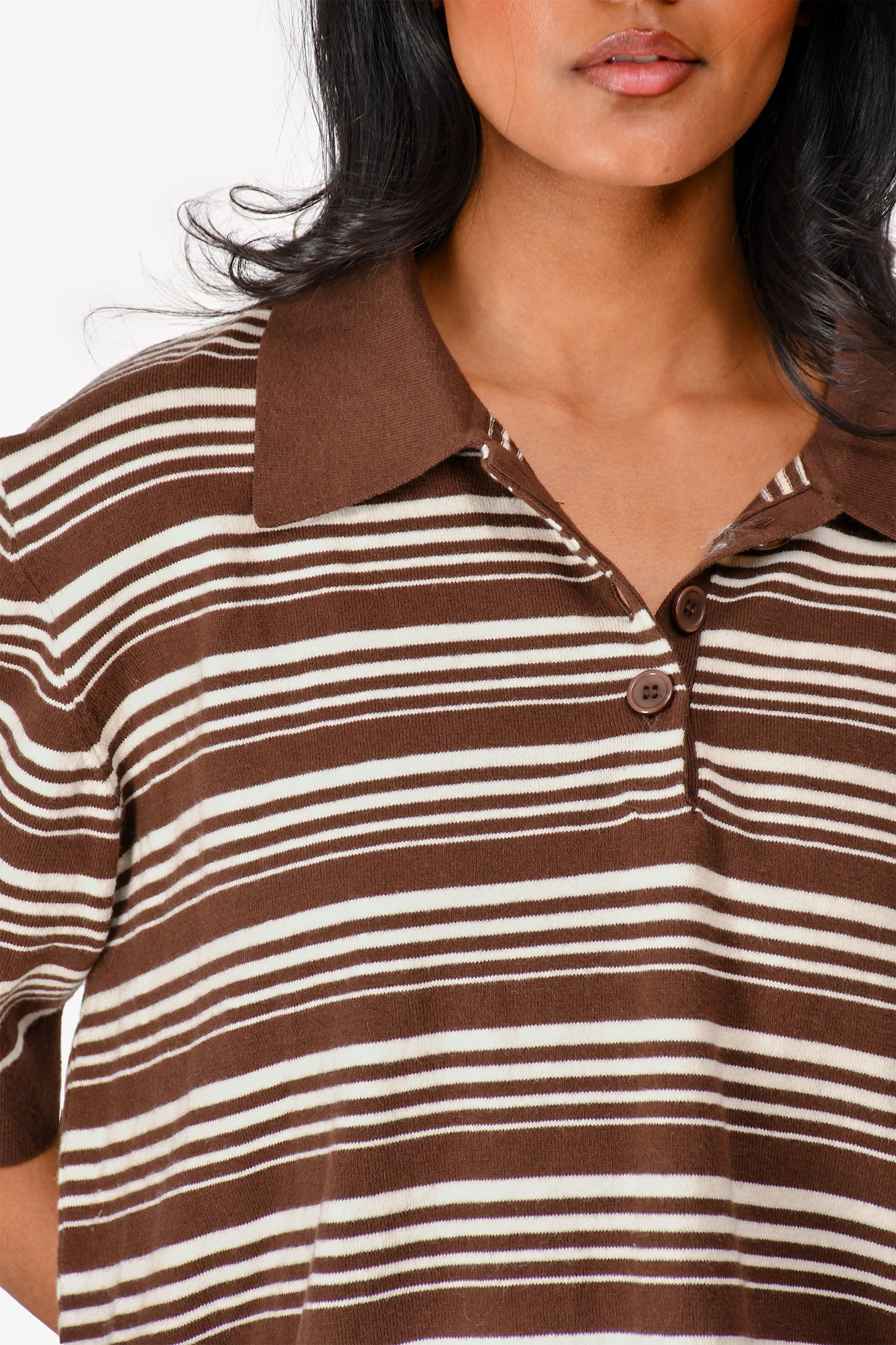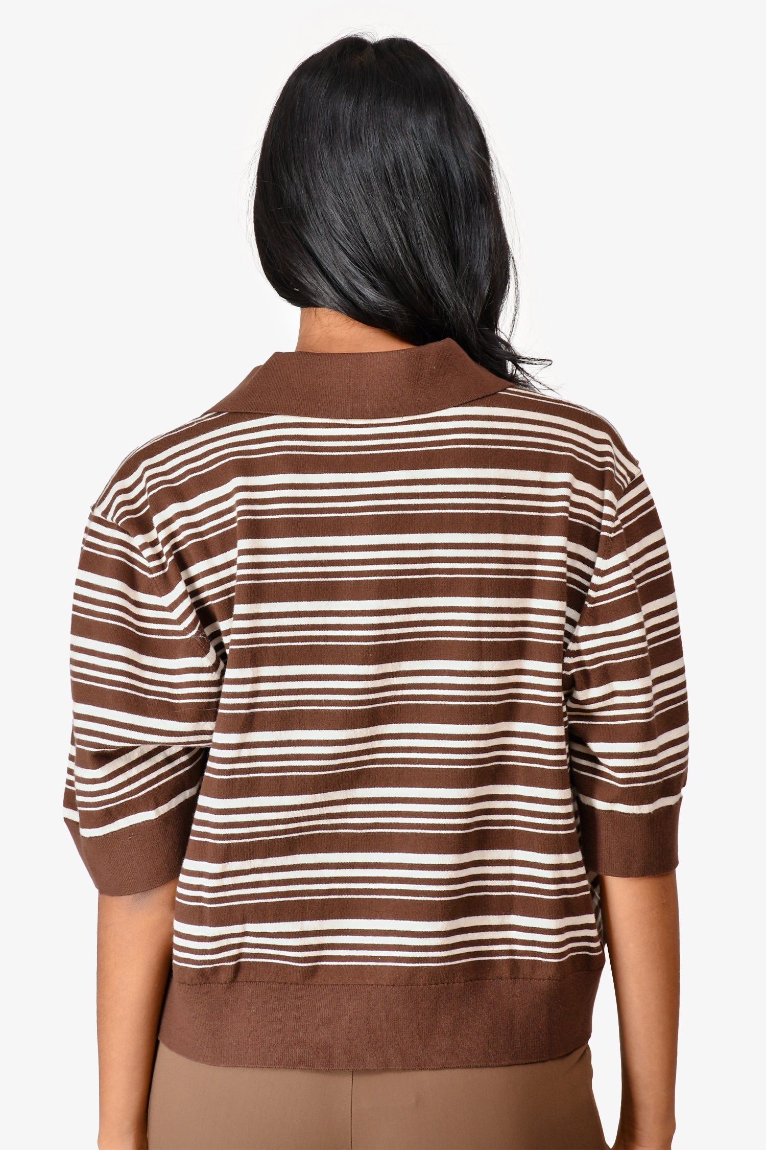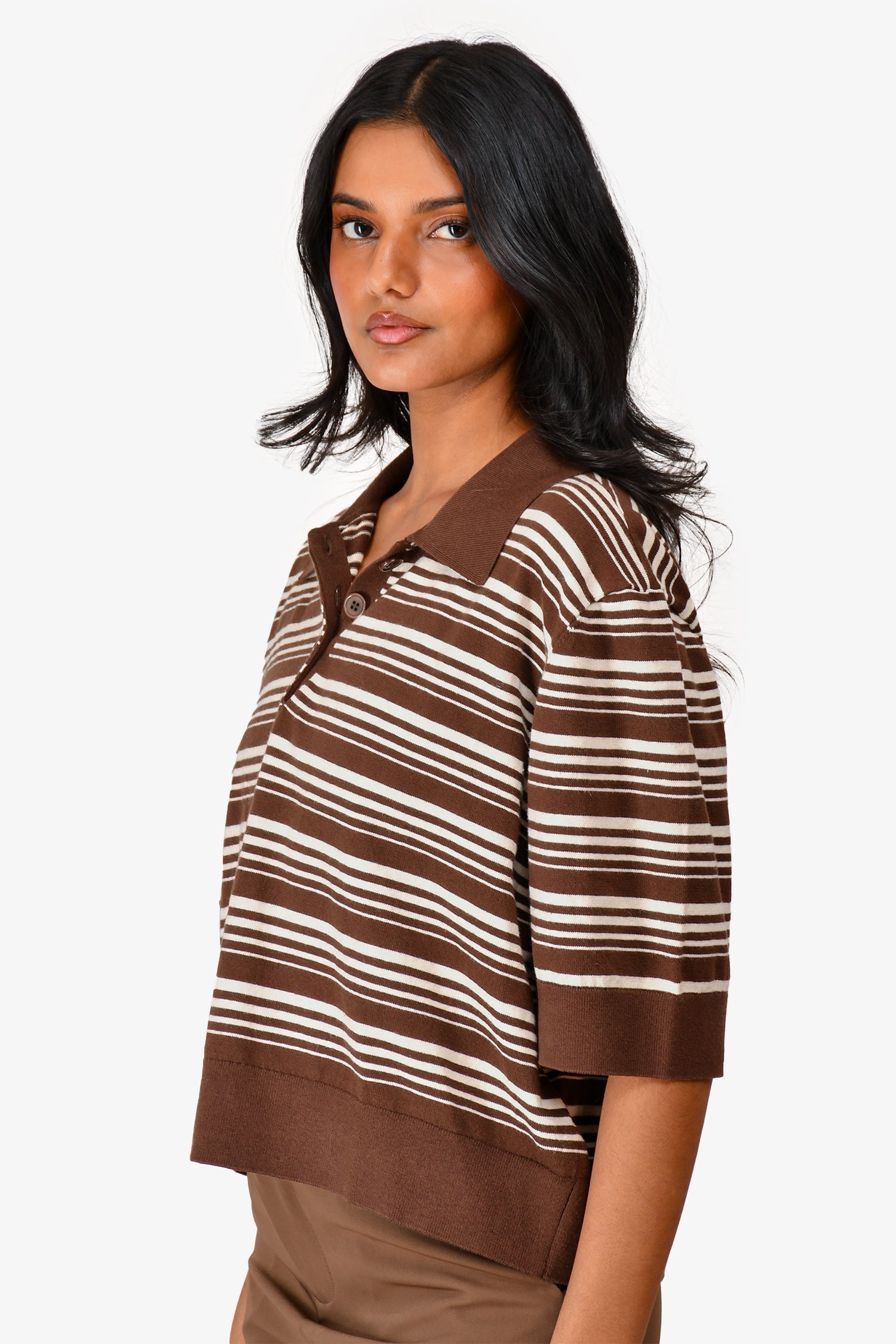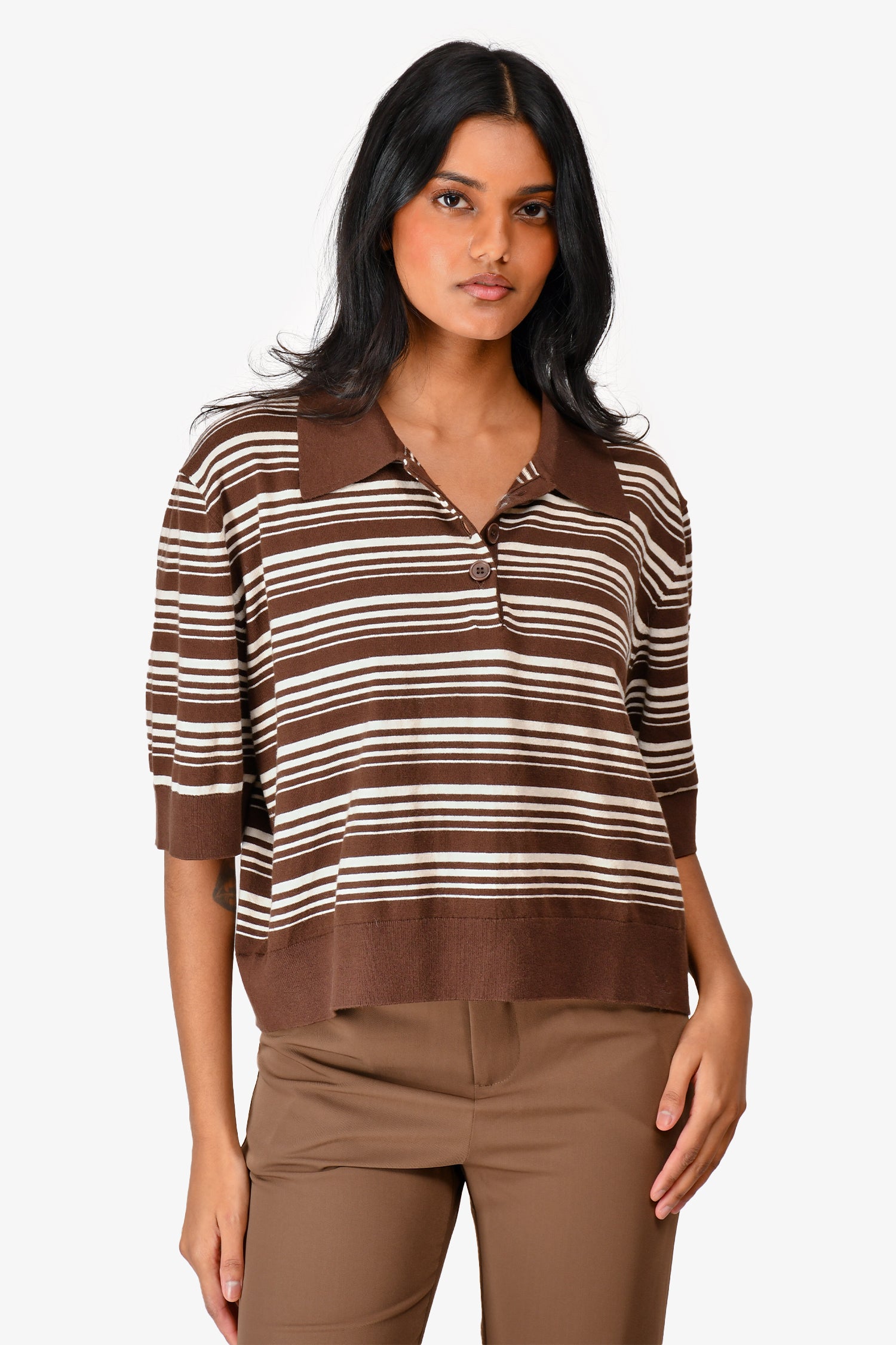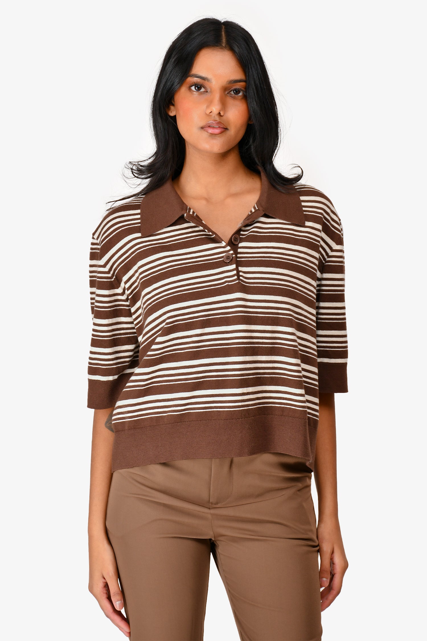 Refresh availabilityLovers + Friends Brown & White Sheeva Stripe Polo. Button-up polo collar. Tonal stitching.