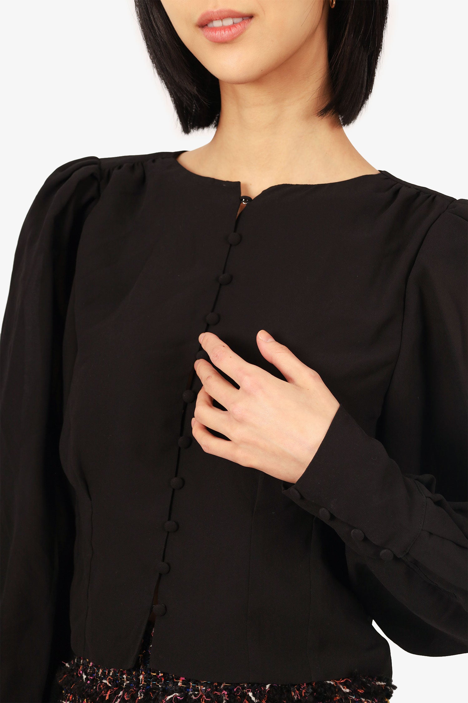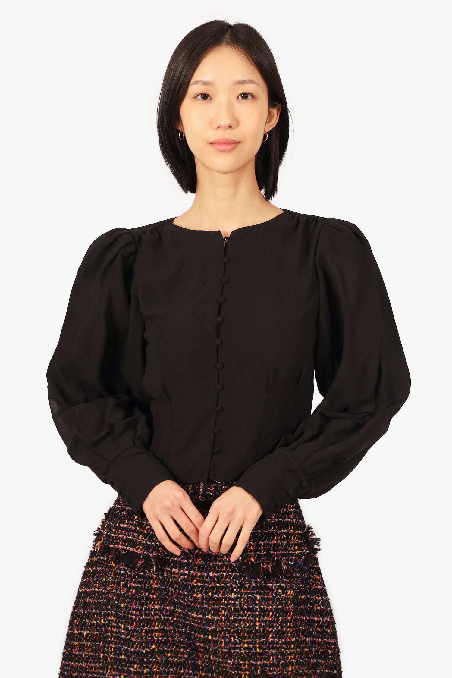 Refresh availabilityLPA Black Mesh Balloon Sleeve Blouse. Front button-up closure. Round-neckline. Button-up sleeve cuff closure. Built-in shoulder pads. Tonal stitching.