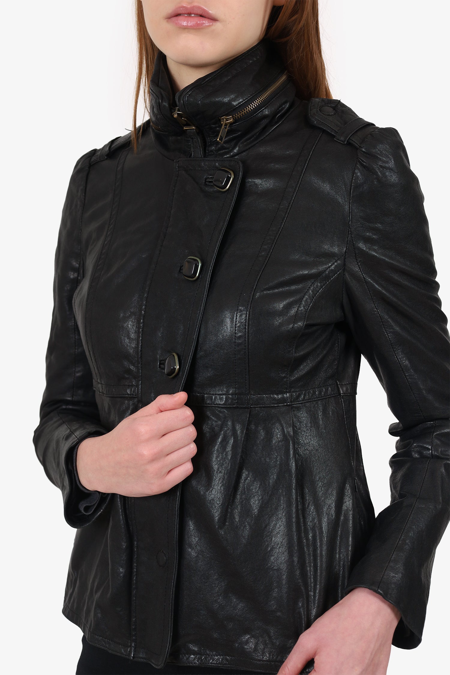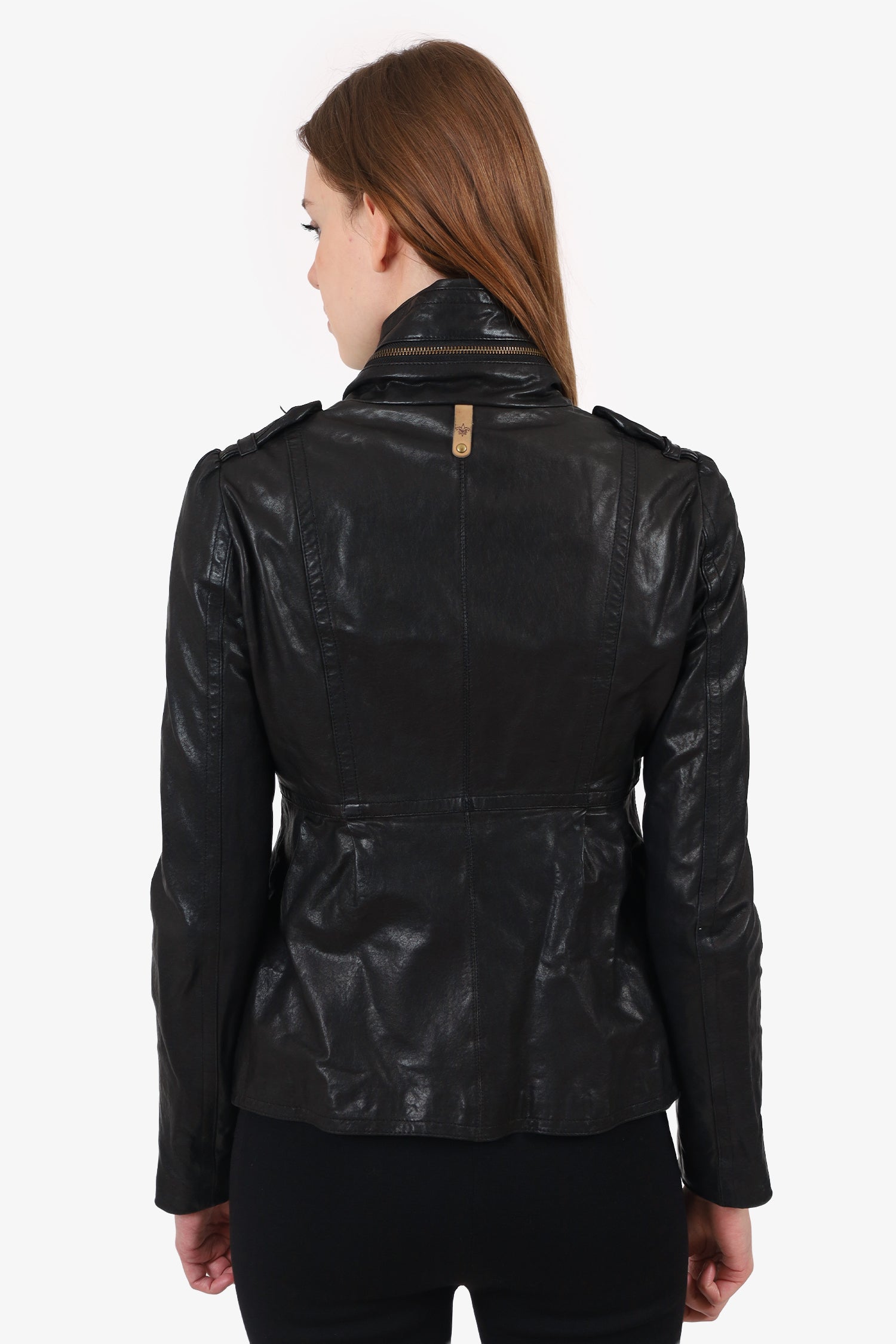 Refresh availabilityMackage Black Leather Zip-Up Jacket. Pull-on. High neckline with retractable hood. Front zip with snap and button-up closure. Snap button-up closure to shoulders. 2 exterior side zip-up pockets. Lined interior. Brass-tone hardware. Tonal stitching.