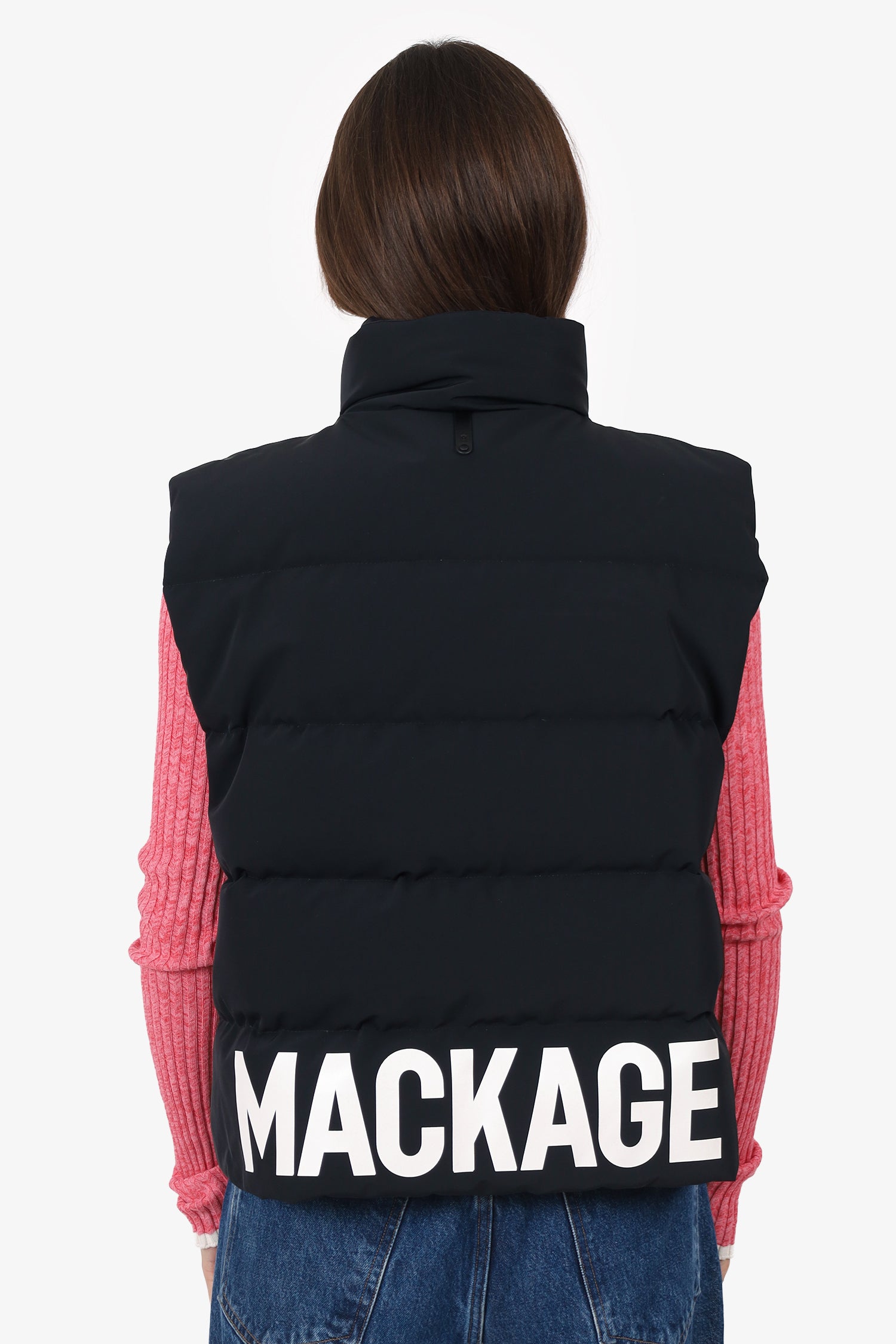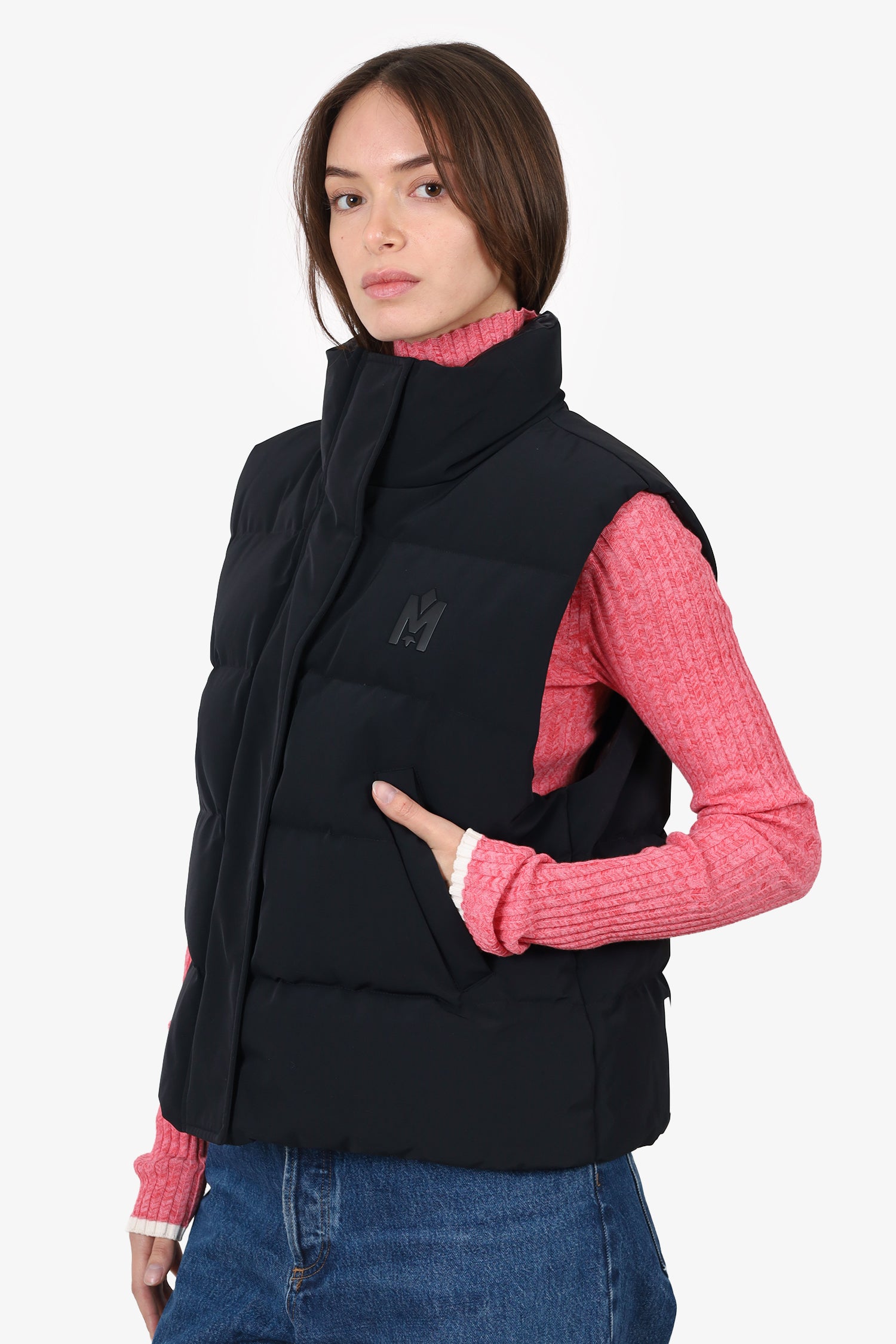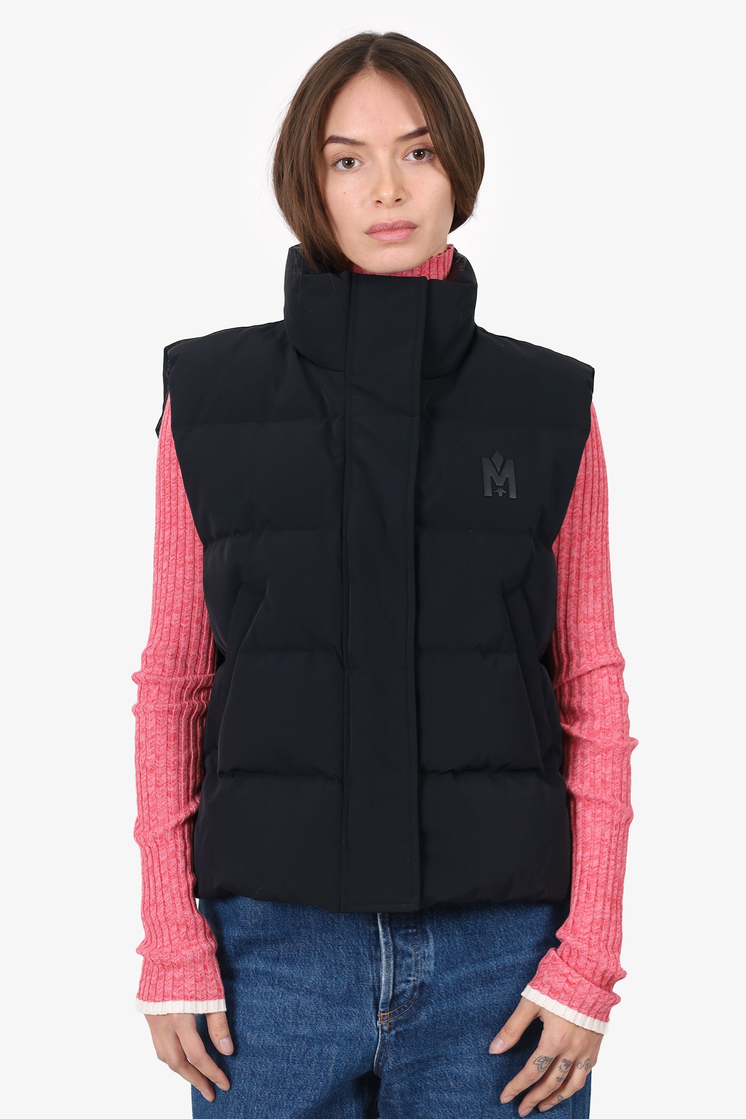 Refresh availabilityMackage Black Tech Down Vest. Pull-on. High neckline. Front zip-up with velcro closure. 2 exterior side zip-up pockets. Tonal stitching.