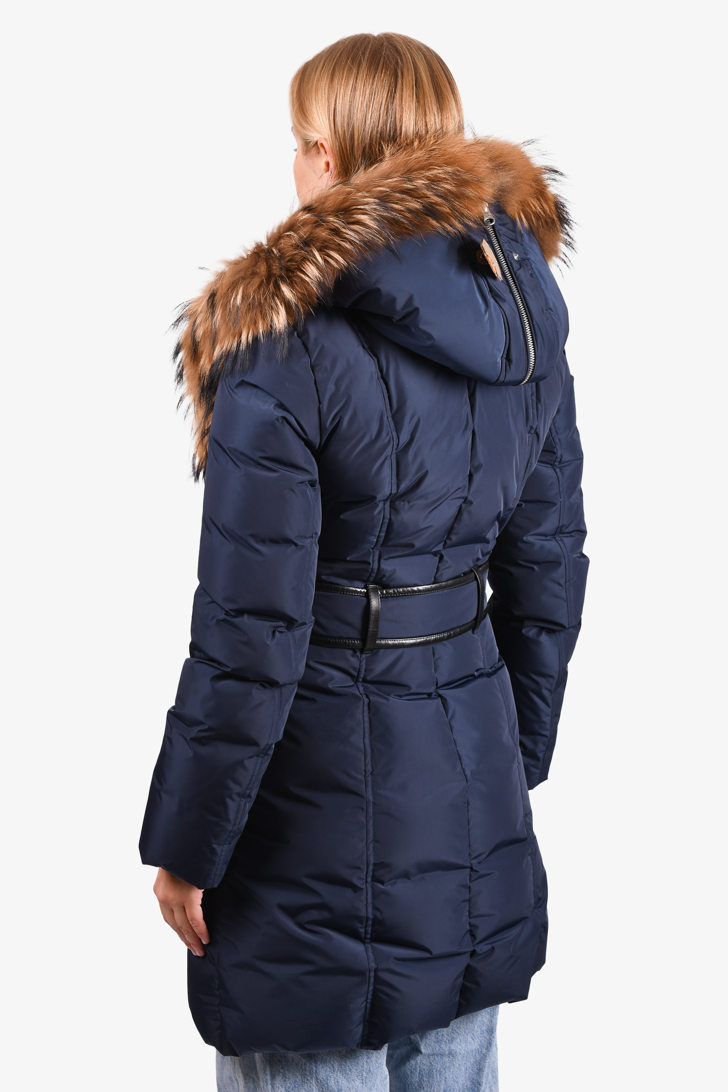 Refresh availabilityMackage Navy Blue Down Puffer Racoon Fur Coat. Front zip closures. Front zip pockets. Lined. Tonal stitching..