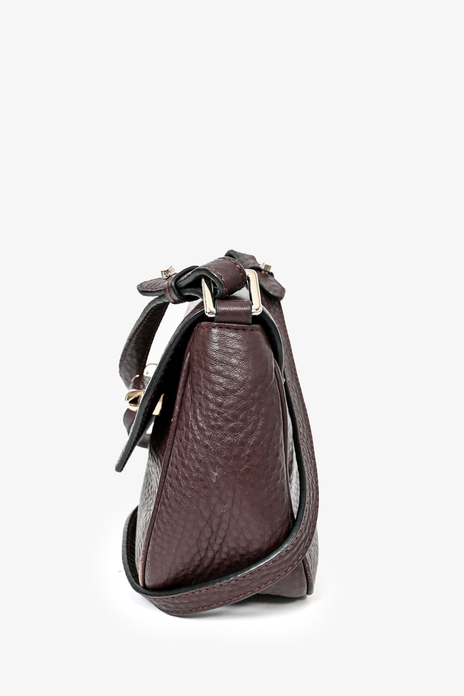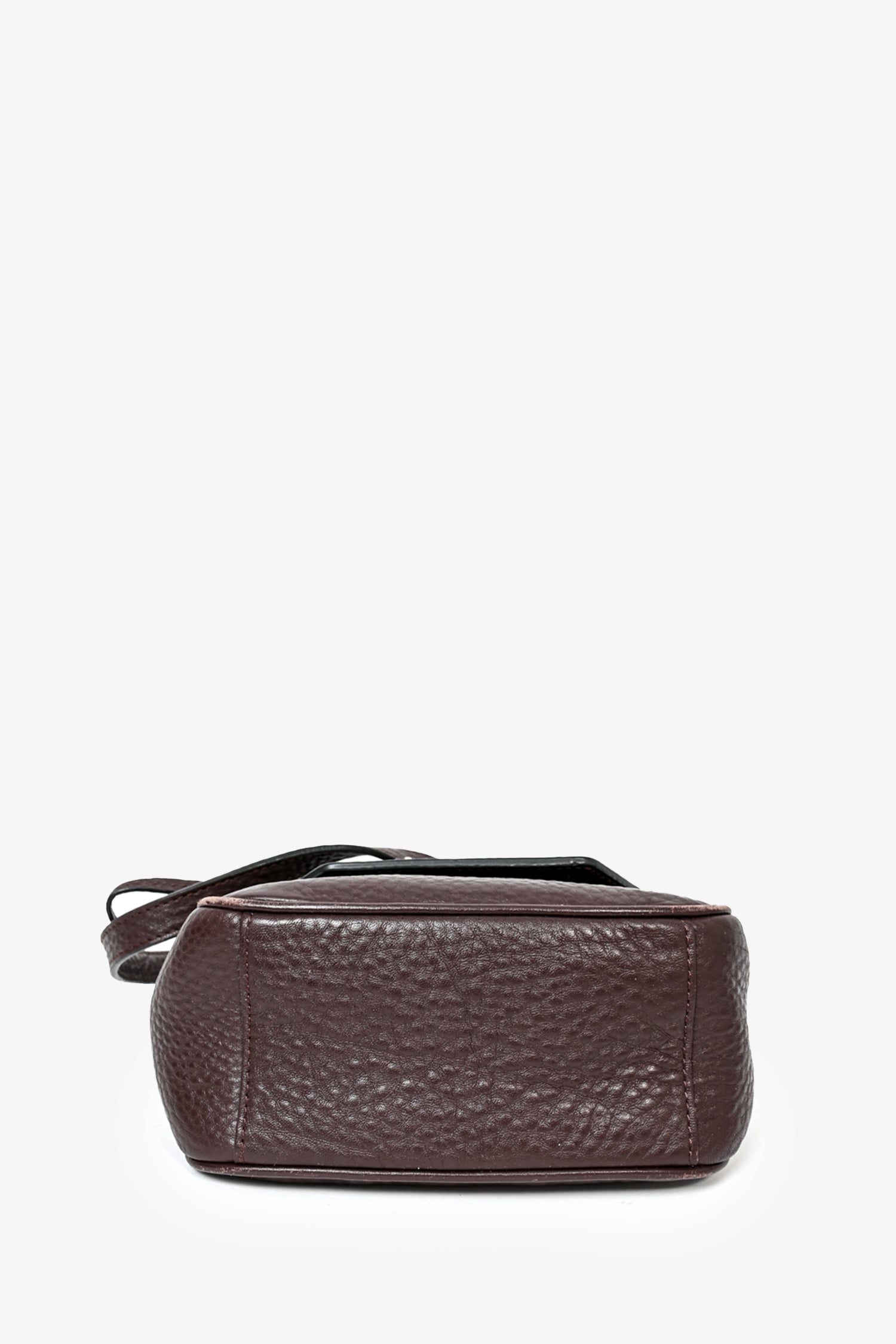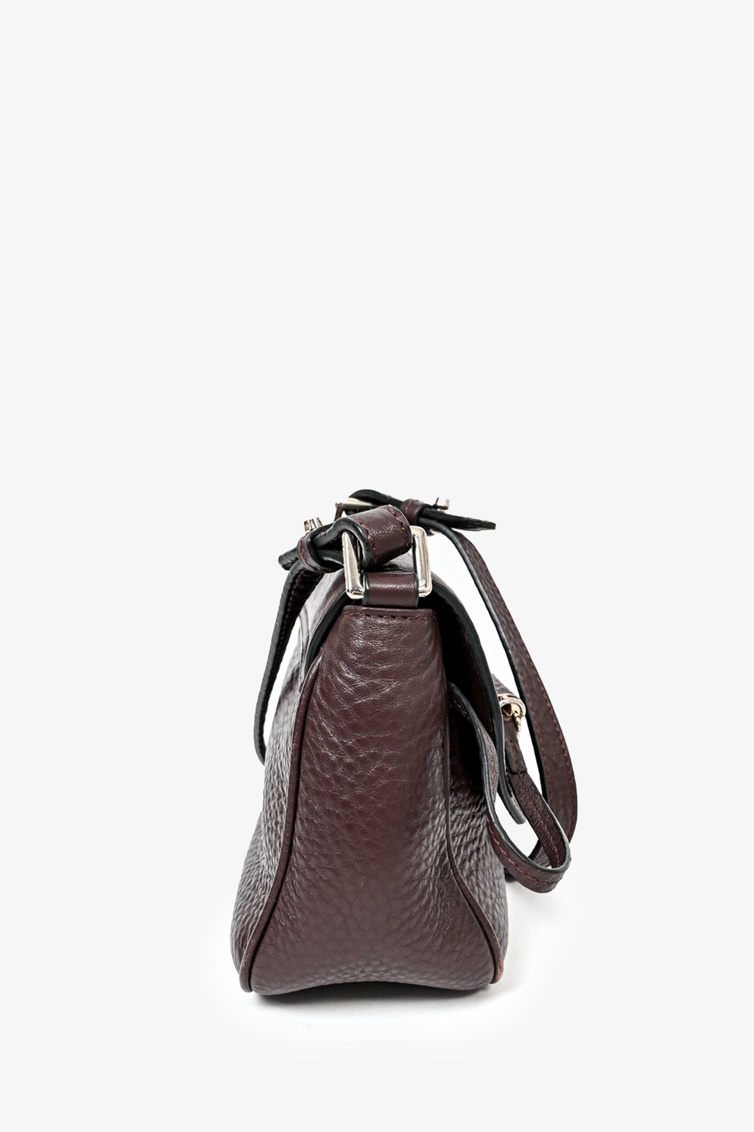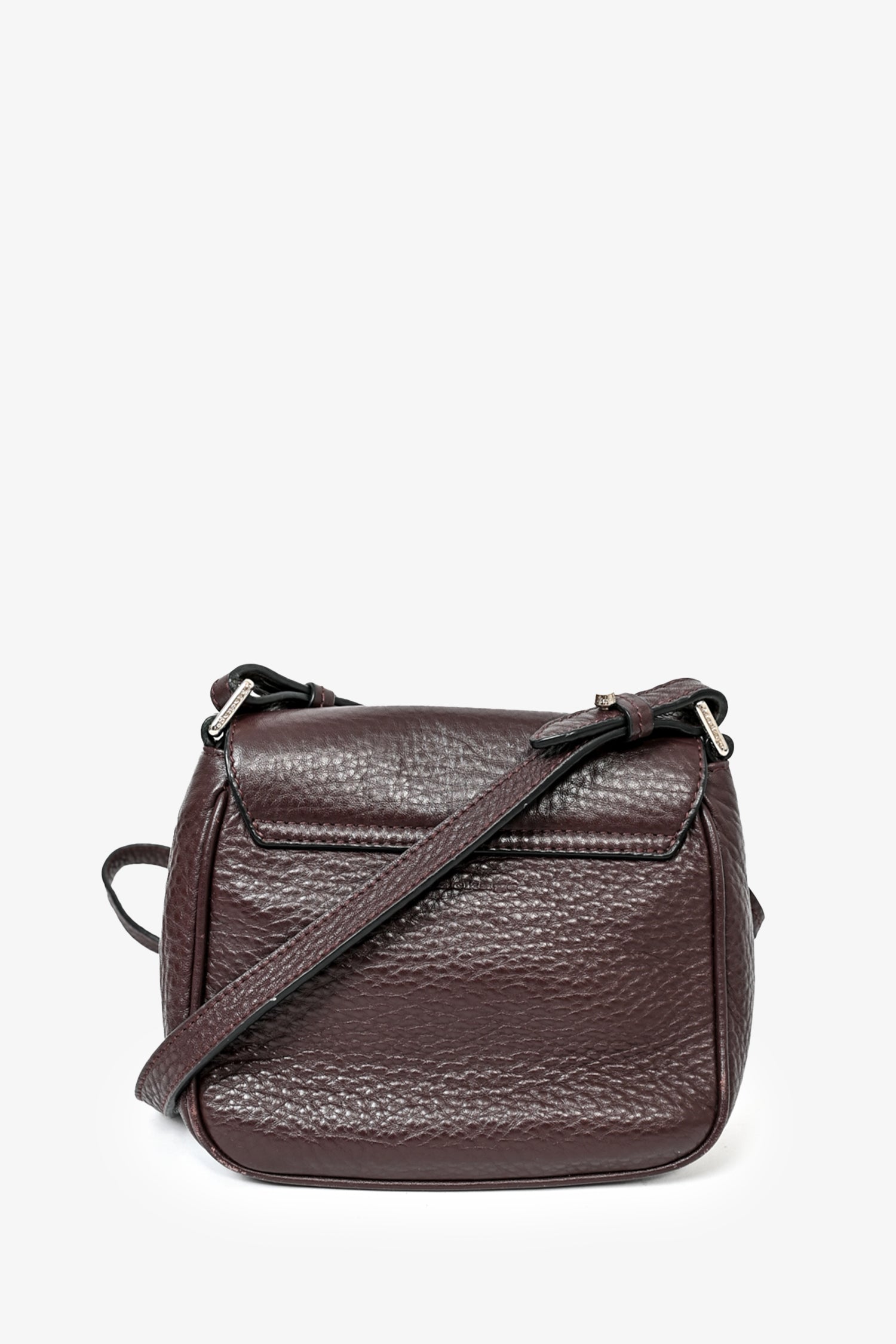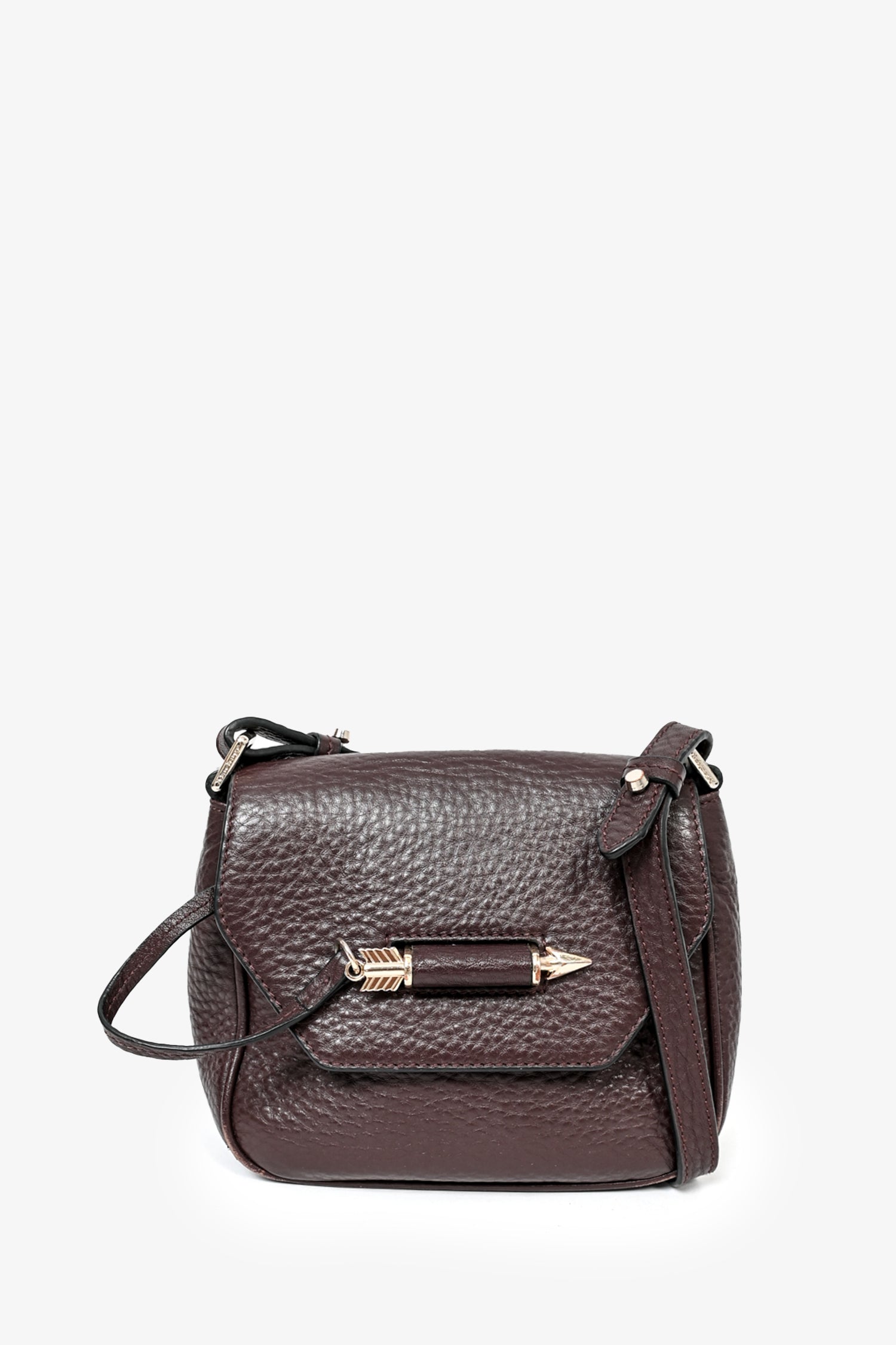 Refresh availabilityMackage Purple Grained Leather Arrow Crossbody Bag. Front fold-over flap with push tab closure. Silver-toned hardware. Interior wall slip pocket. 2 interior card slots. Tonal stitching