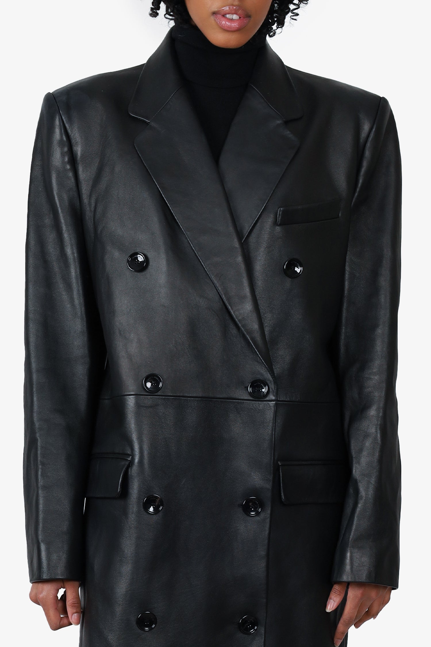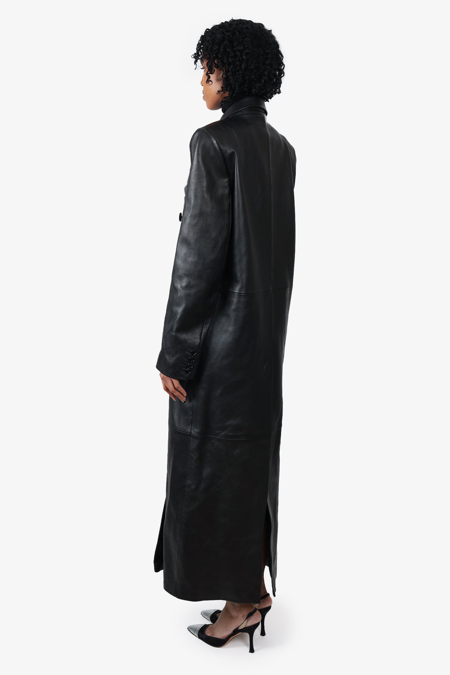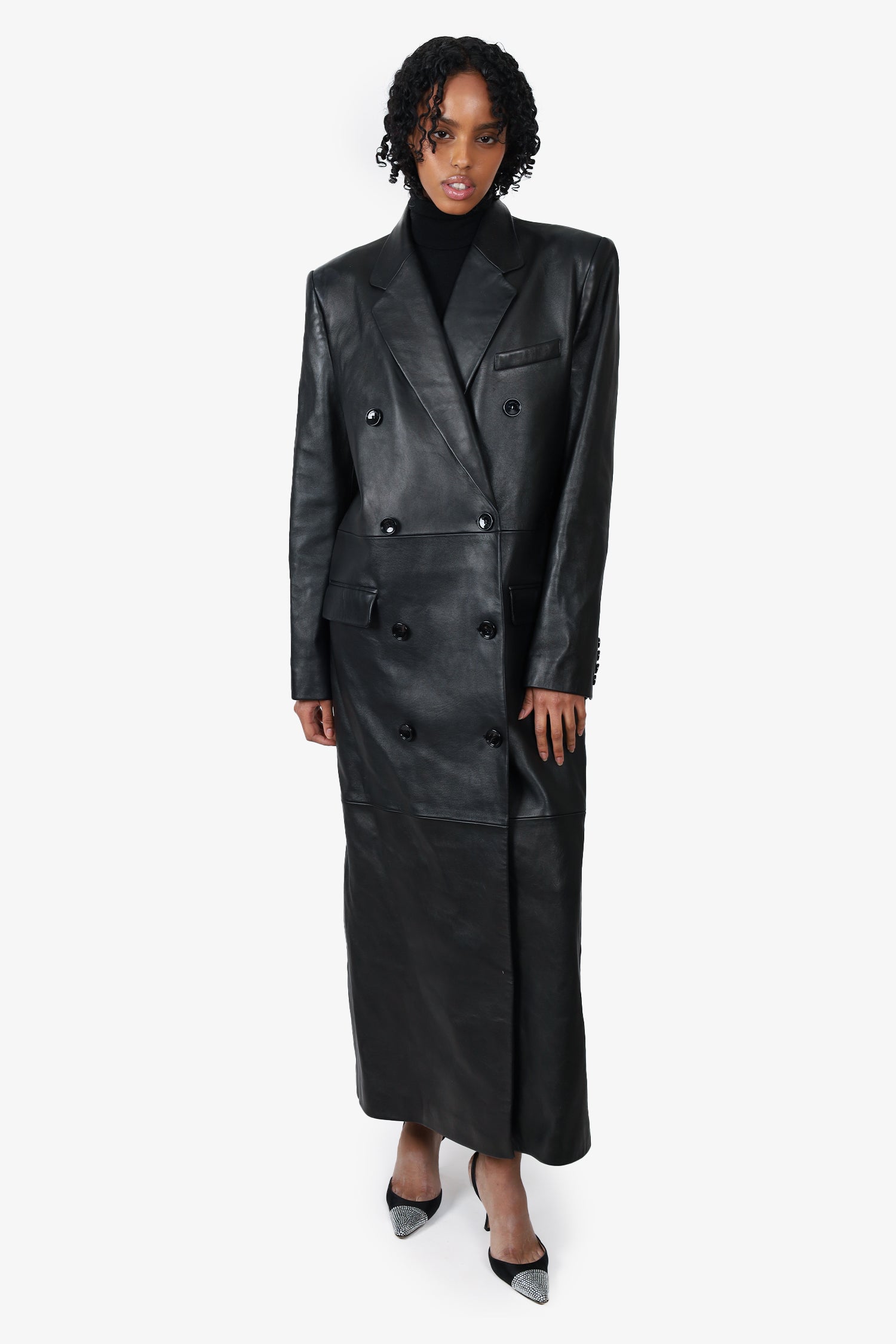 Refresh availabilityMagda Butrym Black Leather Double Breasted Long Coat. Collared neckline. Front button up closure. 3 front open pockets. Button detailing on cuffs. Interior lining. 2 Interior pockets with button closure. Tonal stitching.