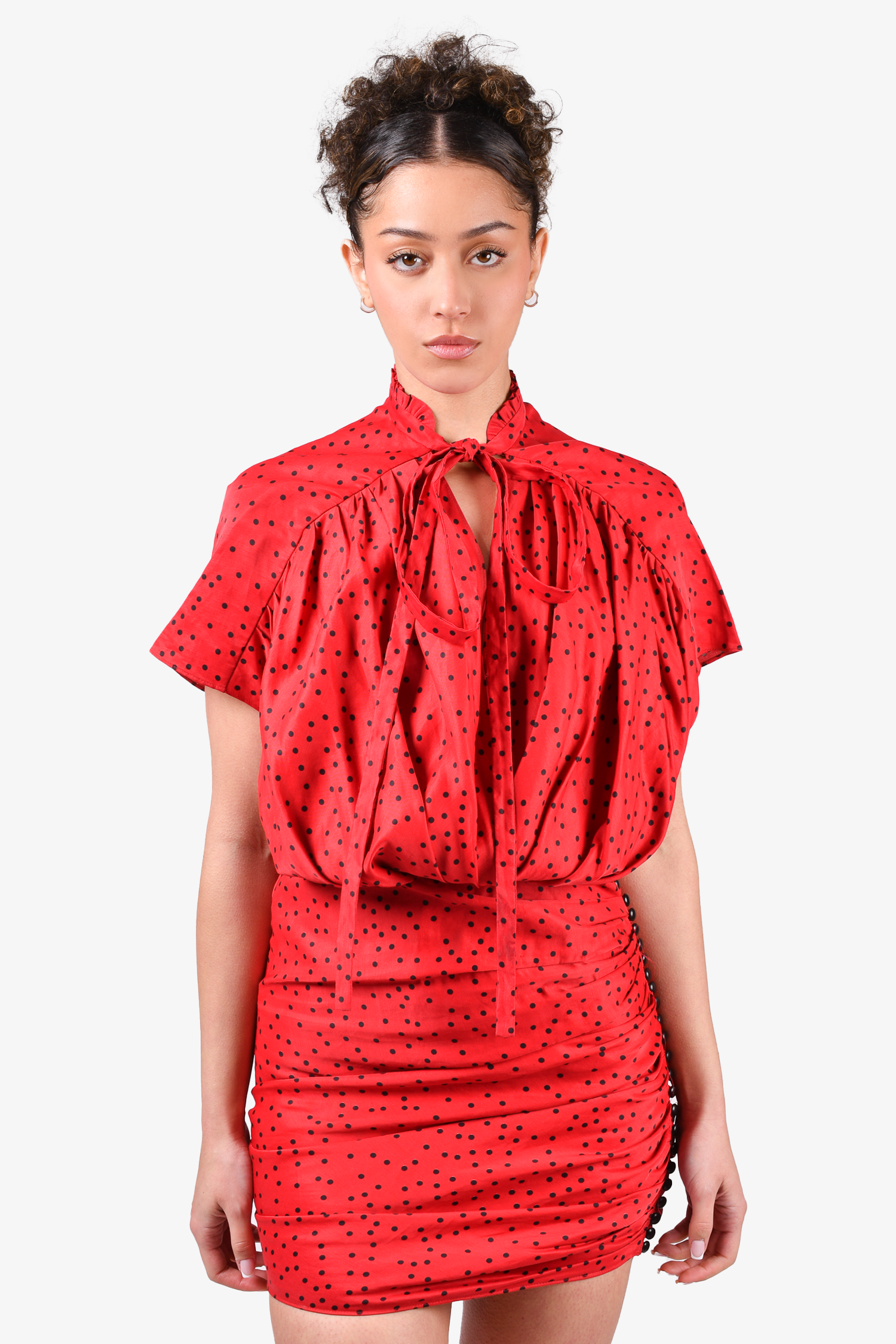 Refresh availabilityMagda Butrym Red/Black Polka Dot V-Neck Ruched Mini Dress. Side zip closure. Unlined. Tonal stitching.