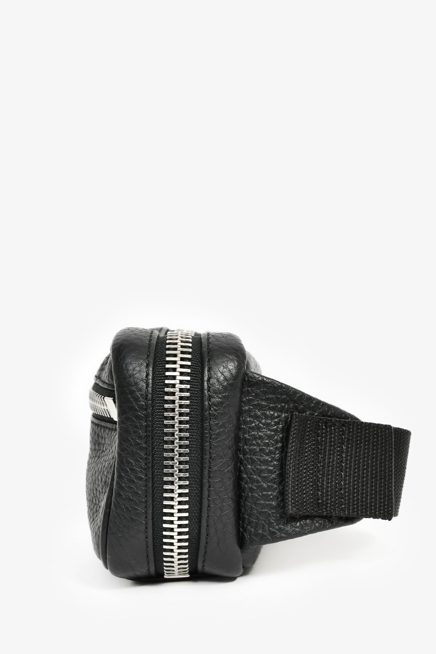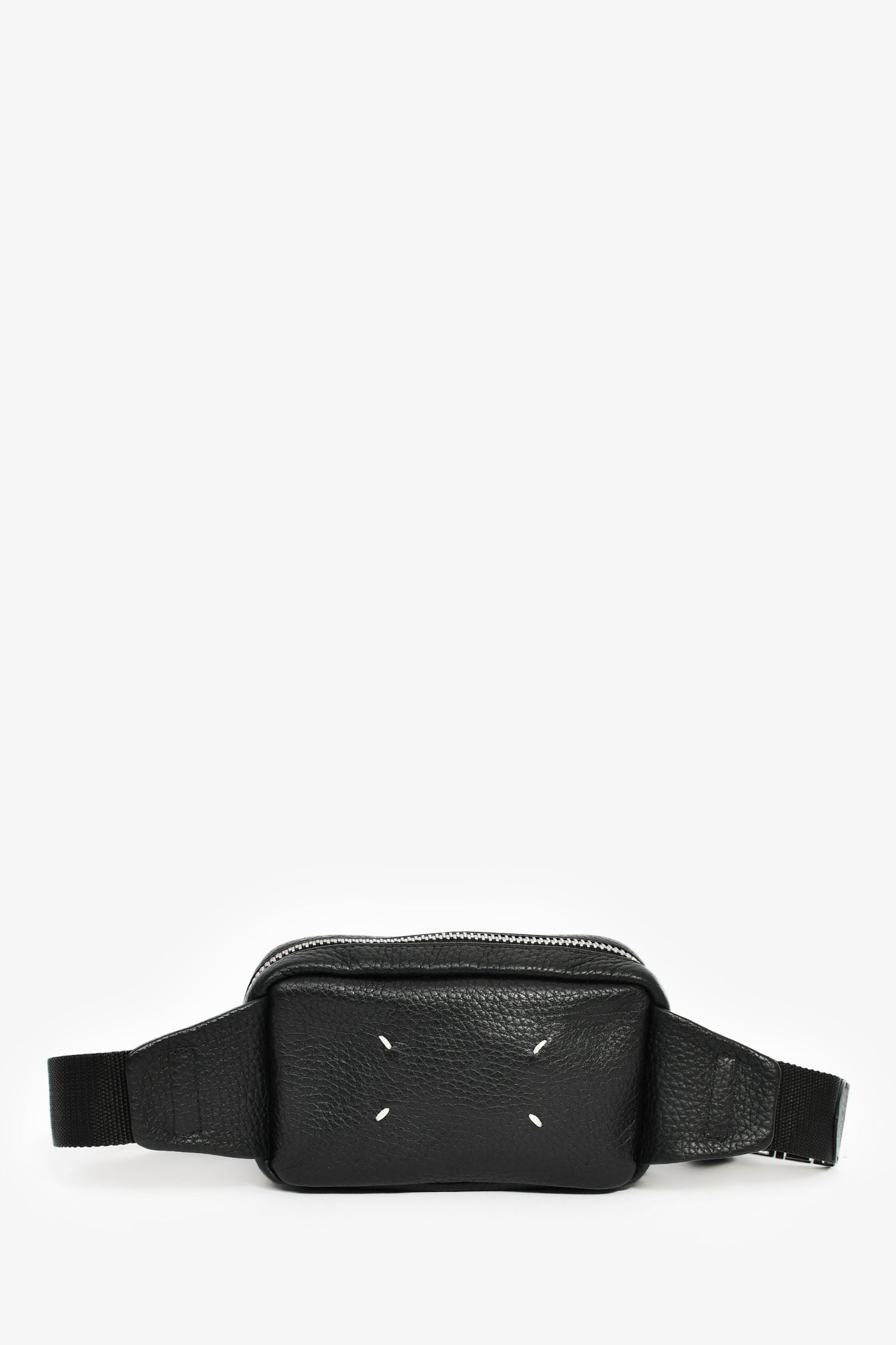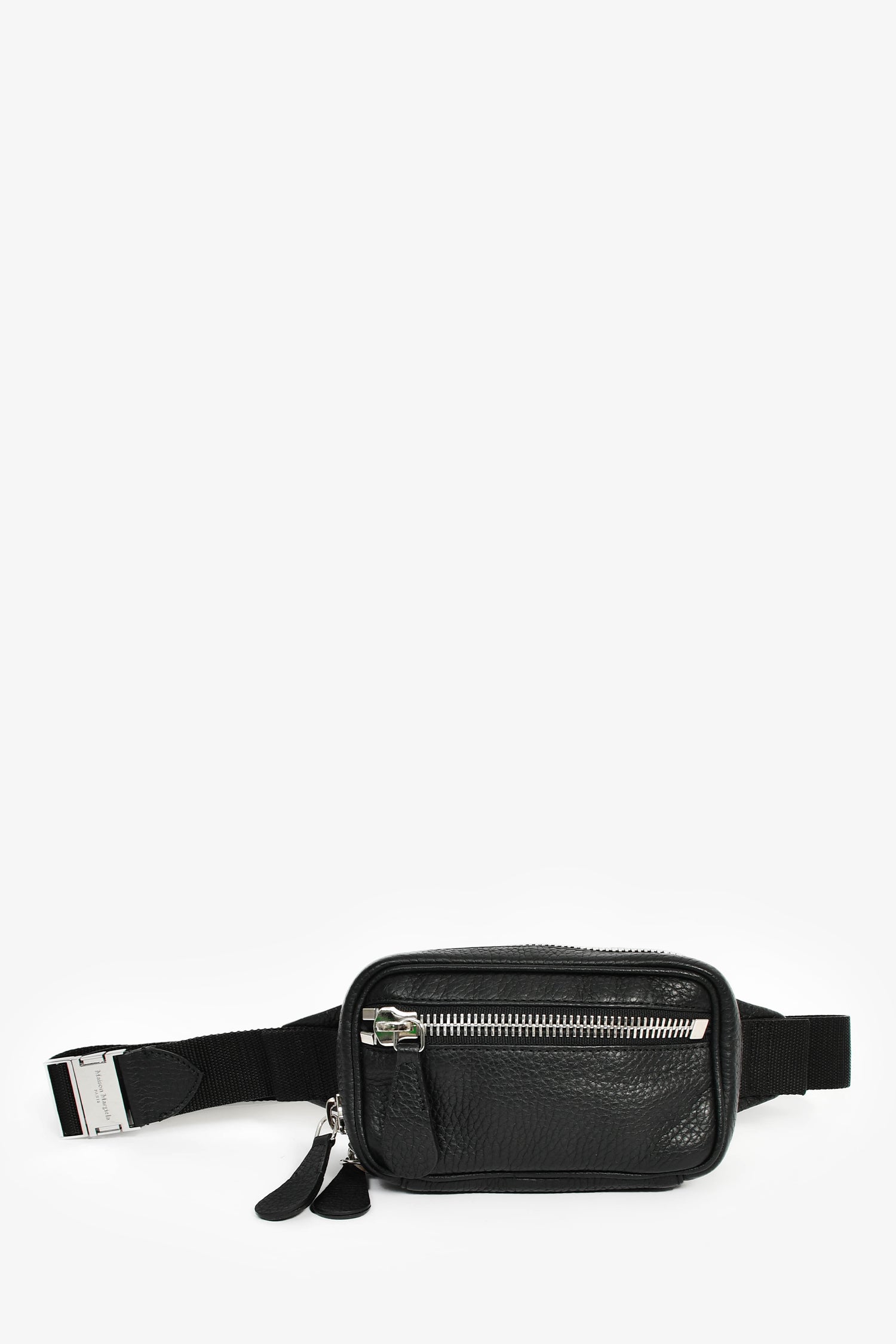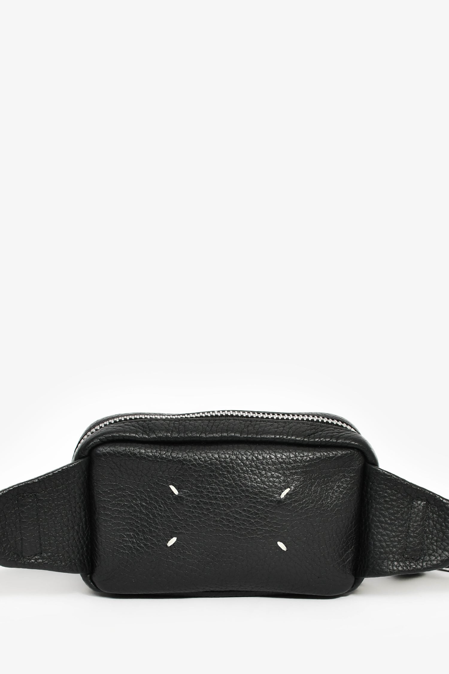 Refresh availabilityMaison Margiela Black Leather 'M11' Belt Bag. Top zip closure. Webbed belt strap. Lined nylon interior with a mesh pocket. Silver-tone hardware. Contrast and tonal stitching.