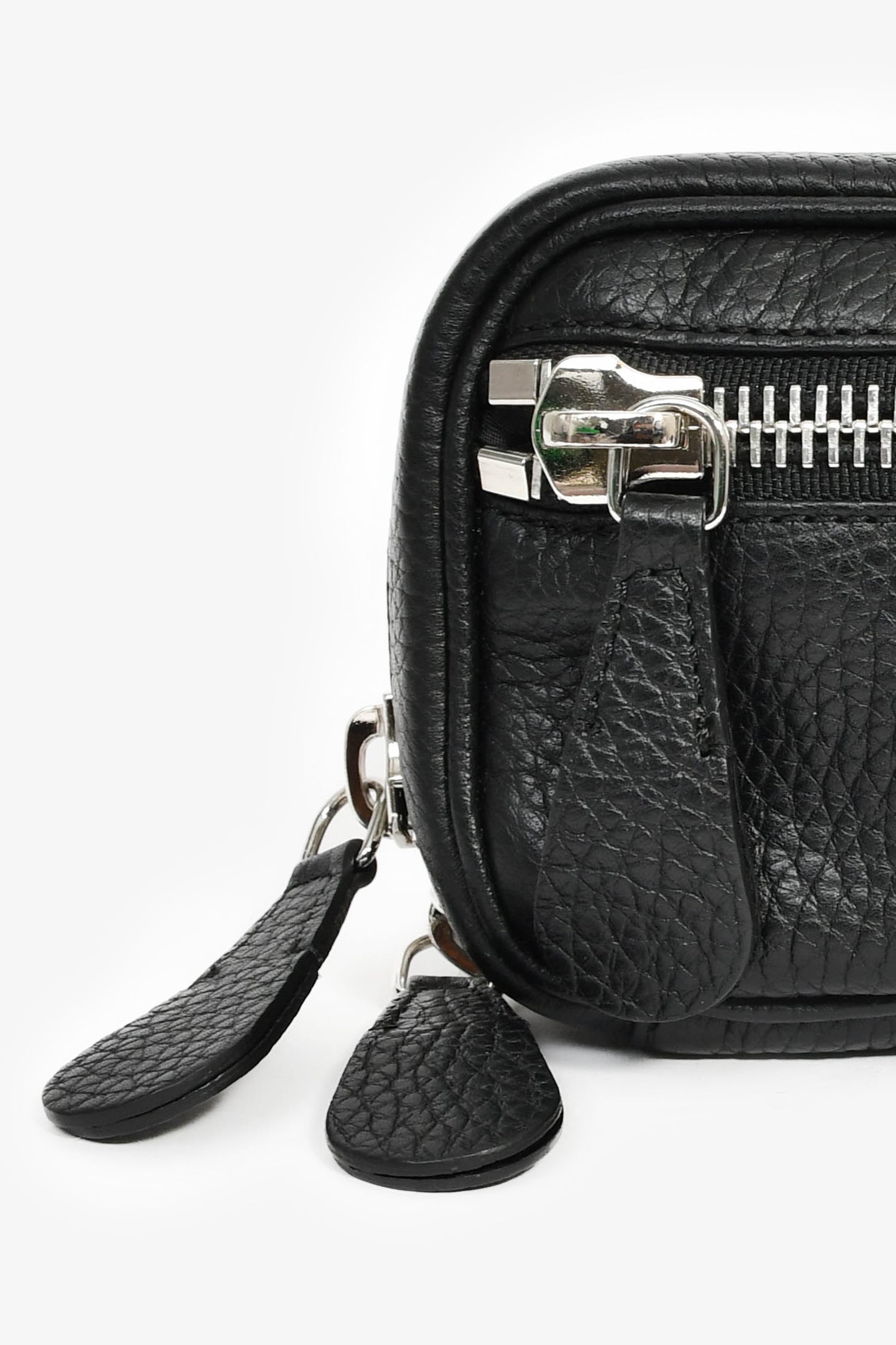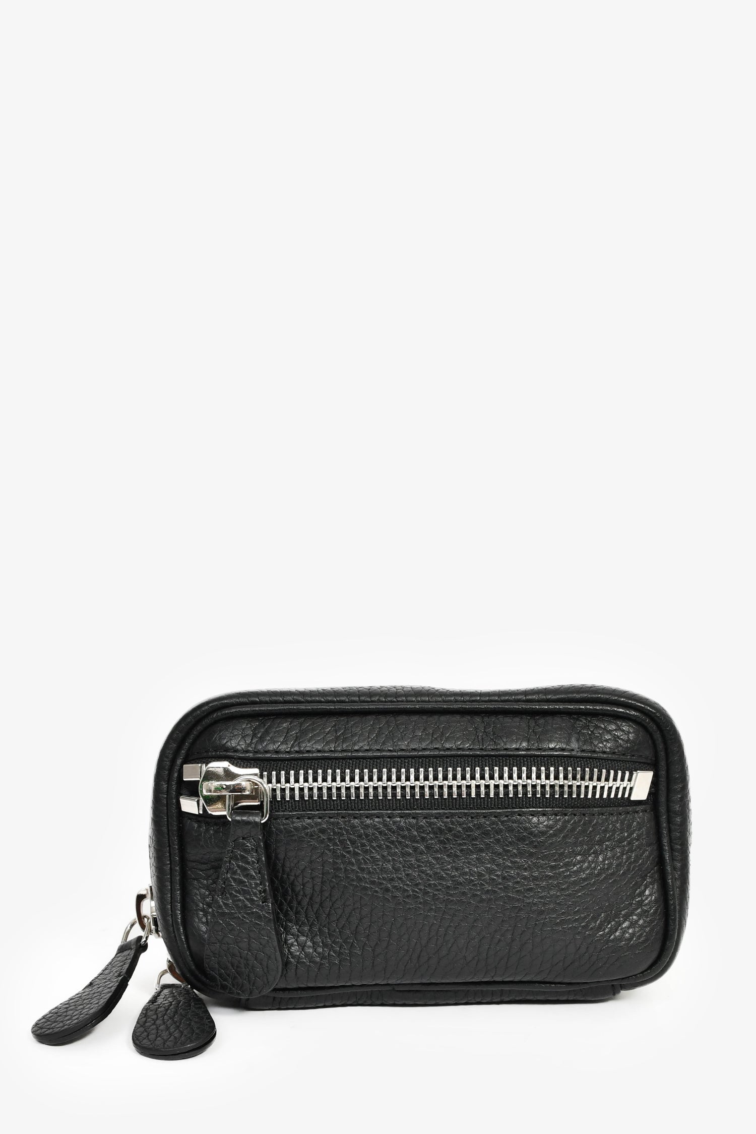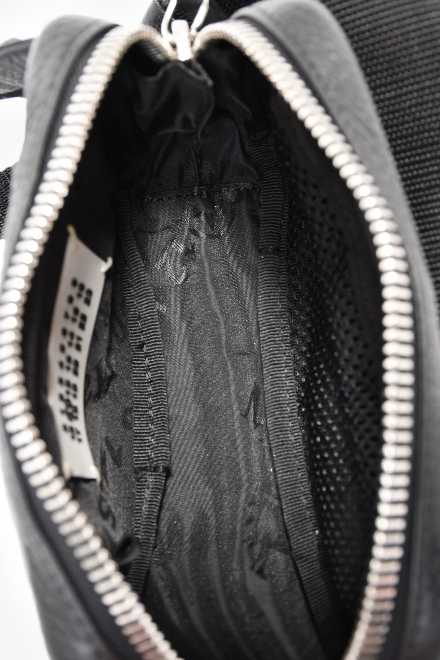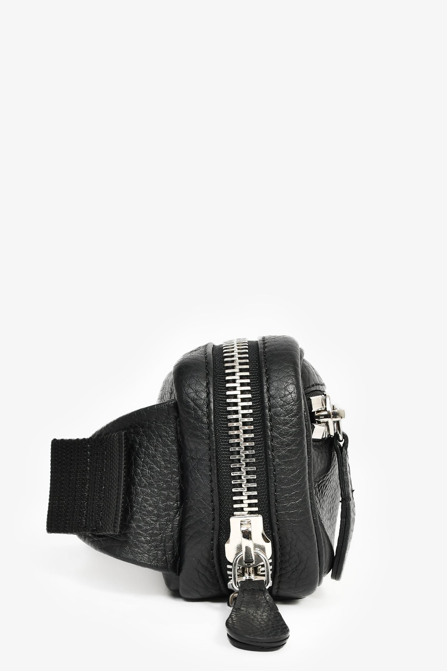 Refresh availabilityMaison Margiela Black Leather 'M11' Belt Bag. Top zip closure. Webbed belt strap. Lined nylon interior with a mesh pocket. Silver-tone hardware. Contrast and tonal stitching.