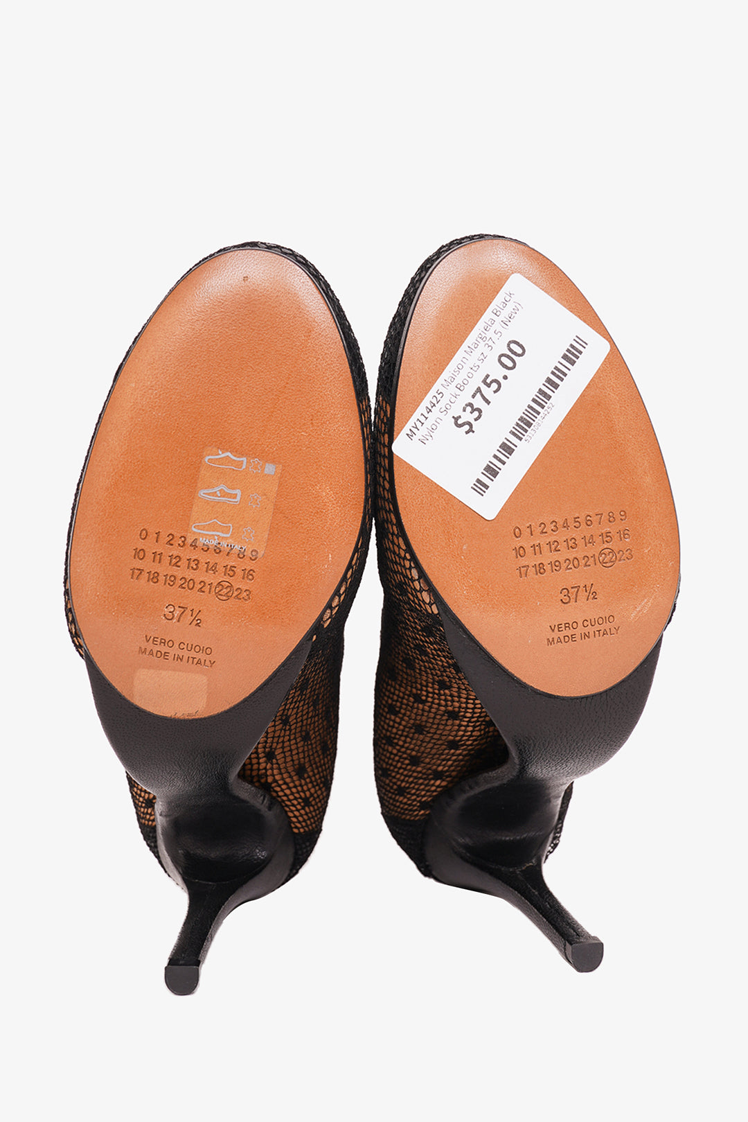 Maison Margiela Black Nylon Sock Boots. Round toe. Stiletto heel. Tonal stitching.