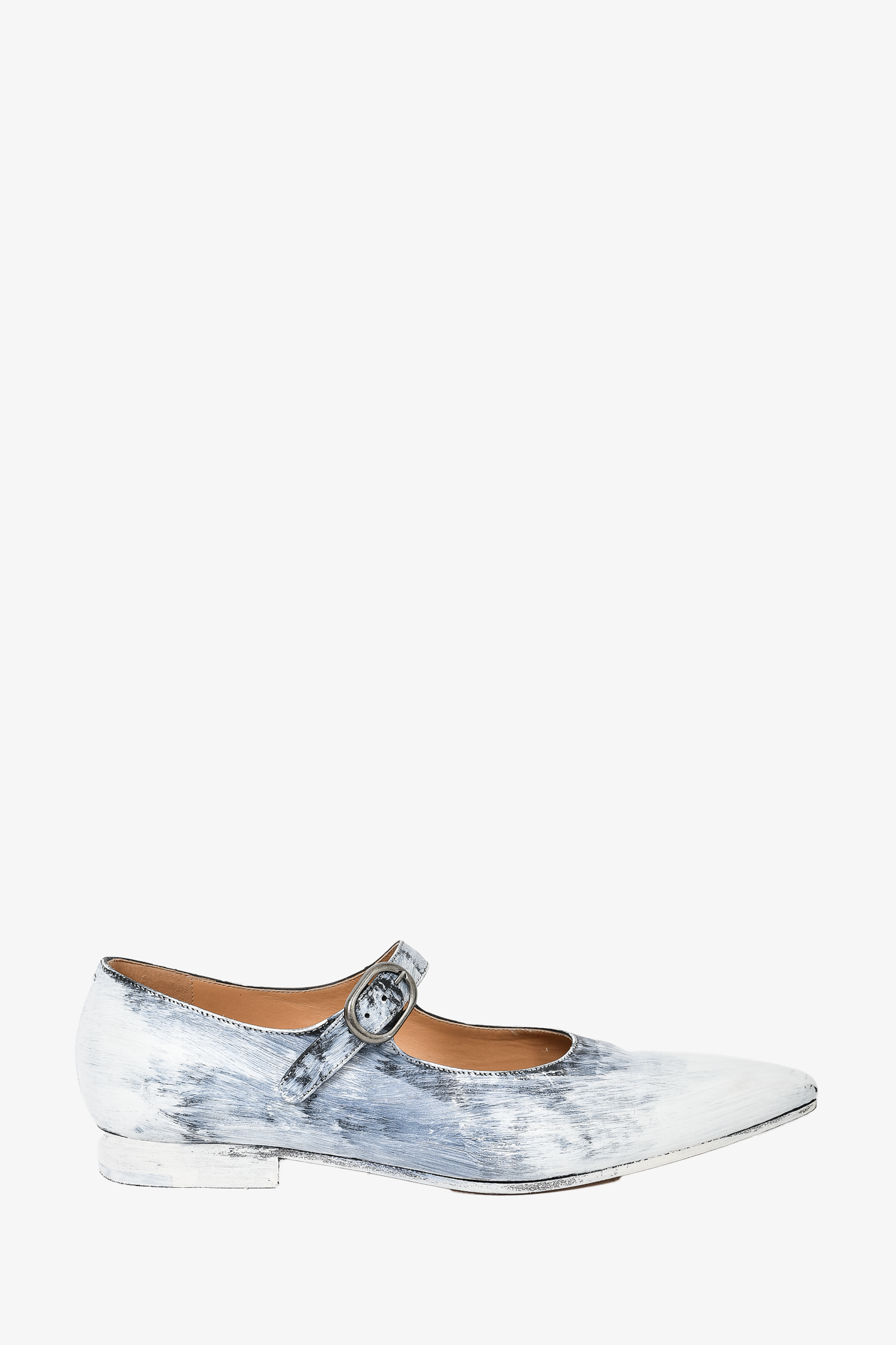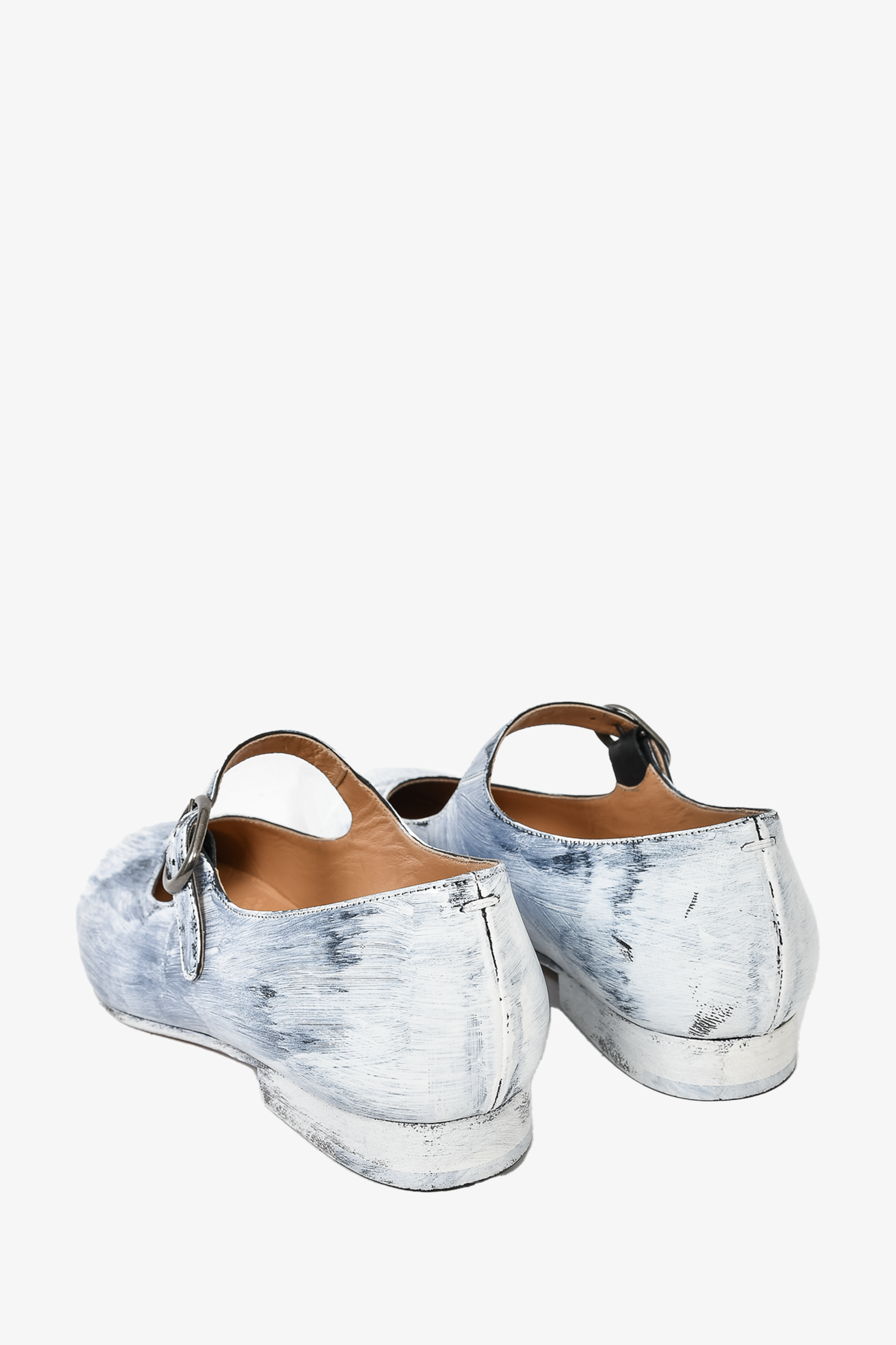 Refresh availabilityMaison Margiela Blue Painted White Ballet Flats. Adjustable front strap with buckle closure. Chrome-tone hardware. Stacked heel. Tonal stitching.