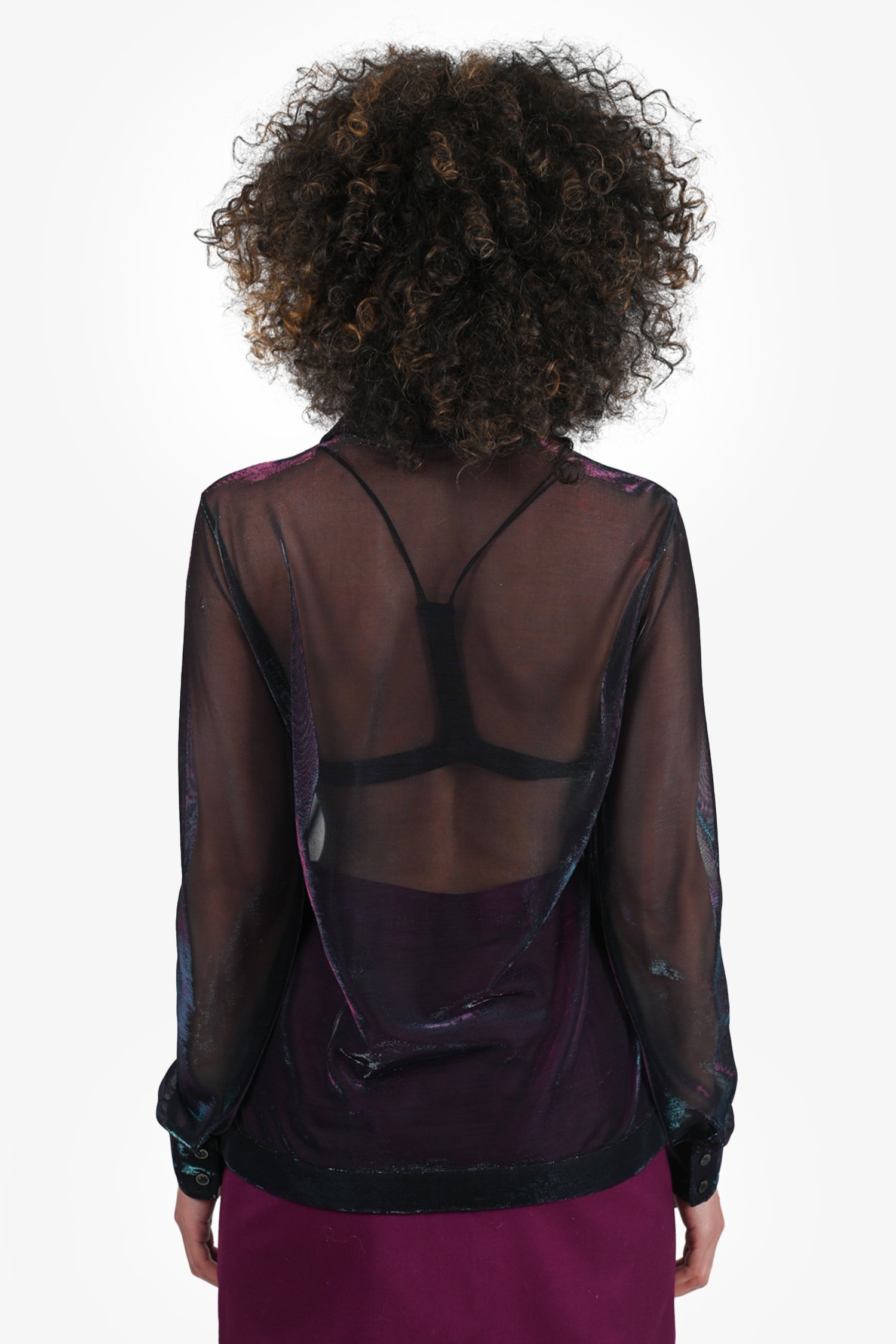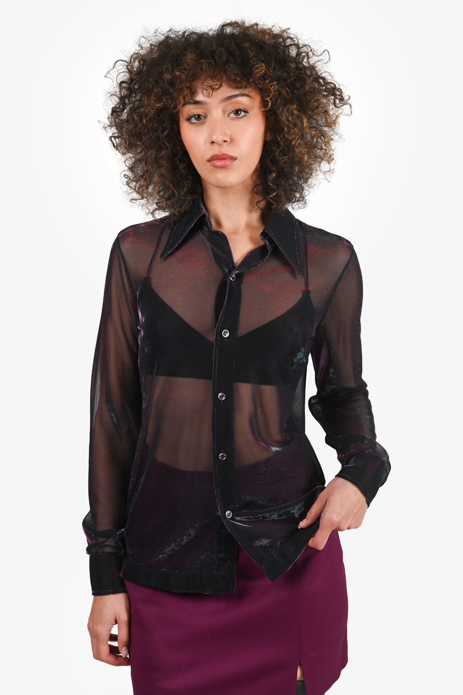 Refresh availabilityMaison Margiela Blue Iridescent Mesh Button-Down Top. Sheer. Tonal stitching.