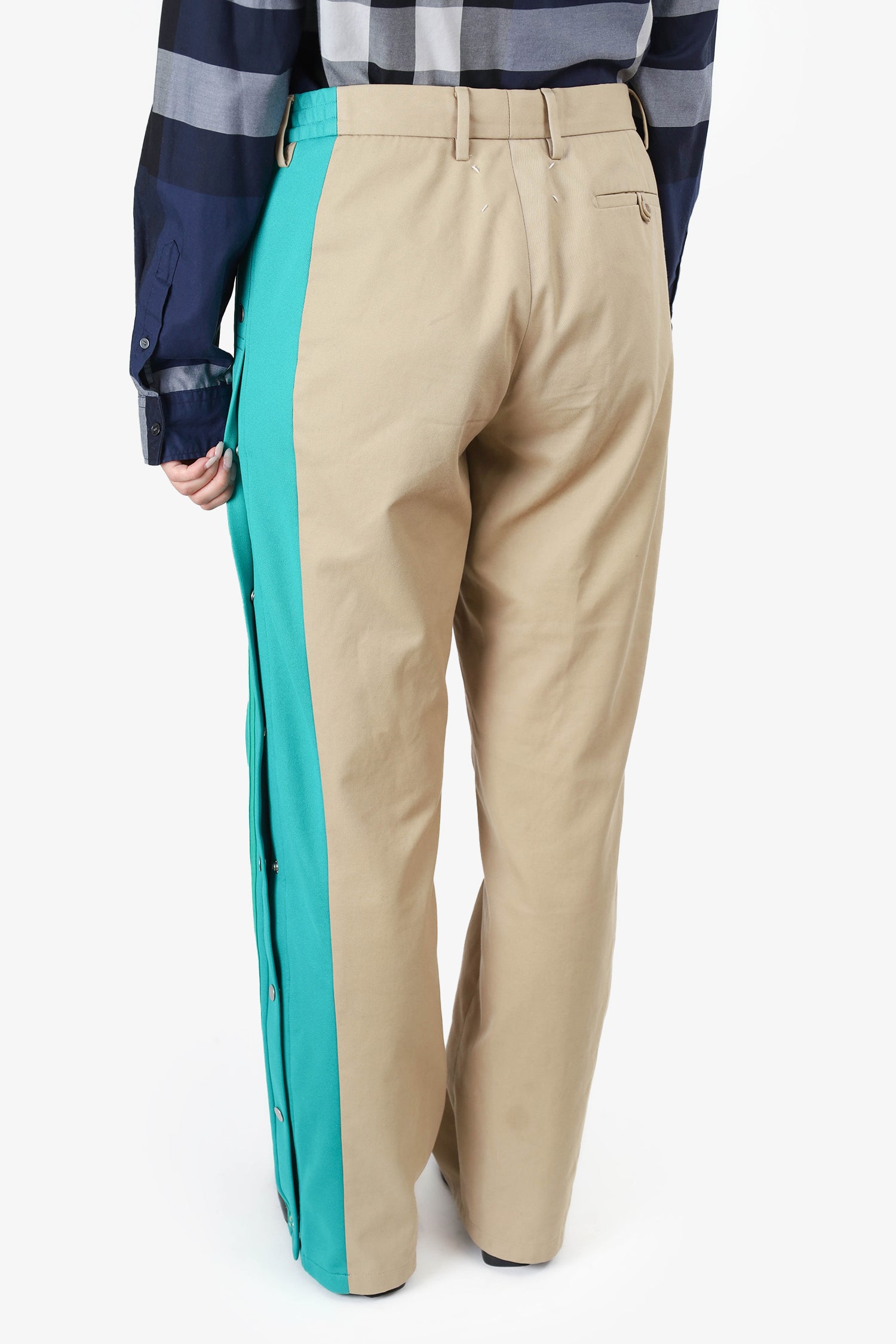 Refresh availabilityMaison Margiela Khaki/Blue Striped Pants. Front button and hook closure. Contrast trim down left leg with snap buttons. Silver-tone hardware. Unlined. Tonal stitching.