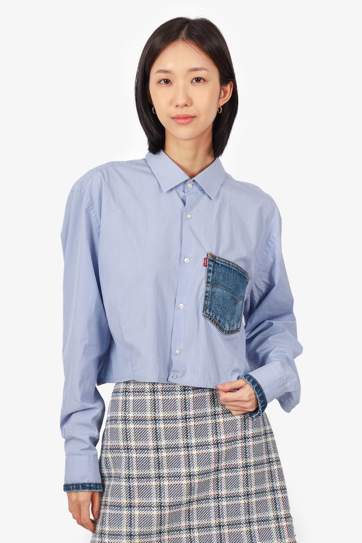 Refresh availabilityMaison Perenne x Levi 'Creative' Cropped Shirt. Collared-neckline. Front button-up closure; single snap button closure at the bottom. Single front exterior denim slip pocket. Denim-edged cuffs with single button closure. Tonal stitching.