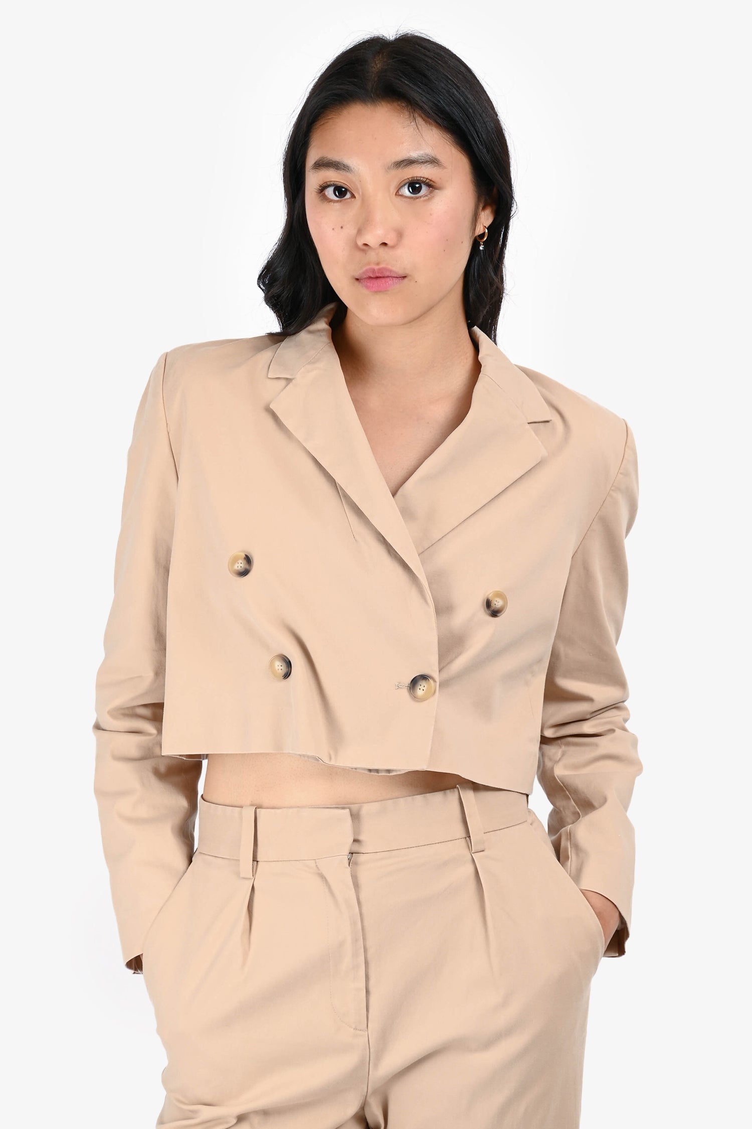 Refresh availabilityMaje Beige Double Breasted Cropped Blazer + Pants Set. Blazer: Notched lapels. Double-breasted front button closure. Cropped silhouette. Long sleeves with buttoned cuffs. Pants: Zip and hook closure. Tonal stitching.