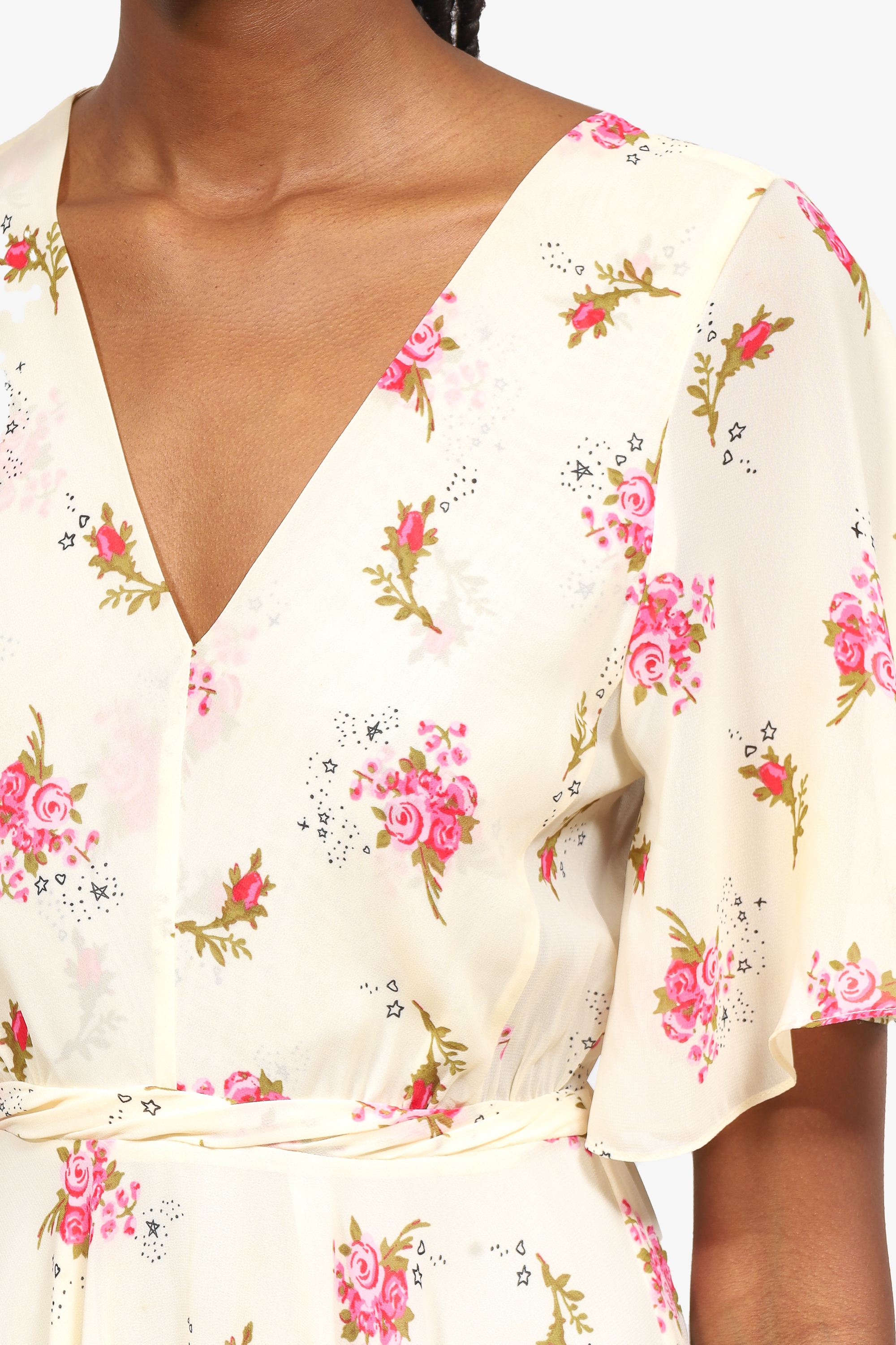 Refresh availabilityMaje Beige Floral Print Short Sleeve Midi Dress. V-neck neckline. Back cut-out. Back zipper closure. Elastic waistband. Slip skirt under layer. Tonal stitching.