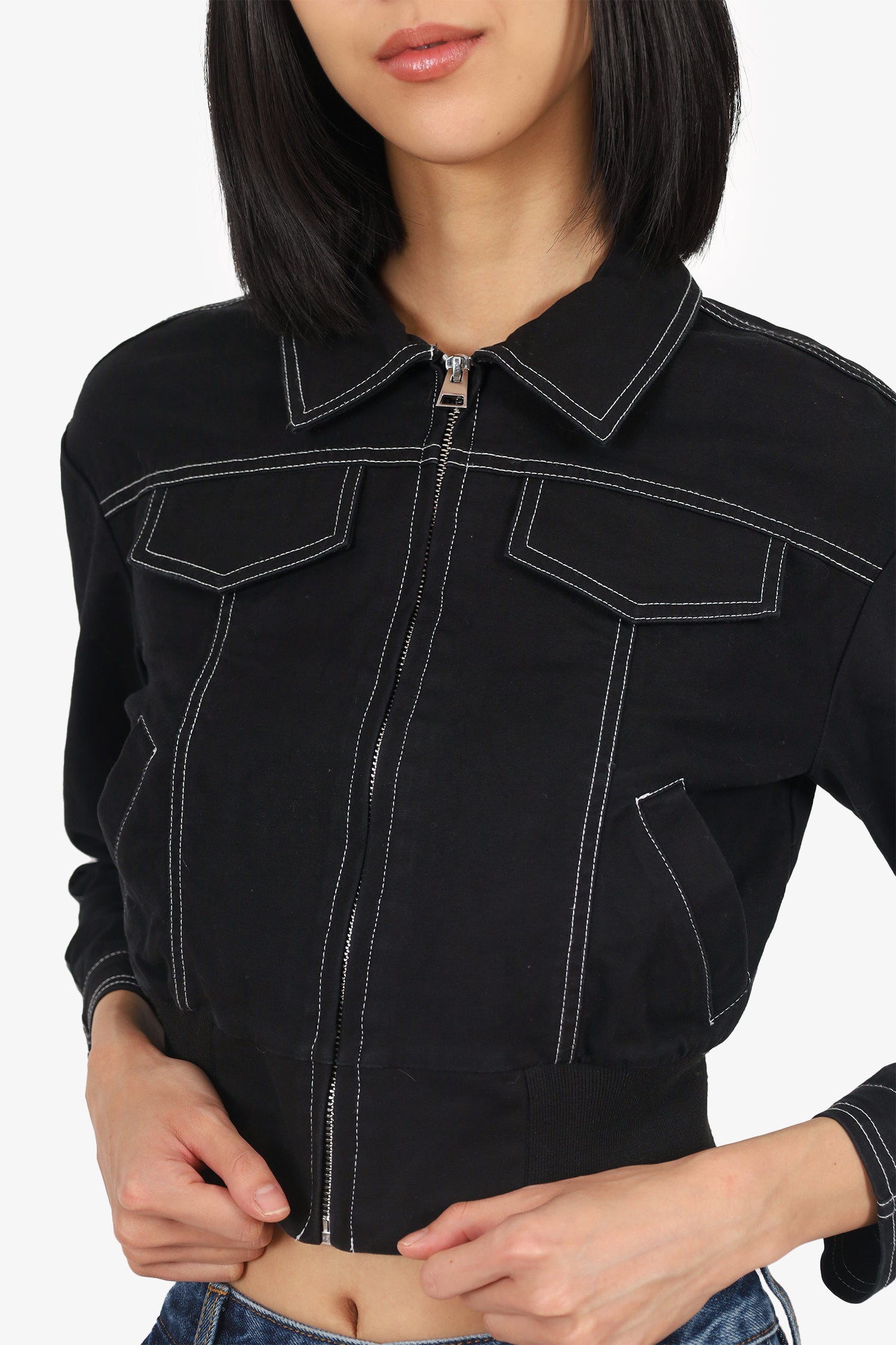 Refresh availabilityMaje Black Contrast Stitch Zip-up Jacket. Pull-on. Collared-neckline. Front zip closure. 4 exterior pockets; 2 faux chest fold-over flaps, and 2 front slip. Elasticated waistband. Silver-tone hardware. Contrast stitching.