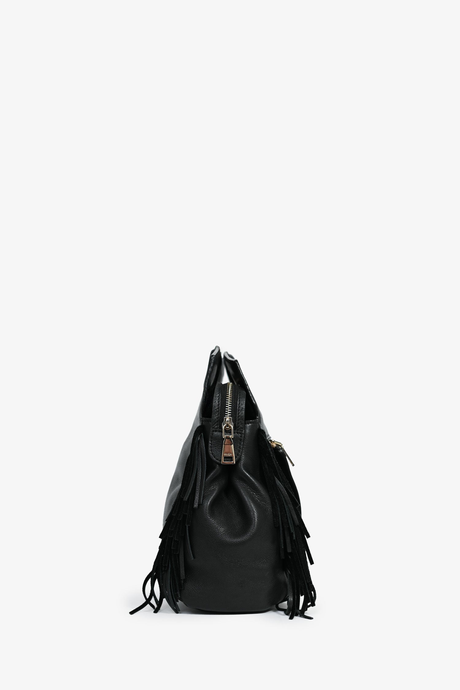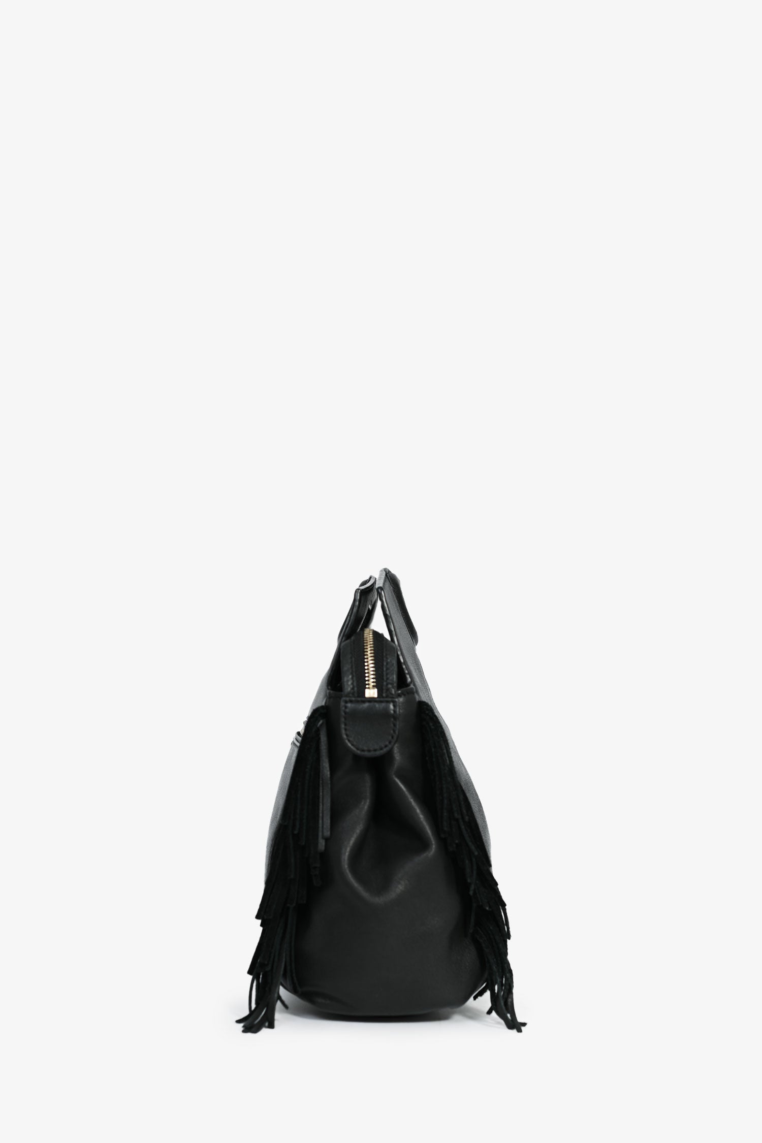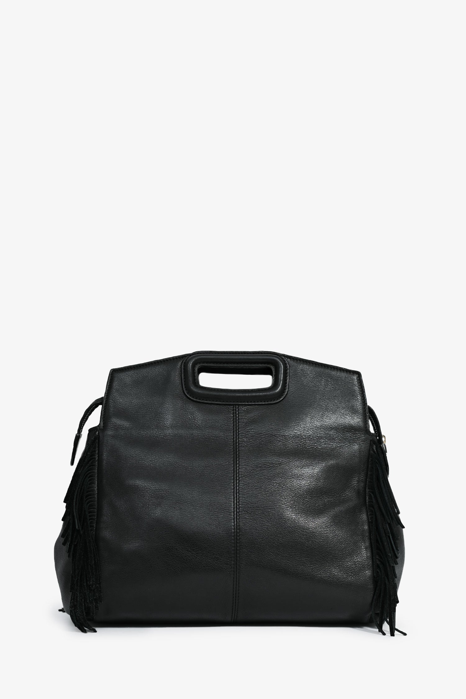 Refresh availabilityMaje Black Leather Suede Fringe Large Top Handle Bag with Strap. Dual handles. Top zip closure. Gold-tone hardware. Tonal textile interior lining. Single interior wall zip pocket. Gold-tone hardware. Removable and adjustable strap. Outer rear zip pocket.