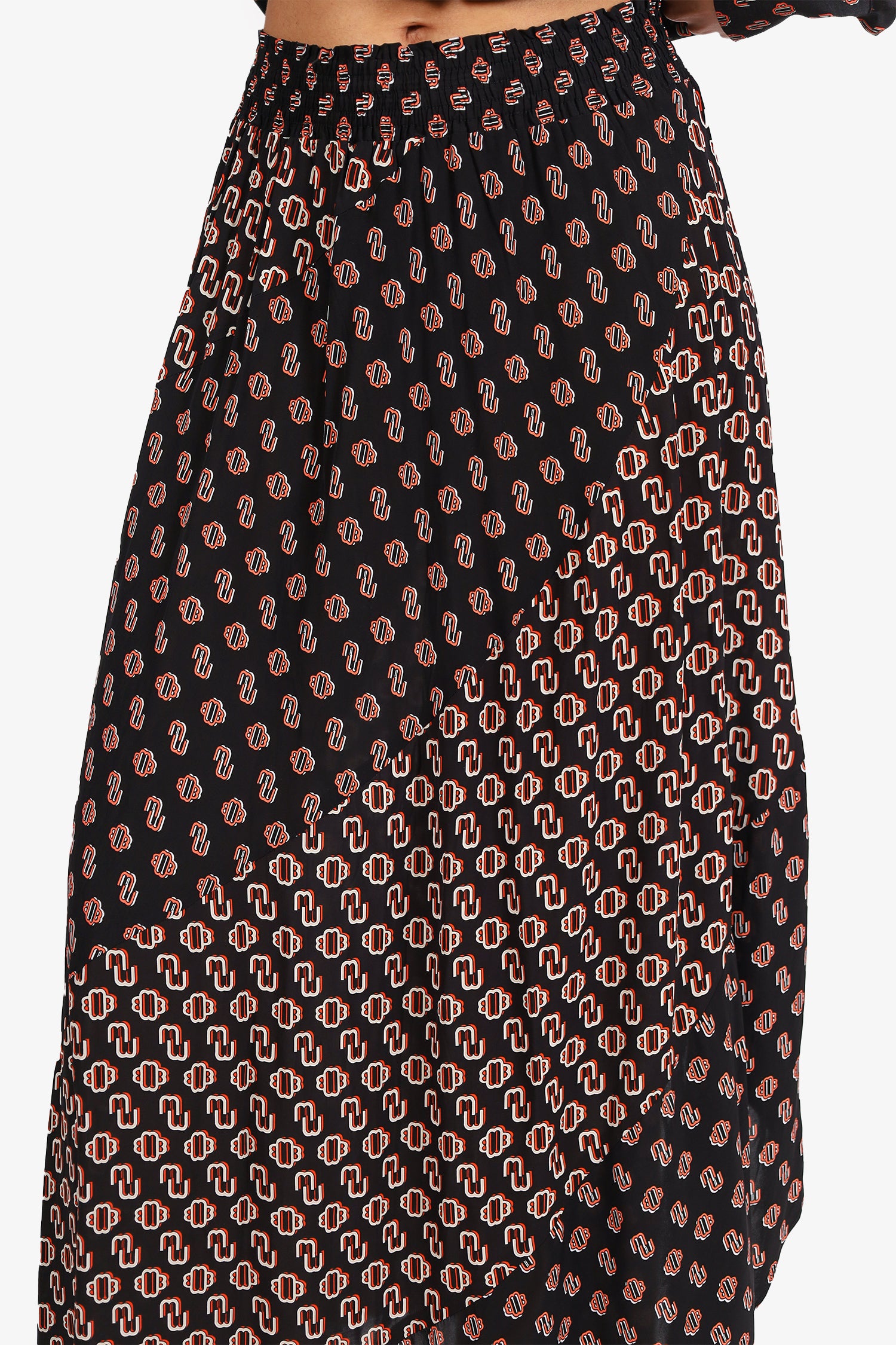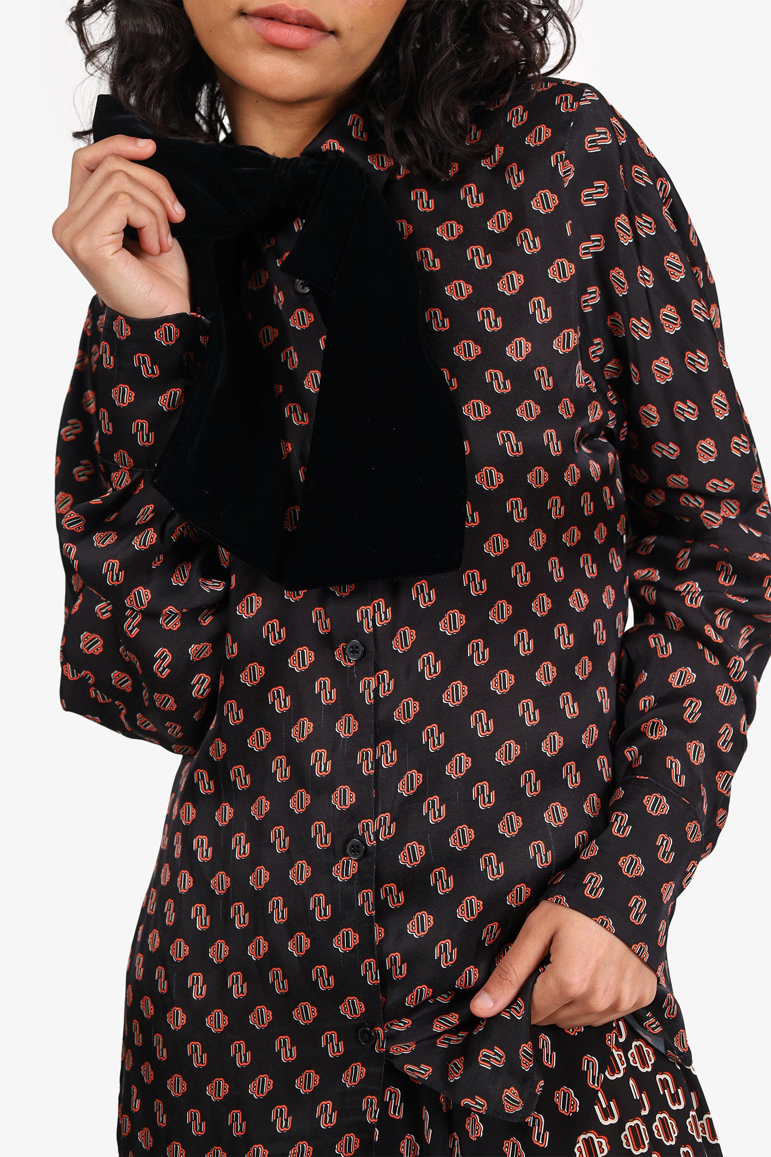 Refresh availabilityMaje Black/Orange Printed Button Up Blouse With Velvet Bow + Midi Skirt. Blouse: Pull-on. Collared-neckline. Front button-up closure. Sleeve cuffs with button-up closure. Removable bow attachment with Silver-tone hardware; Skirt: Slip-on. Elasticated waistband. Tonal stitching.