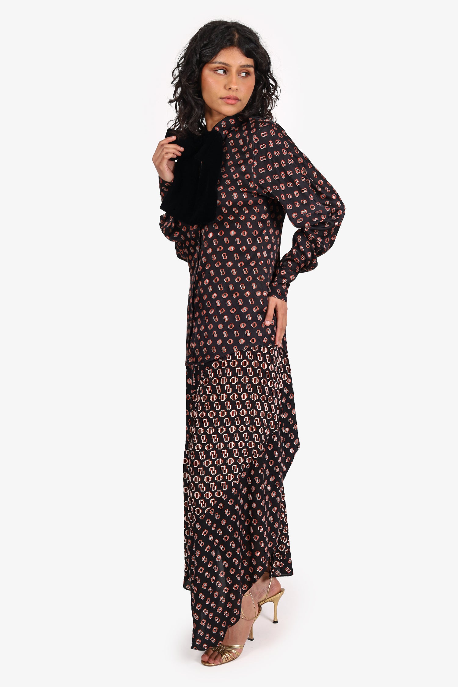 Maje Black/Orange Printed Button Up Blouse With Velvet Bow + Midi Skirt Size 2/36