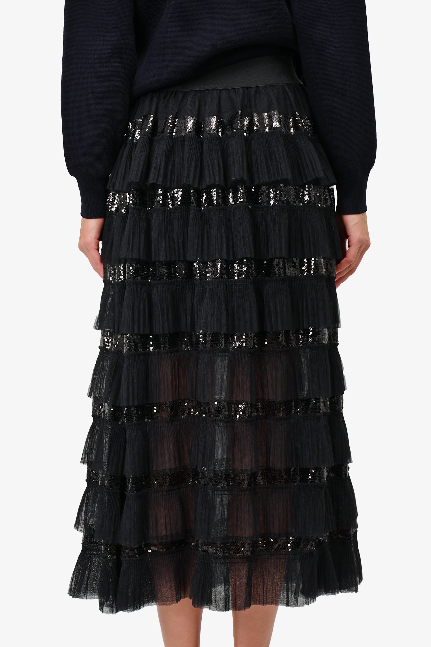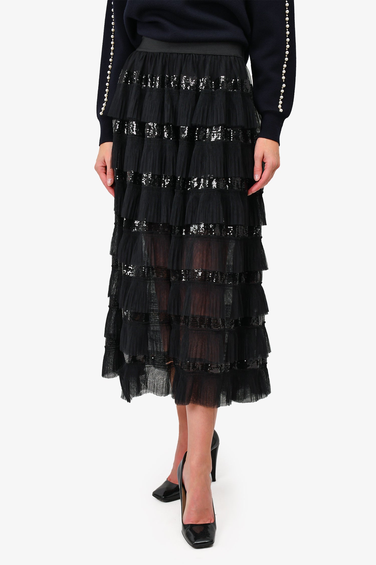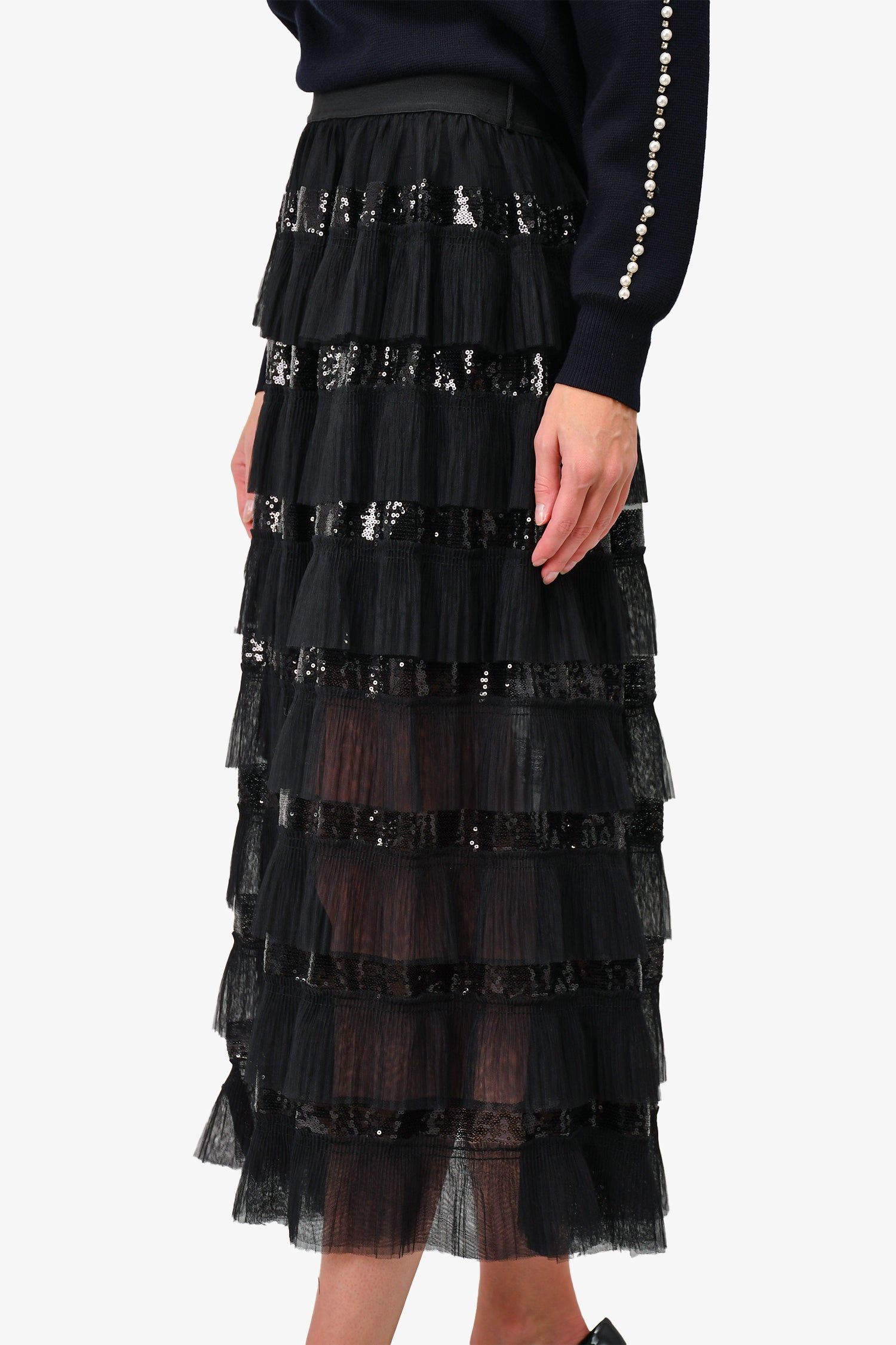 Refresh availabilityMaje Black Tulle/Sequin Tiered Maxi Skirt. Elasticated waistband. Tulle and sequin trimming. Lined interior.