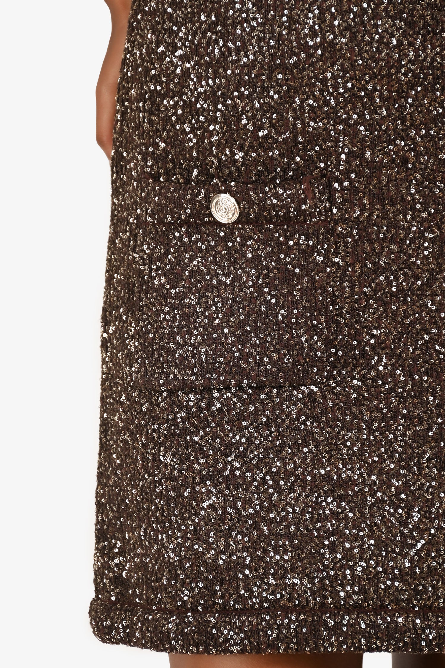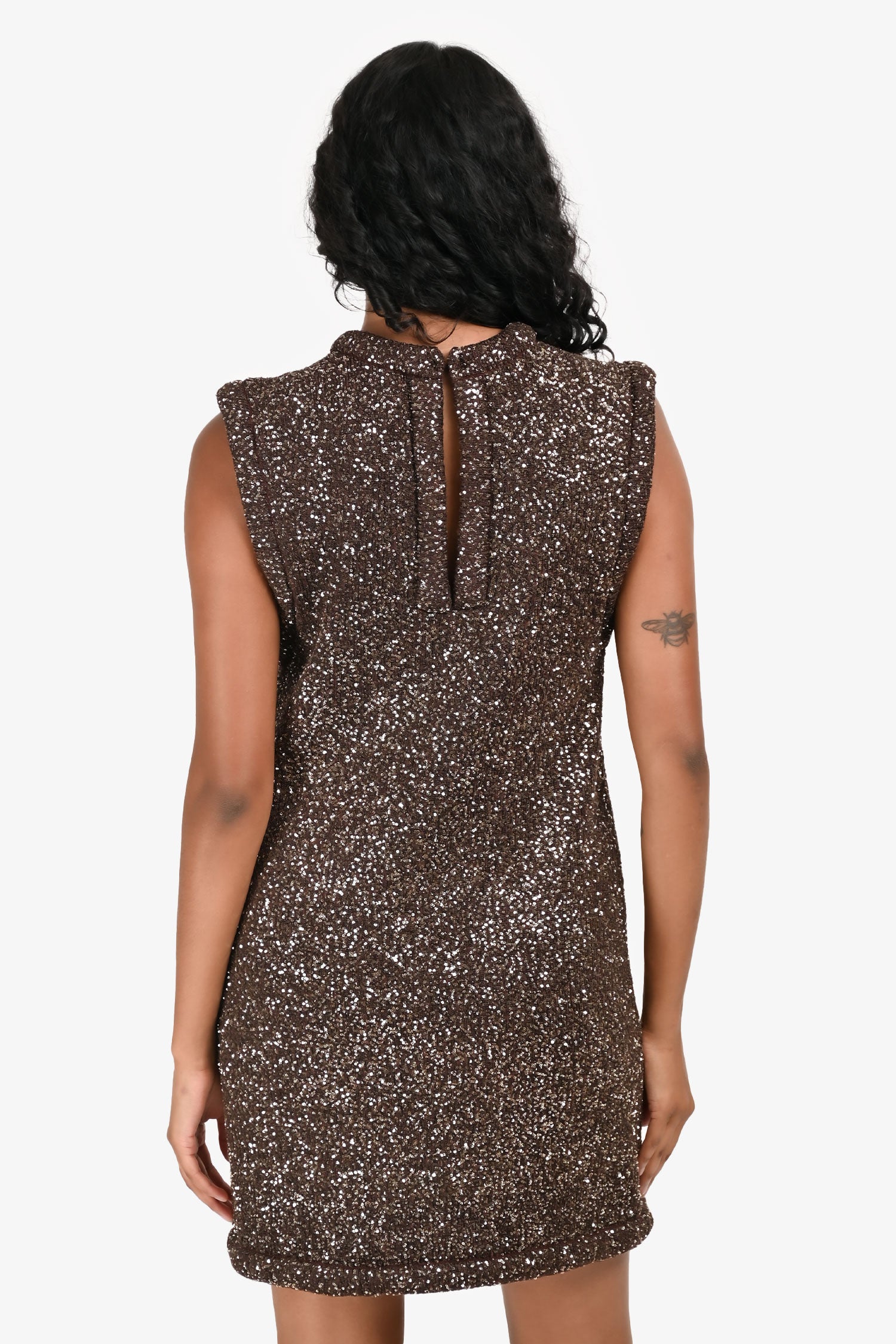 Refresh availabilityMaje Brown Sequin Knit Mini Dress. Round neck. Rear hook closure. Front pockets.