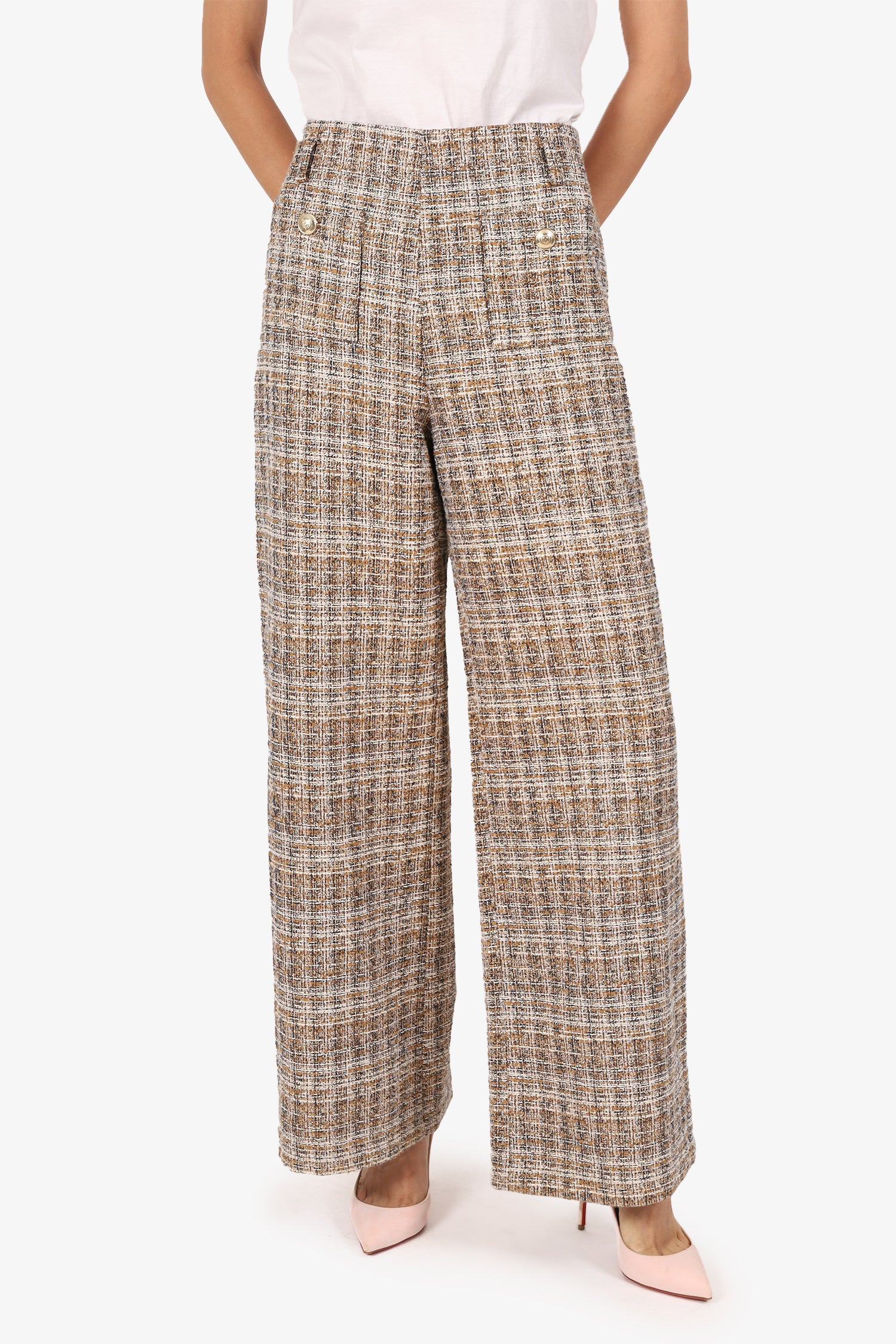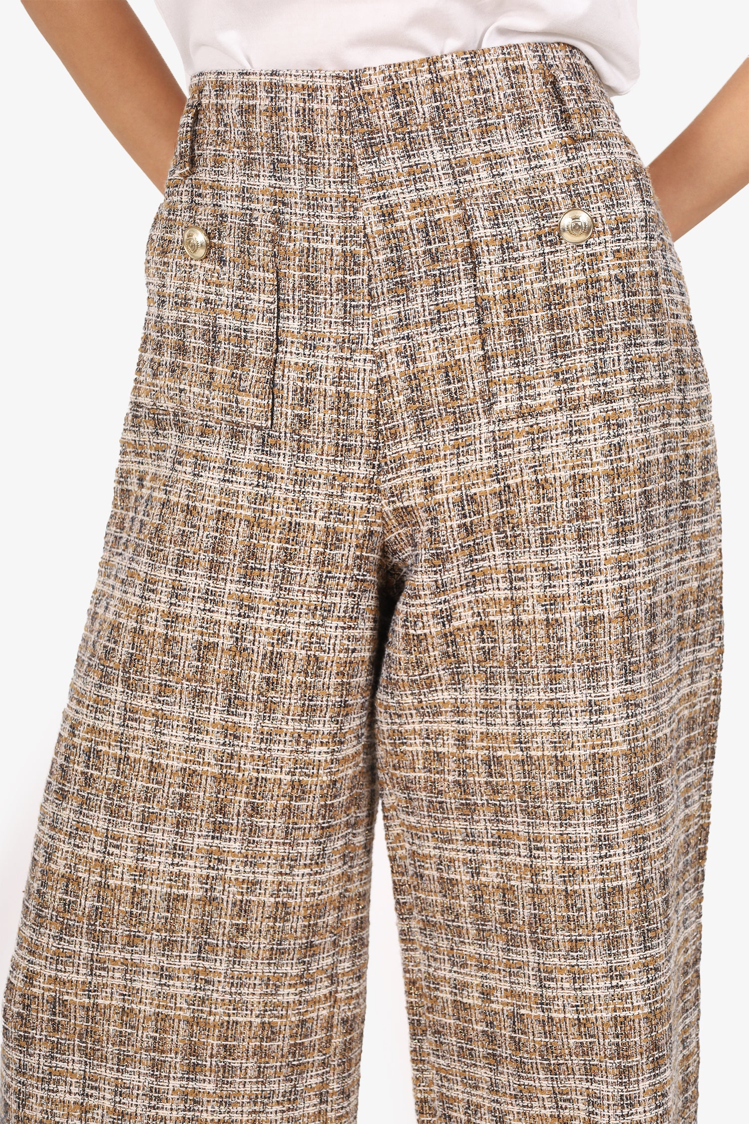 Refresh availabilityMaje Brown/Gold Metallic Tweed Wide Leg Pants. Slip-on. Side zip closure. Waistband belt loops. 2 front exterior slip pocket. Gold-tone hardware. Tonal stitching.