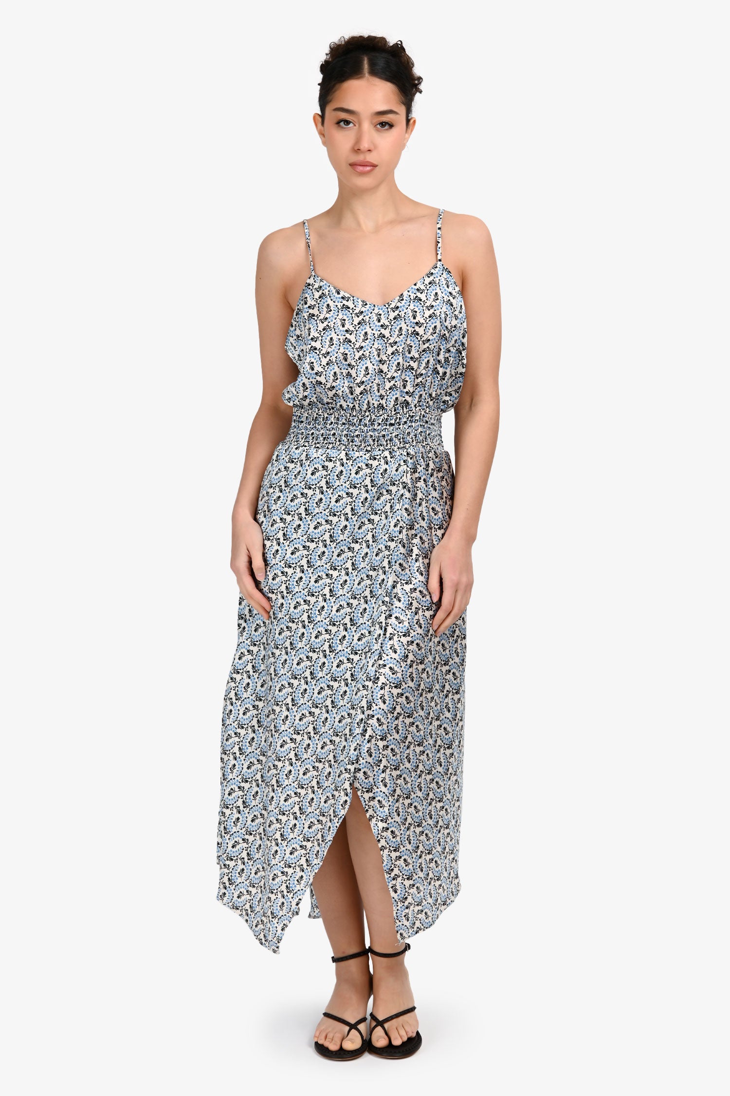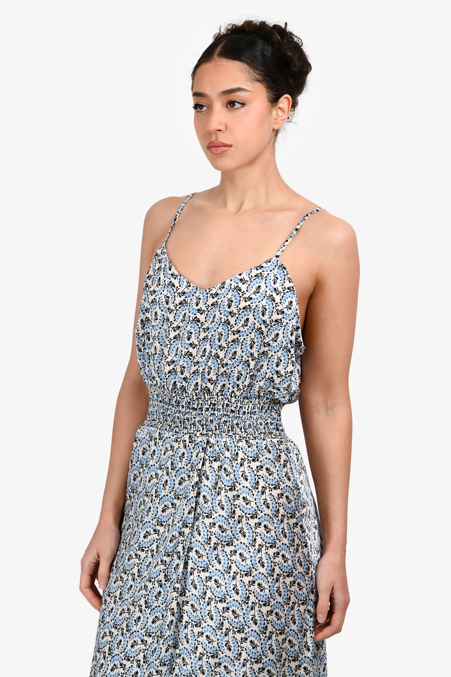 Refresh availabilityMaje Cream and Blue Satin Floral Sleeveless Midi Dress. V-neckline. Adjustable shoulder straps. Elasticized waistband. Unlined. Tonal stitching.