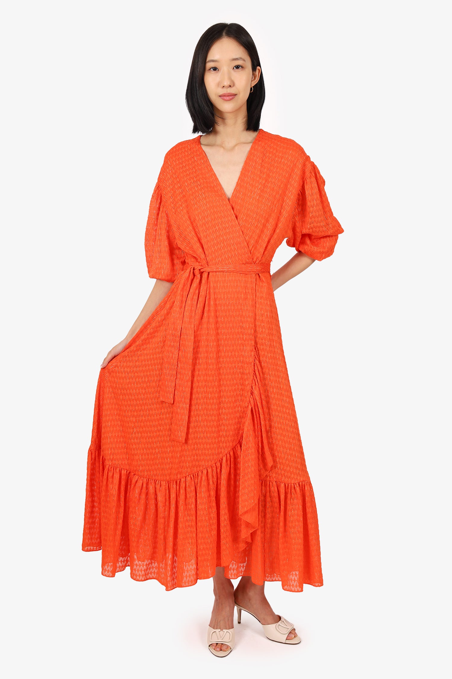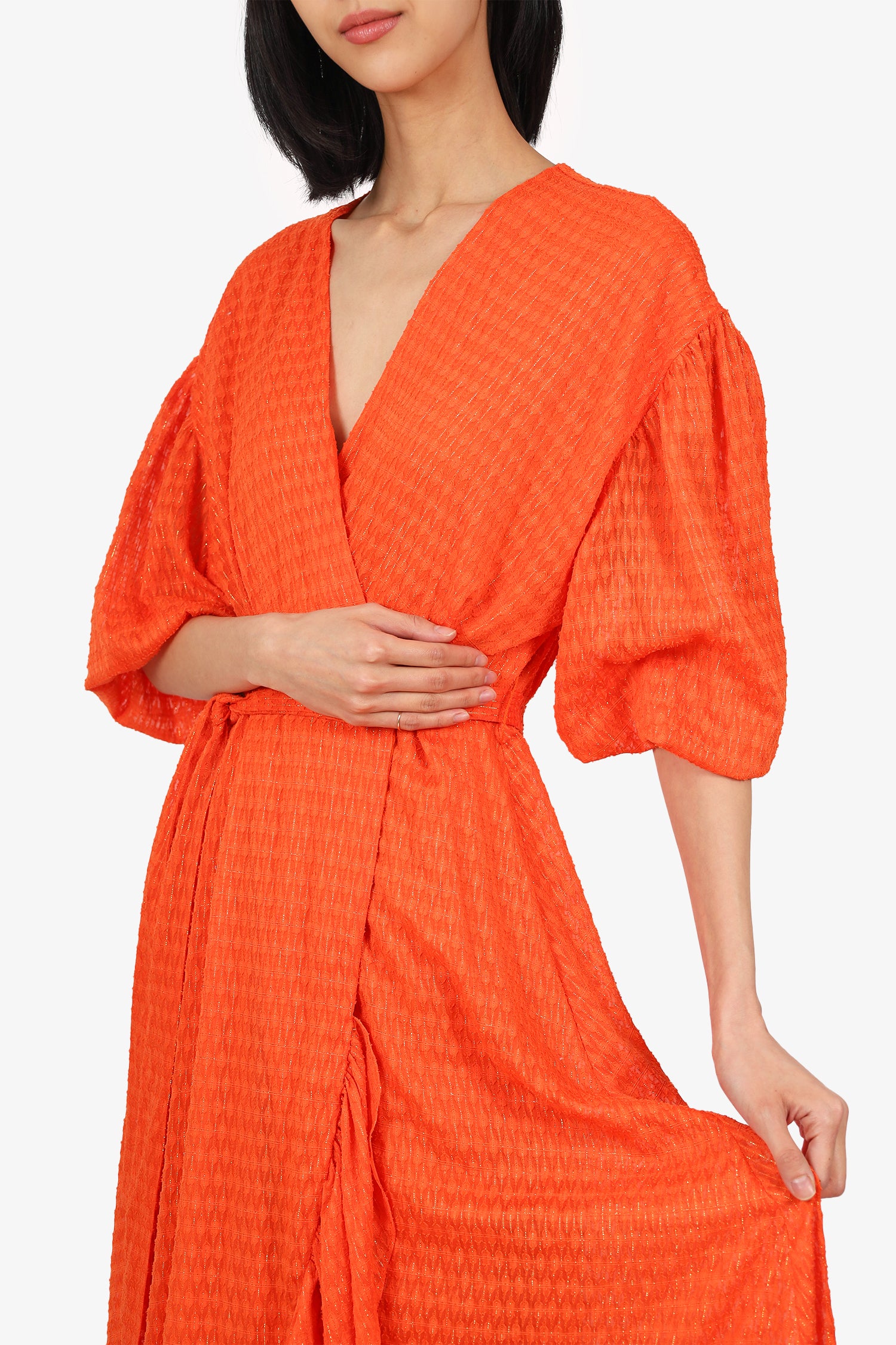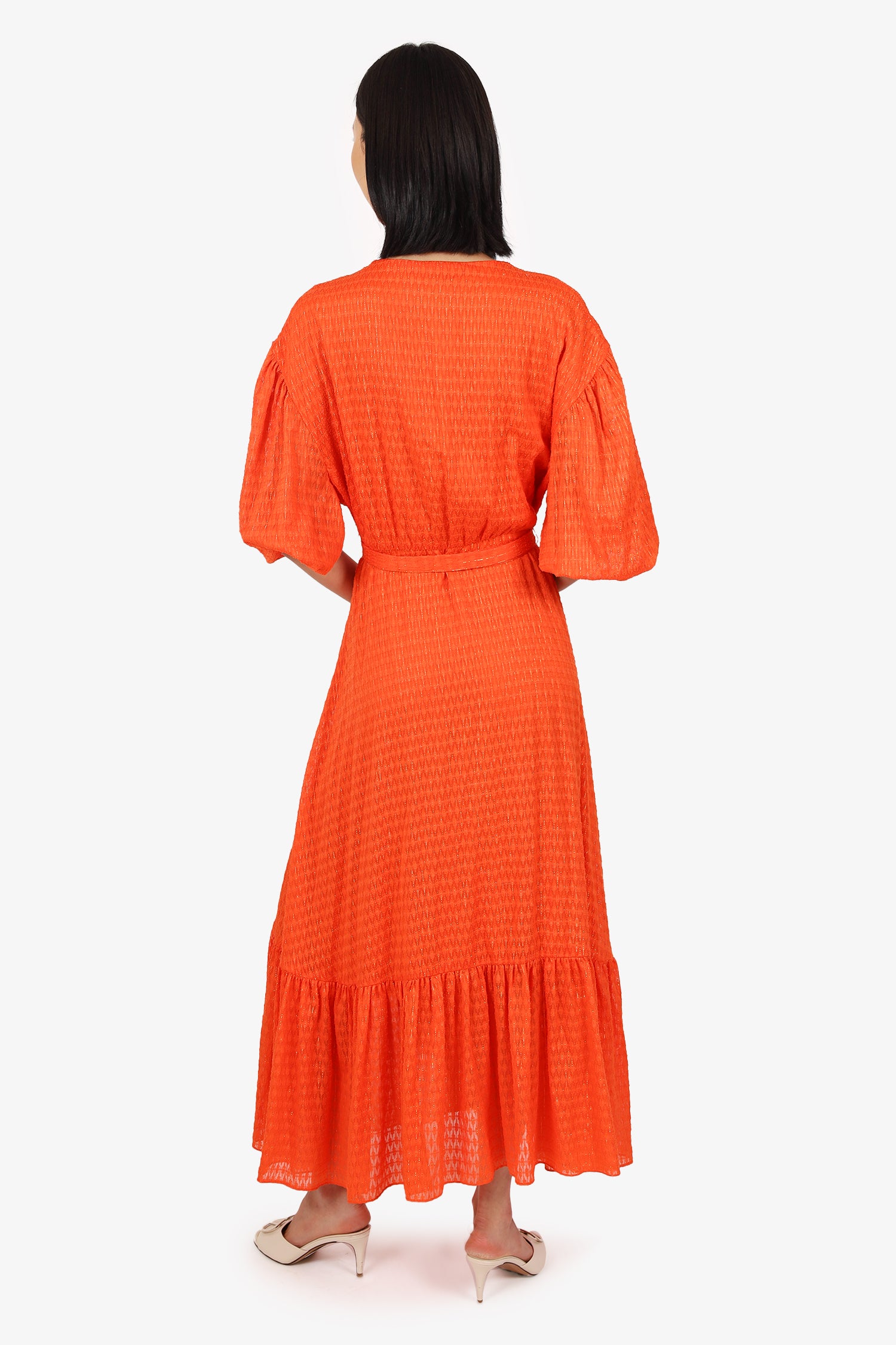 Refresh availabilityMaje Orange Glittery Wrap Ruffled Maxi Dress. V-neckline. Wrap design with removable tie-up closure at waistline. Additional button-up closure at waistline. Elasticated sleeve cuffs. Tonal stitching.