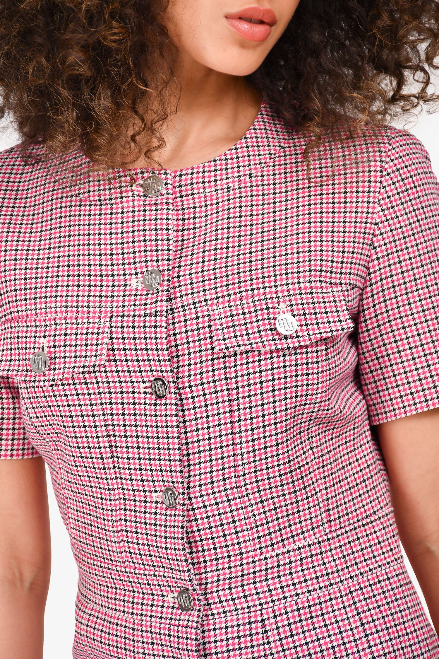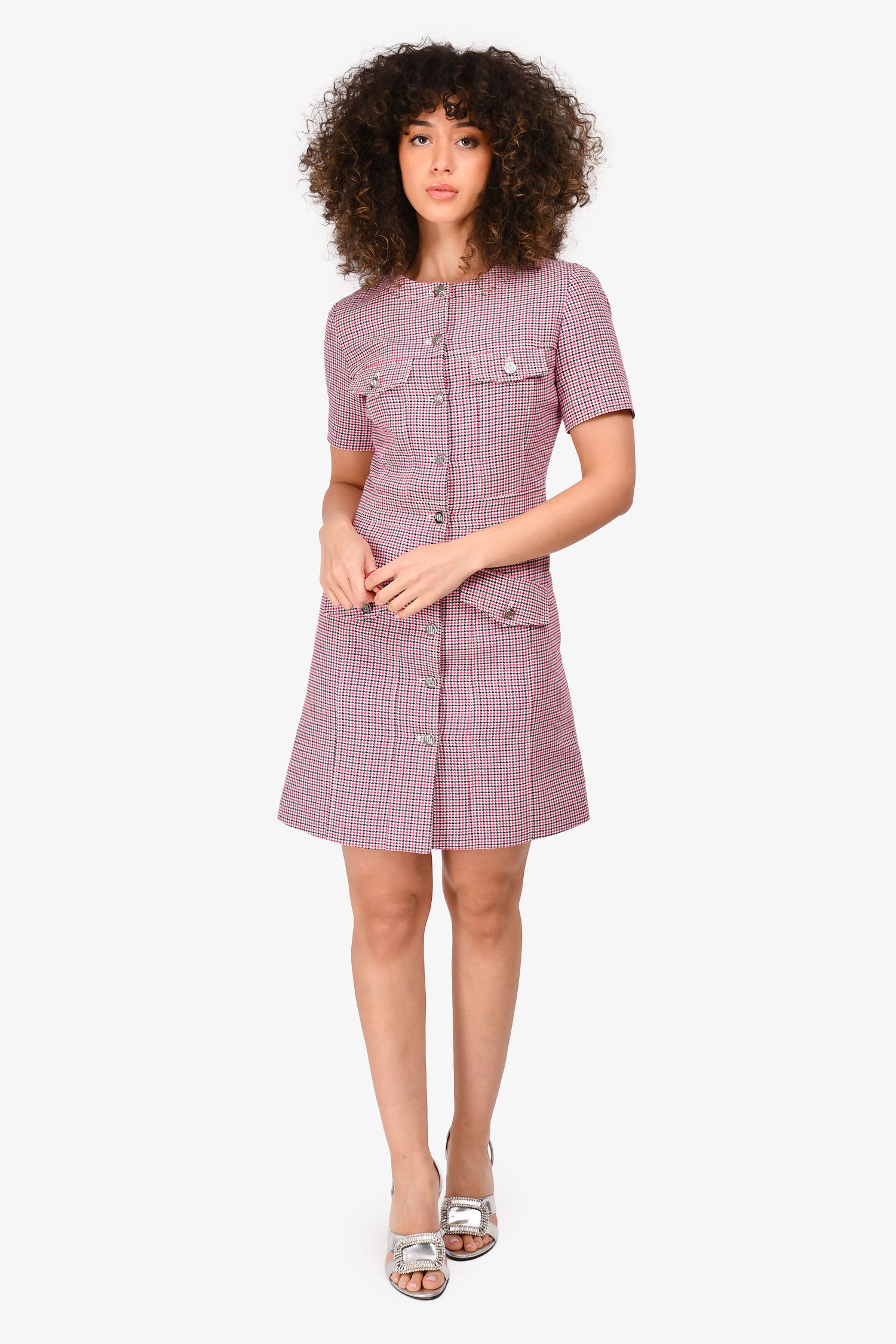 Refresh availabilityMaje Pink/Black Houndstooth Patterned Short Sleeve Mini Dress. Front button-up closure. Four front faux pockets. Fully lined interior. Tonal stitching.