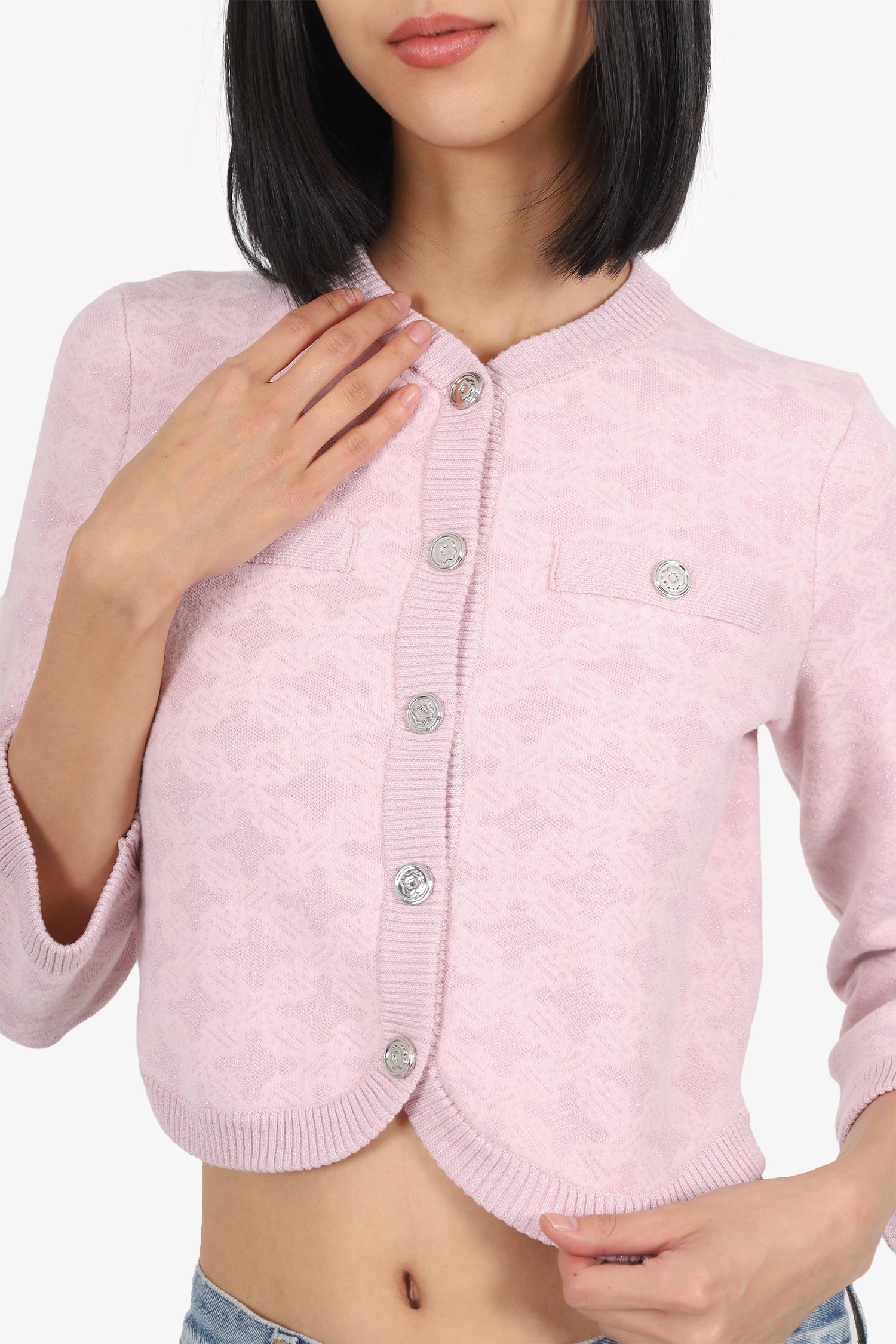 Refresh availabilityMaje Pink Glitter Jacquard Cardigan. Pull-on. Round neckline. Front snap button-up closure. 2 faux chest button-up pockets. Silver-tone hardware. Tonal stitching.