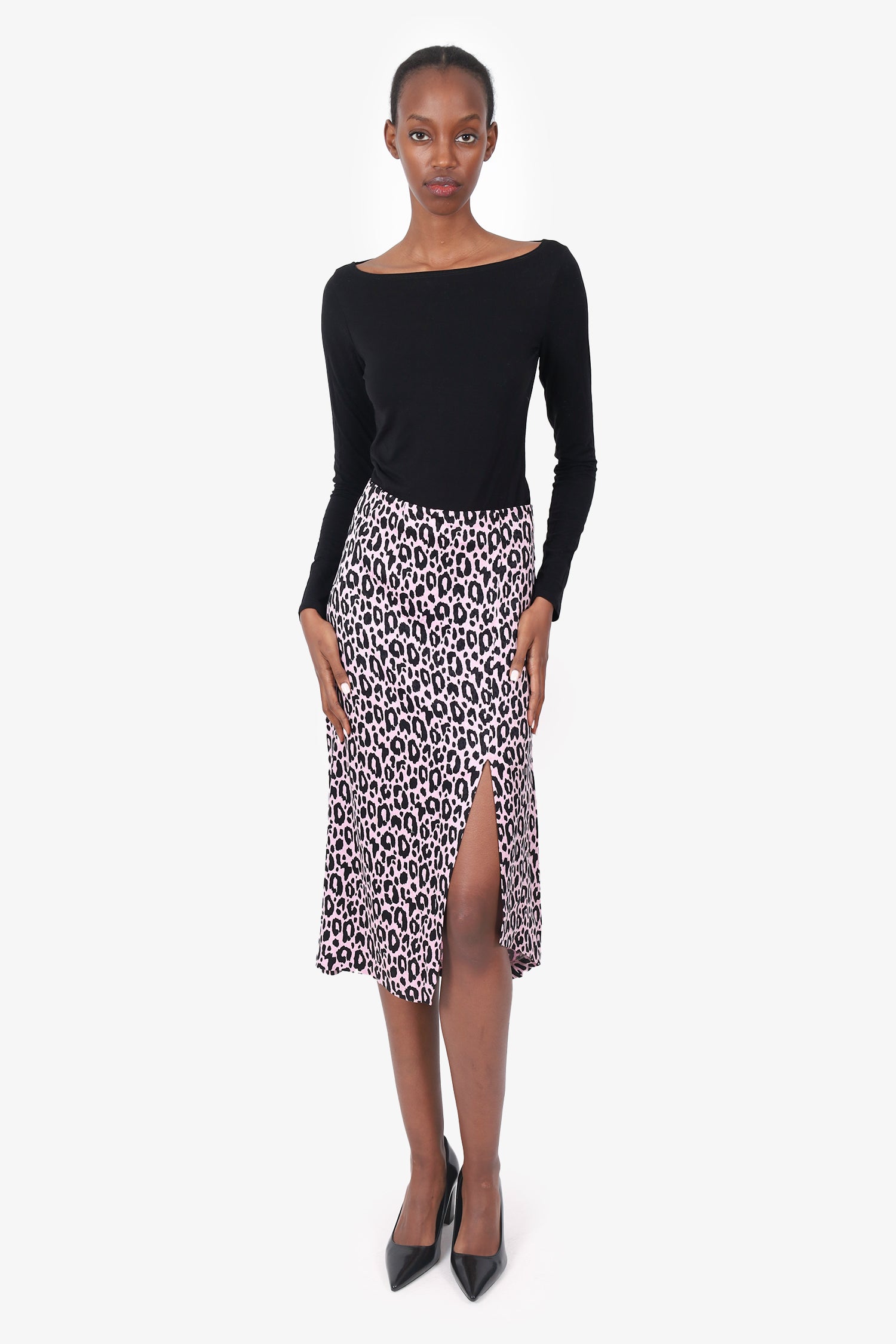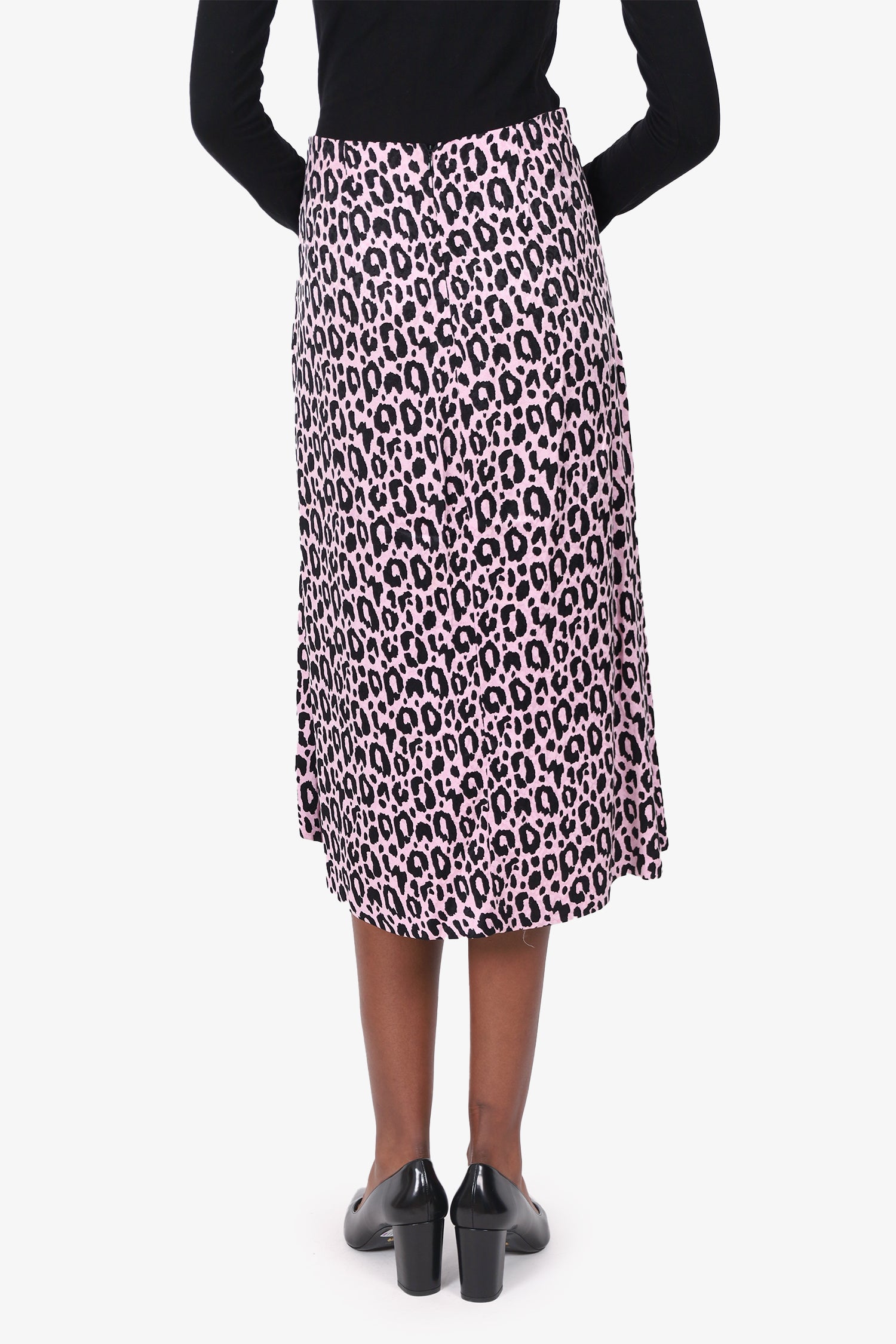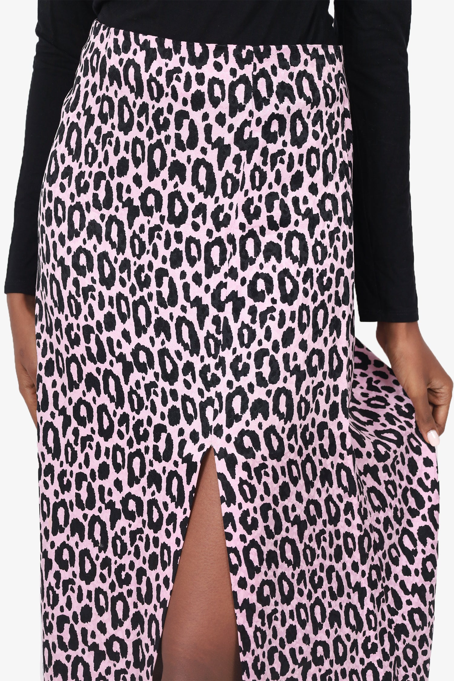 Refresh availabilityMaje Pink/Black Satin Leopard Print Skirt size 36. Slip-on. Rear zip closure. Side-slit. Tonal stitching.