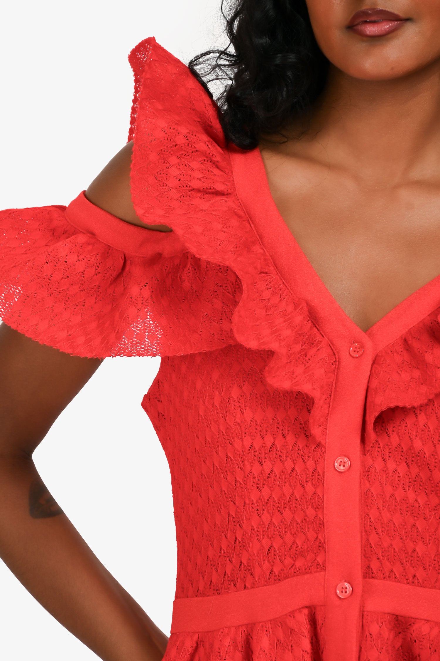 Refresh availabilityMaje Red Lace Ruffle Detail V Neck Sleeveless Dress. V-neckline. Fitted waist. Back zip closure and front button closure. Side pockets. Fully lined. Tonal stitching.