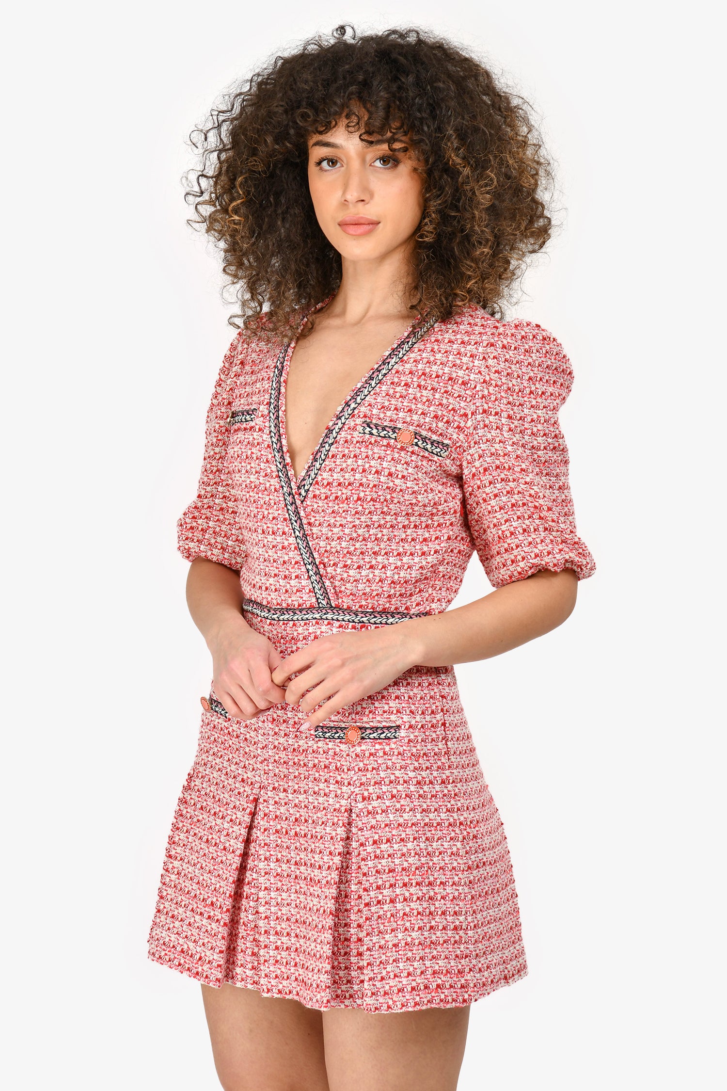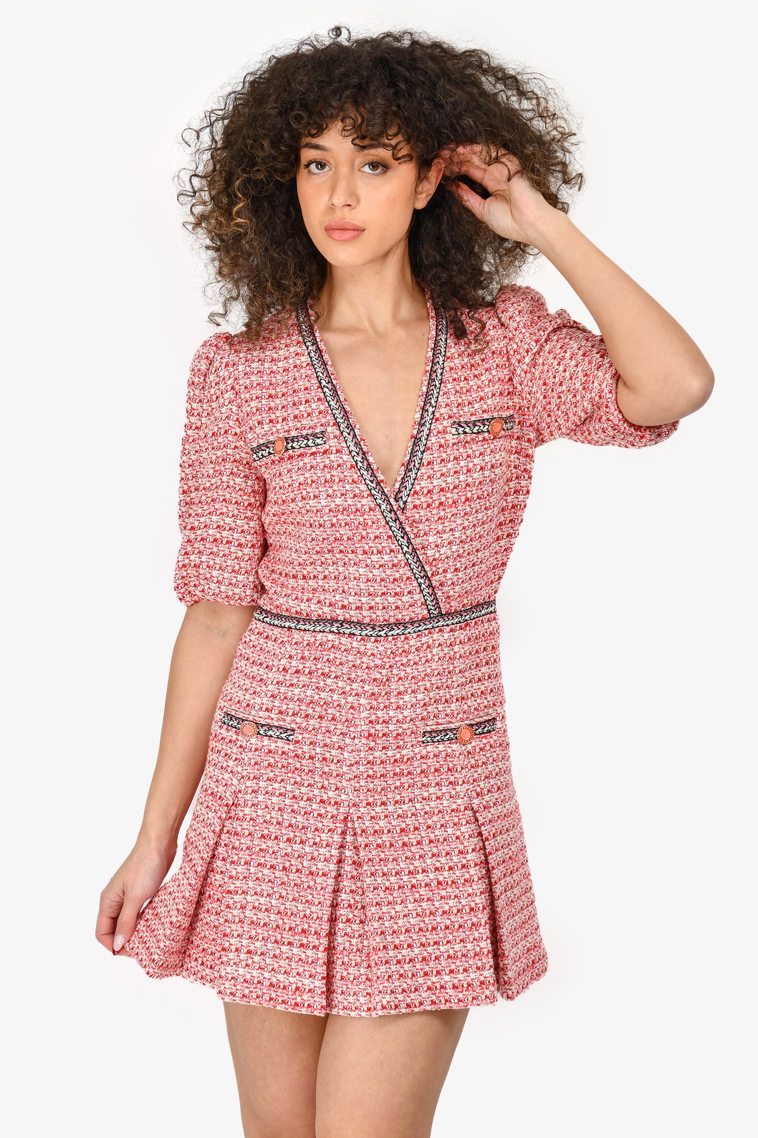 Refresh availabilityMaje Red Tweed V Neck Short Sleeve Mini Dress. Four front faux buttoned pockets. Side zip closure. Elasticized hem on sleeves. Unlined. Tonal stitching.