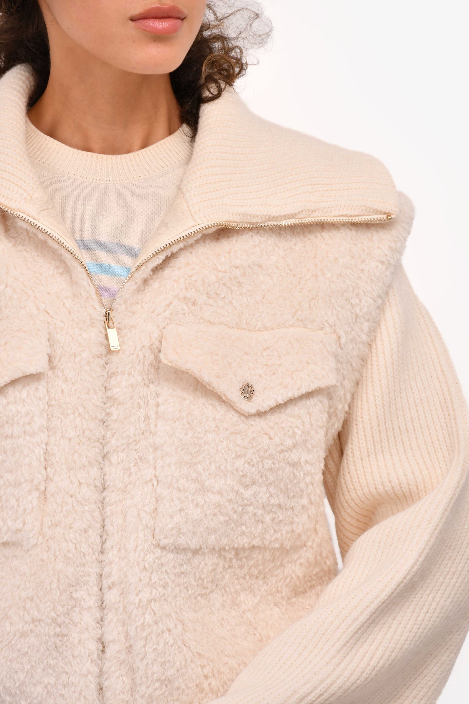 Refresh availabilityMaje White Faux Fur Knit Zip Up Jacket. Front zip closure. Front pockets. Unlined. Elasticized cuffs.