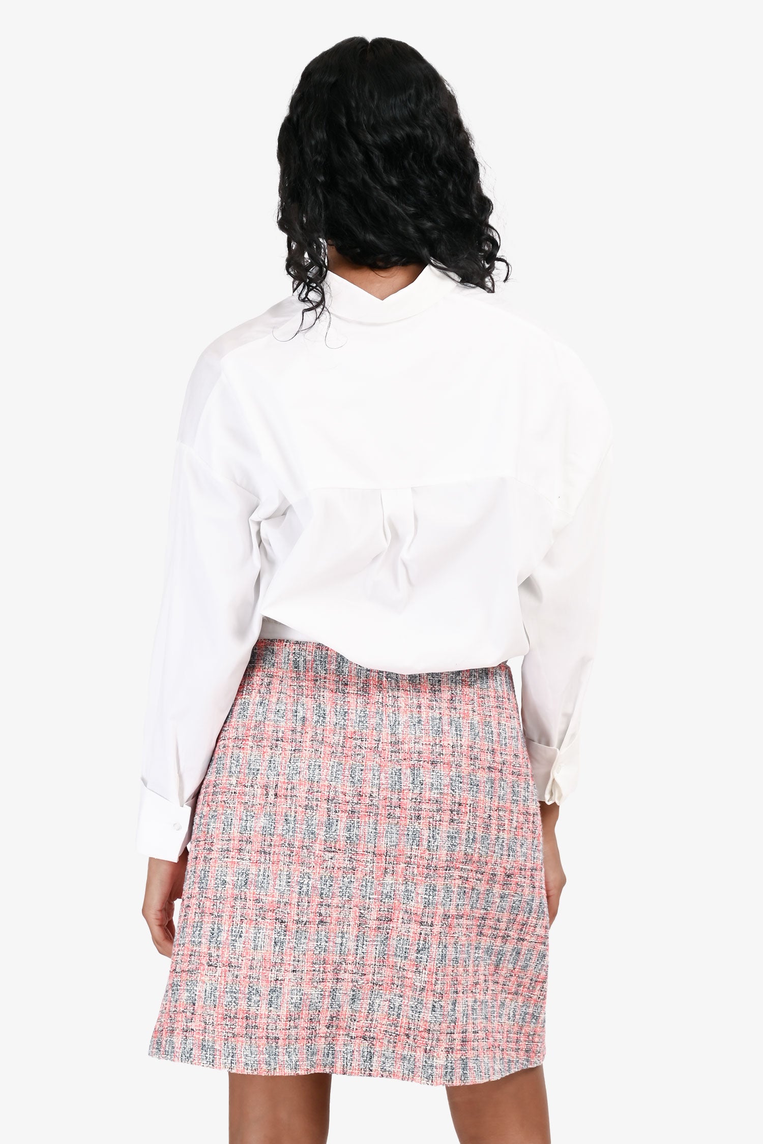 Refresh availabilityMaje White/Red Tweed Shirt Dress. Front button placket. Long sleeves. Attached tweed skirt. Side snap closures. Tonal stitching.
