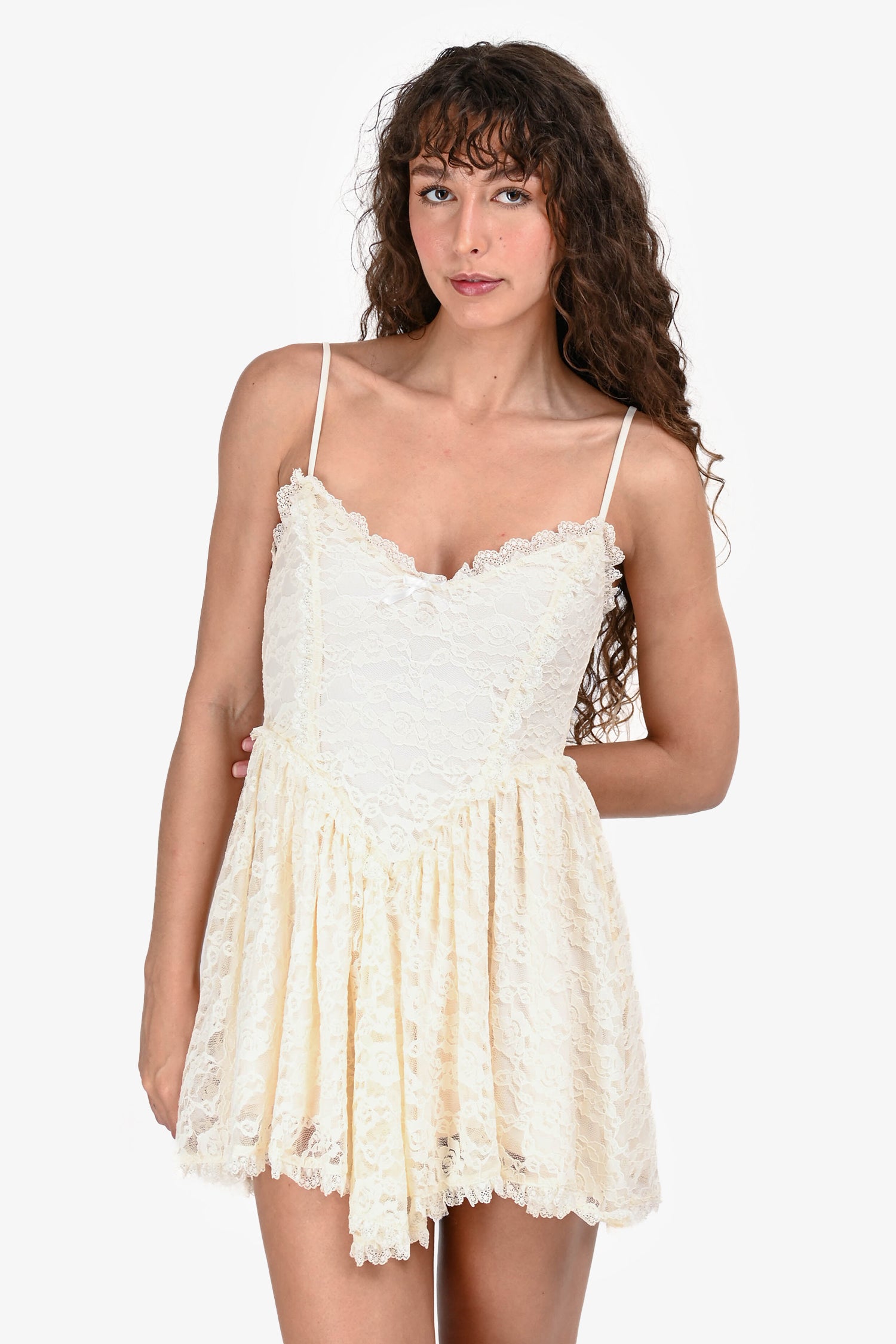Refresh availabilityMajorelle White Lace Basque Waist Mini Dress. V-neckline. Sheer lace overlay with scalloped edges. Adjustable shoulder straps. Fully lined. Tonal stitching.