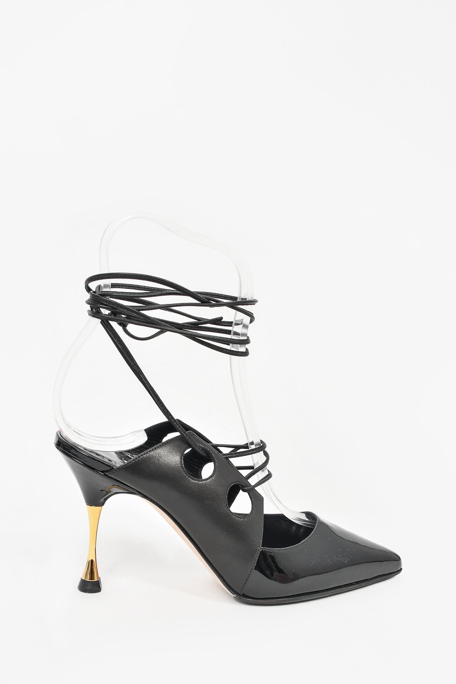 Refresh availabilityManolo Blahnik Black Patent Lace Up Pumps. Pointed toe. Lace-up closure. Glossy finish. Tonal stitching.