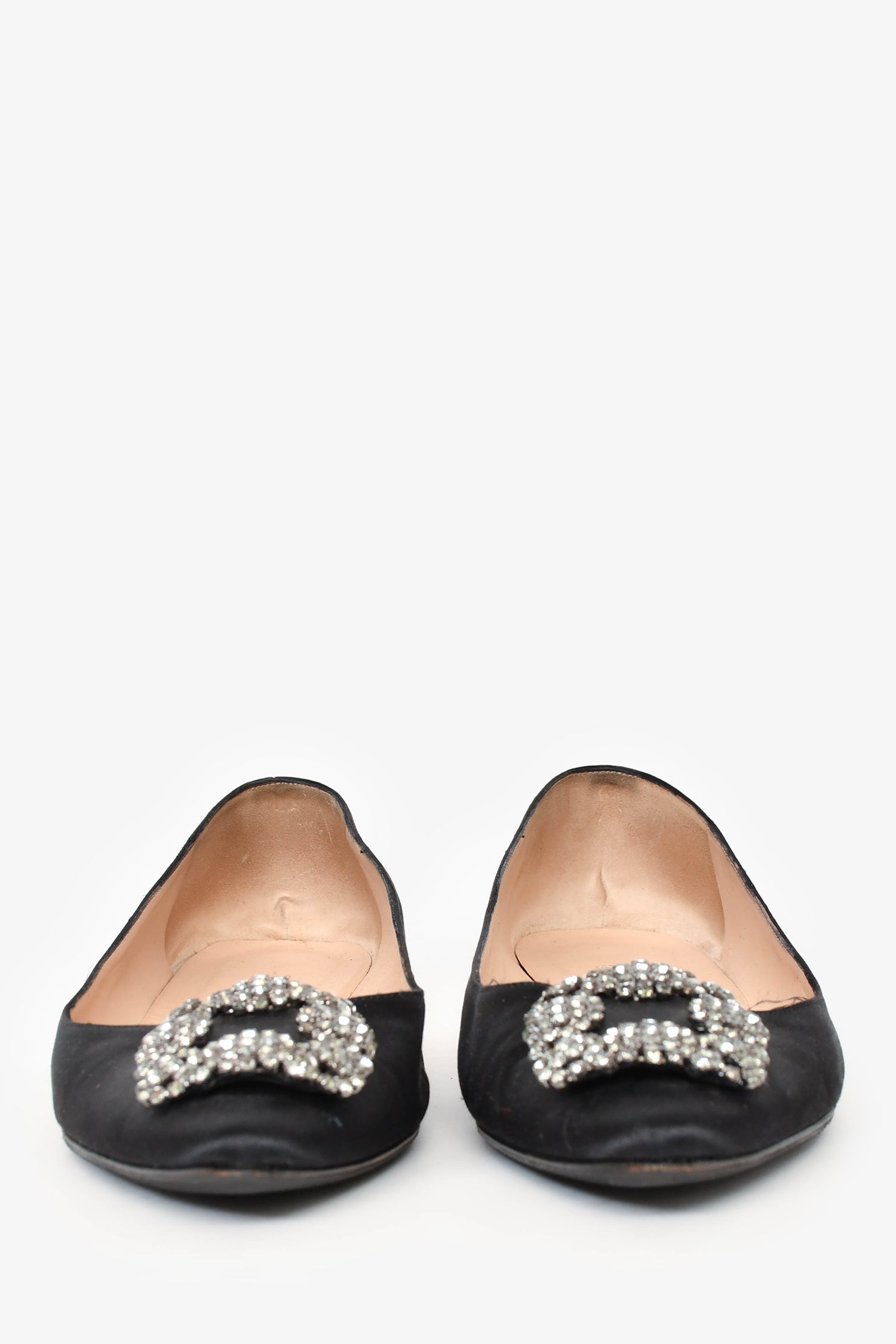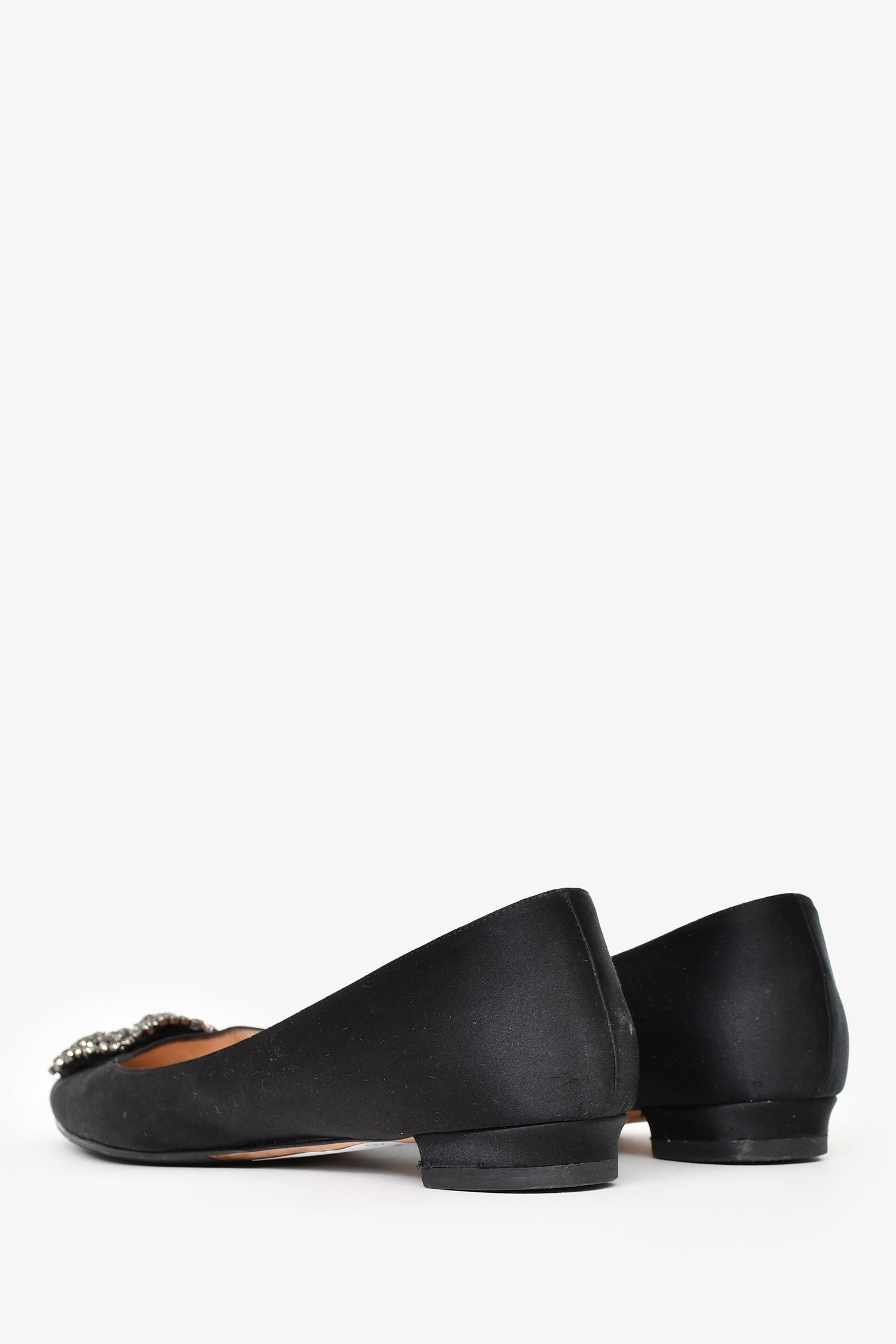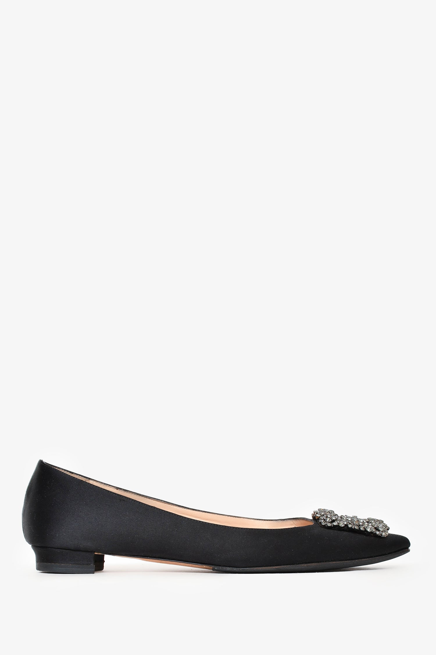 Refresh availabilityManolo Blahnik Black Satin Crystal Embellished Hangisi Flats. Pointed toe style. Signature crystal-embellished buckle detail on the toe. Tonal stitching.
