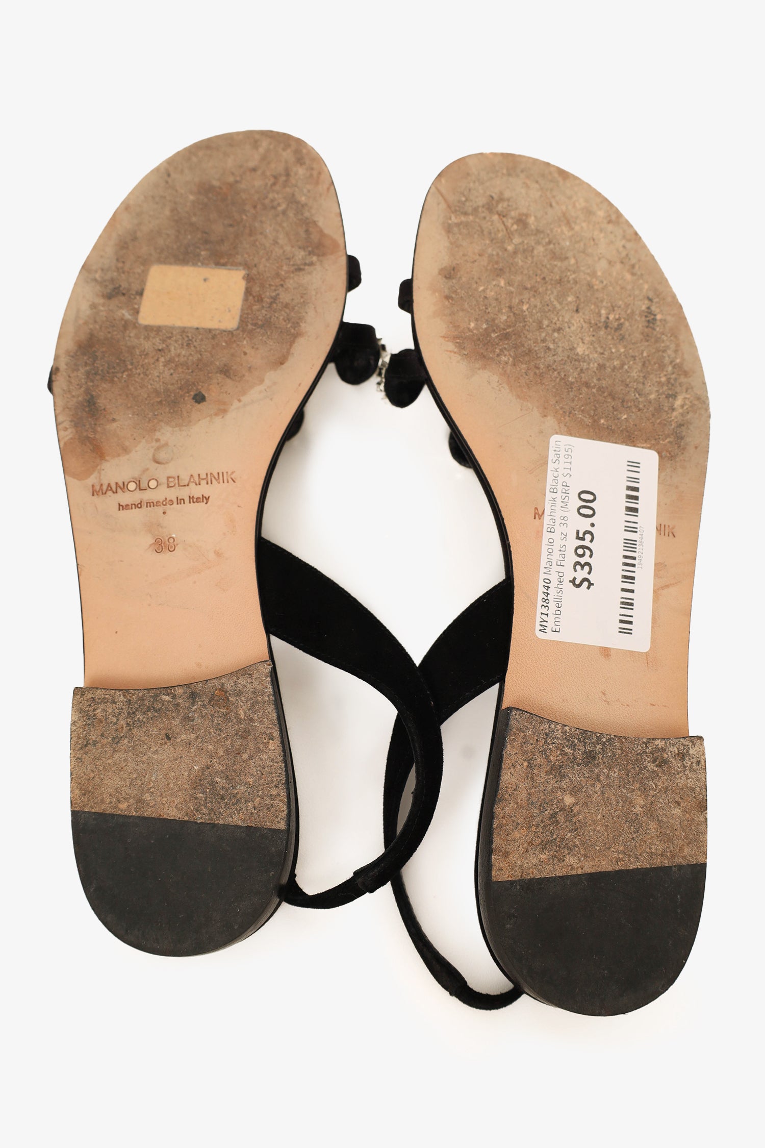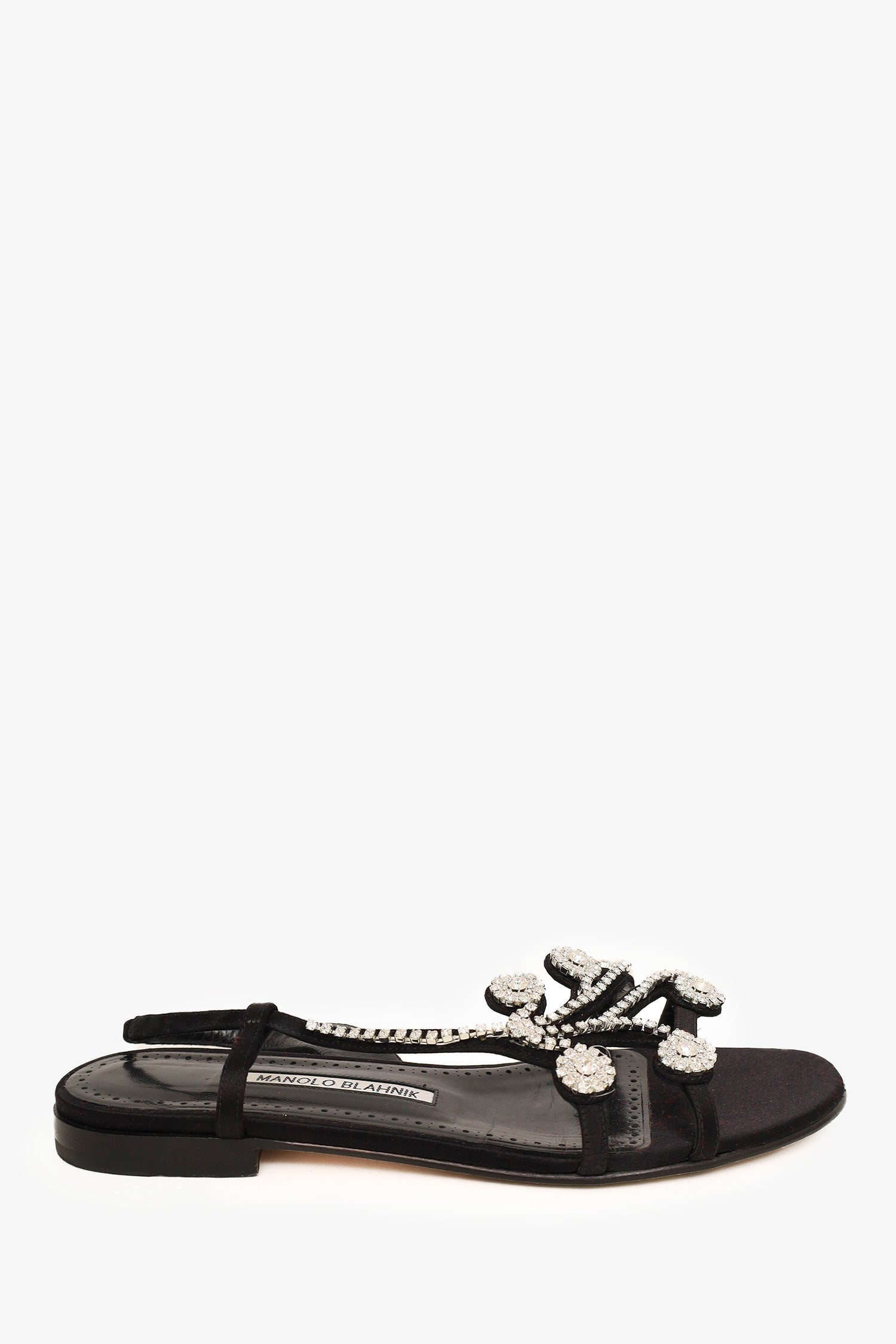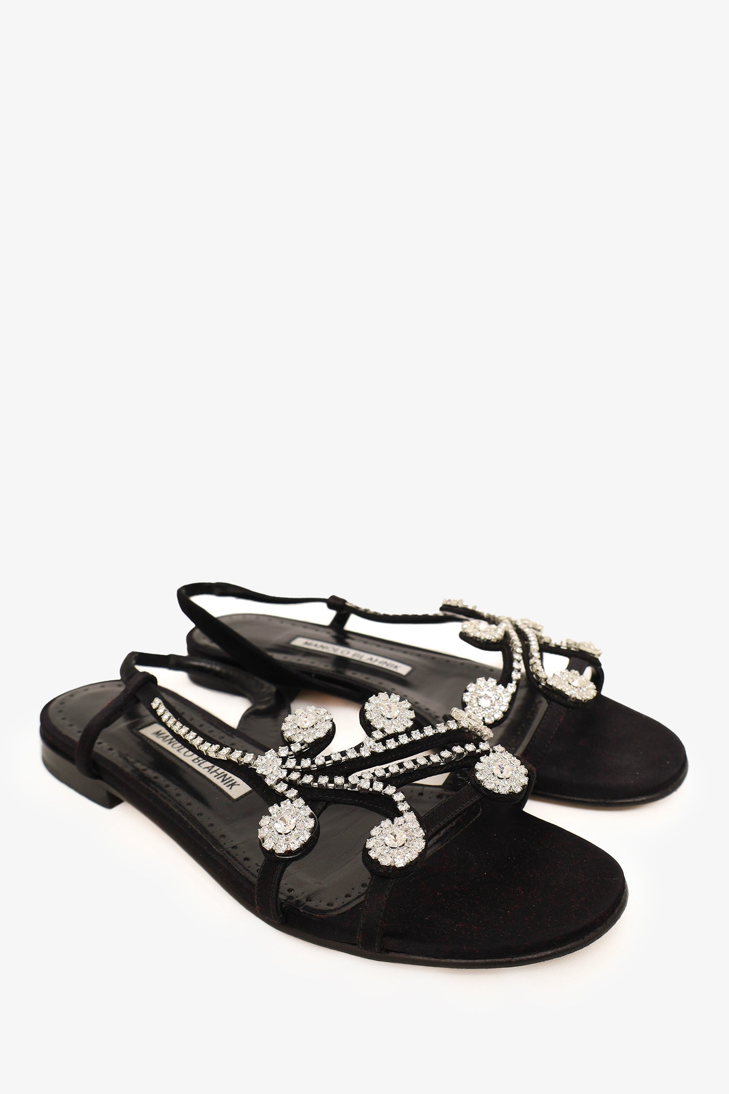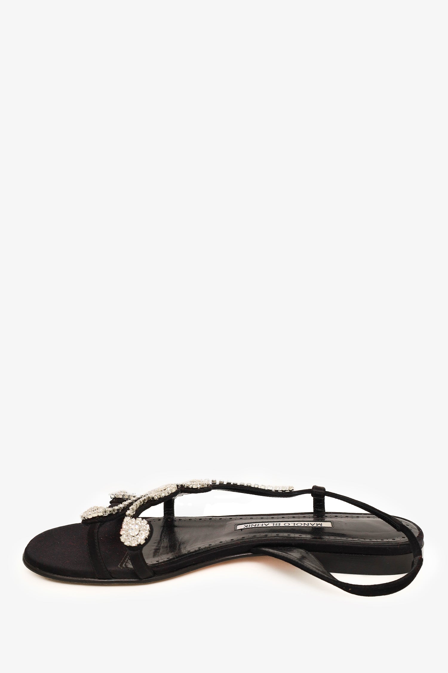 Refresh availabilityManolo Blahnik Black Satin Embellished Flats. Elasticated ankle strap. Open and round toe. Tonal stitching. Comes with box.