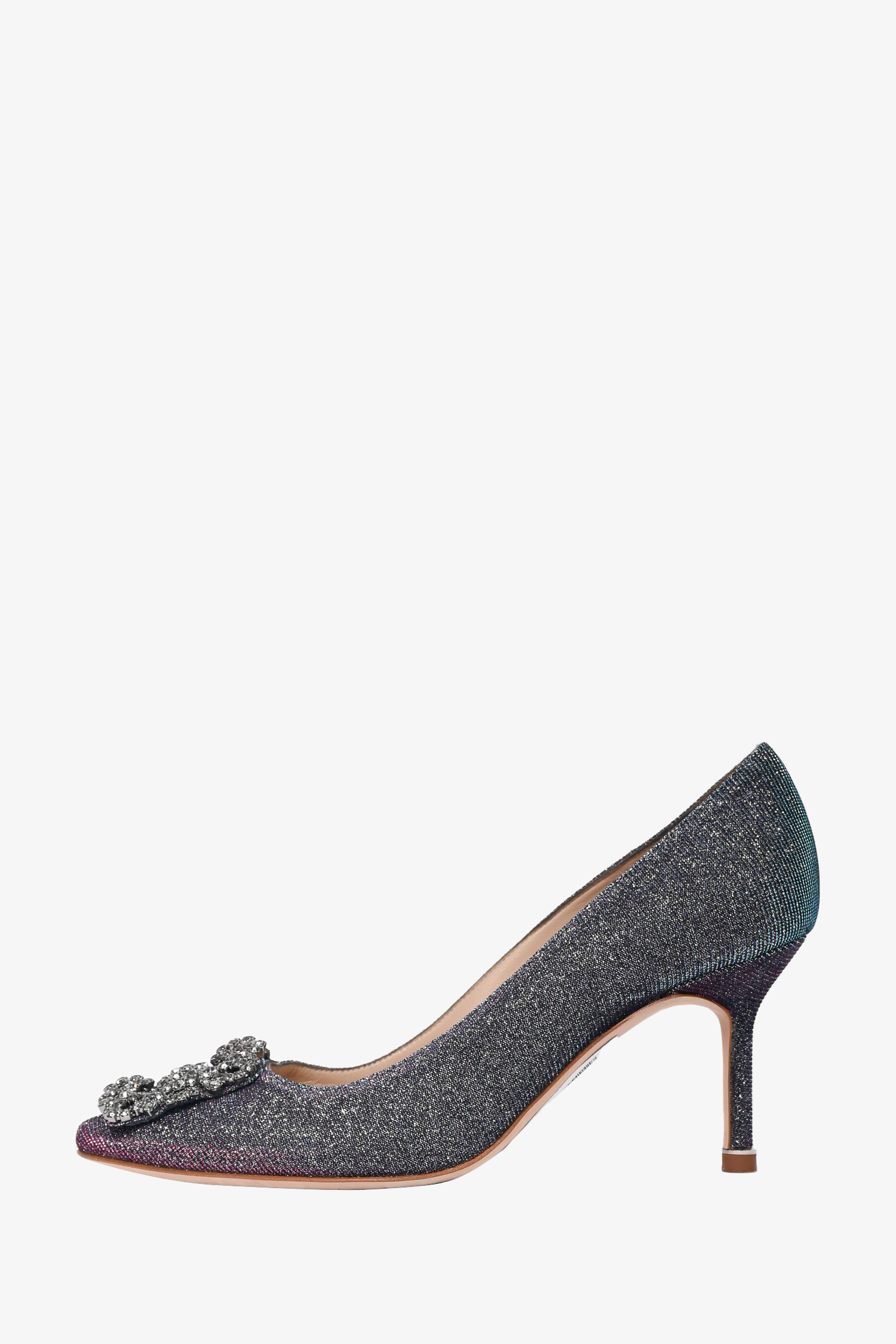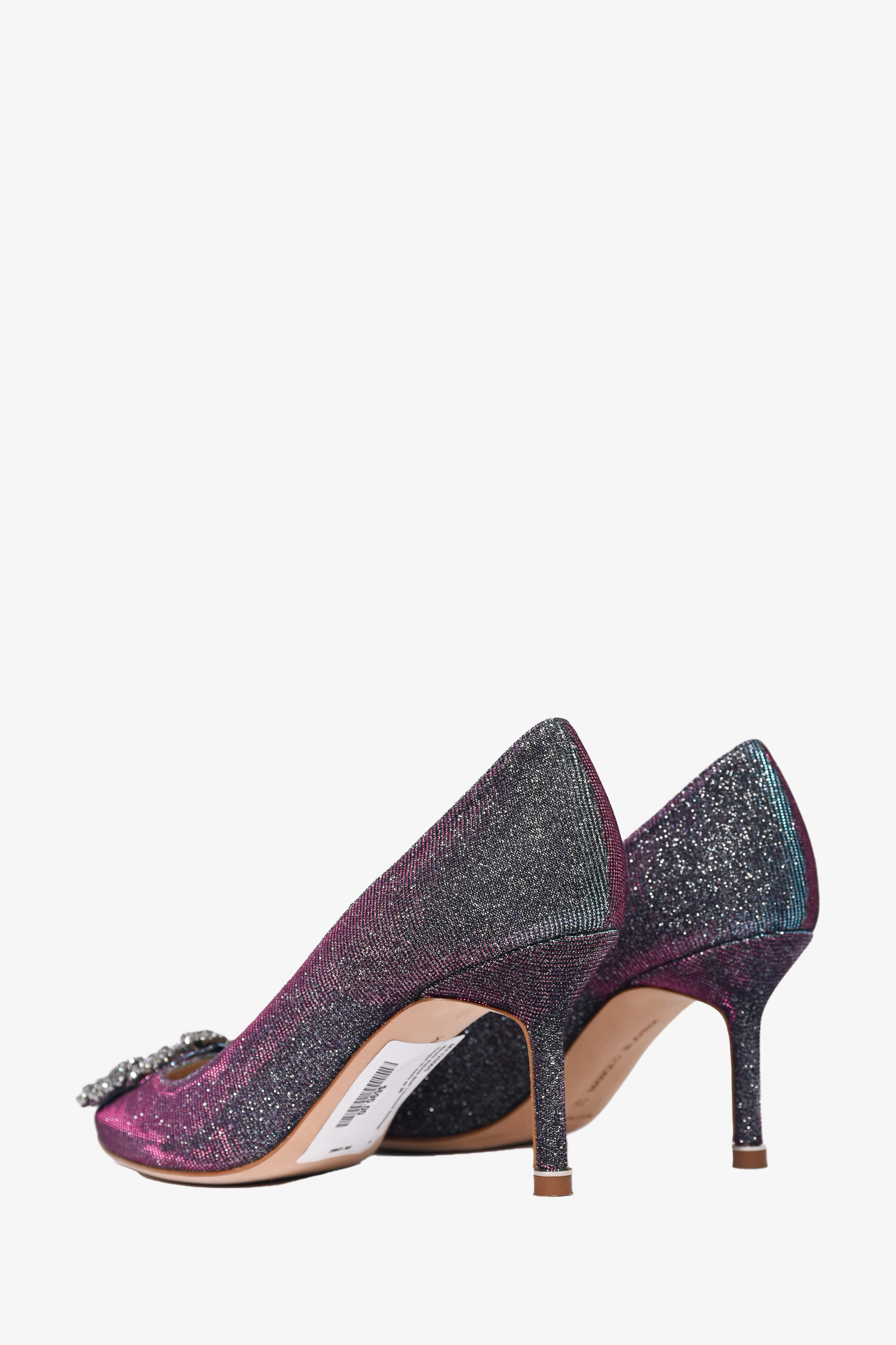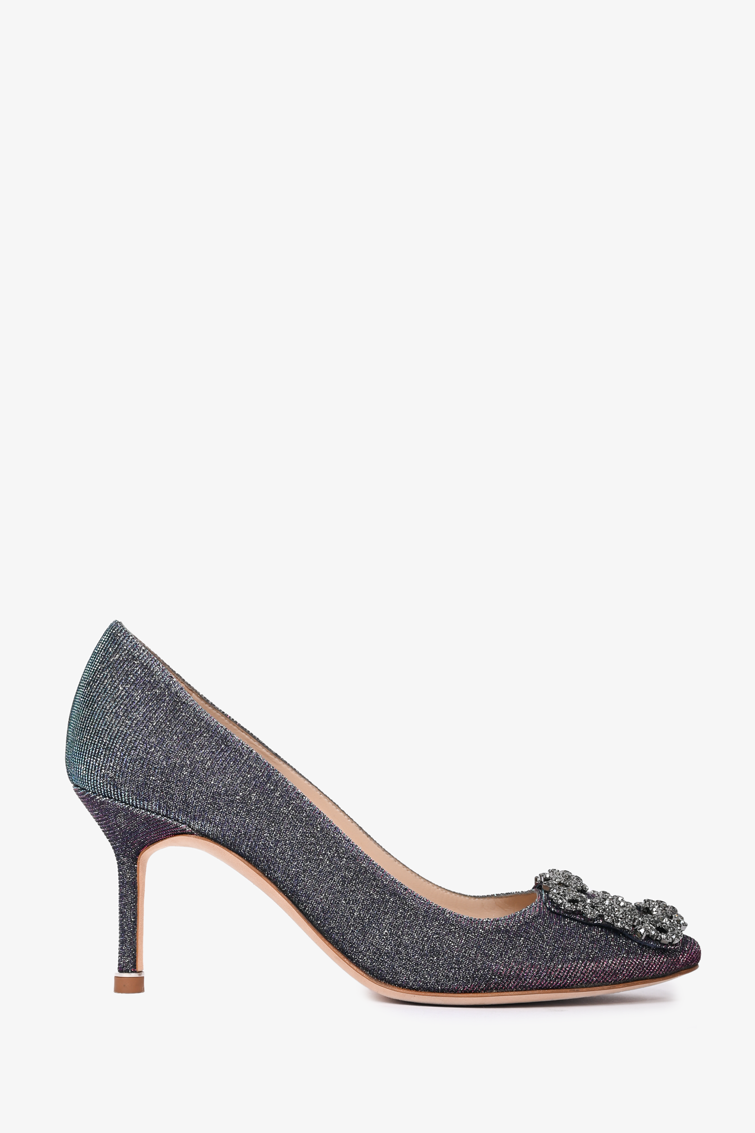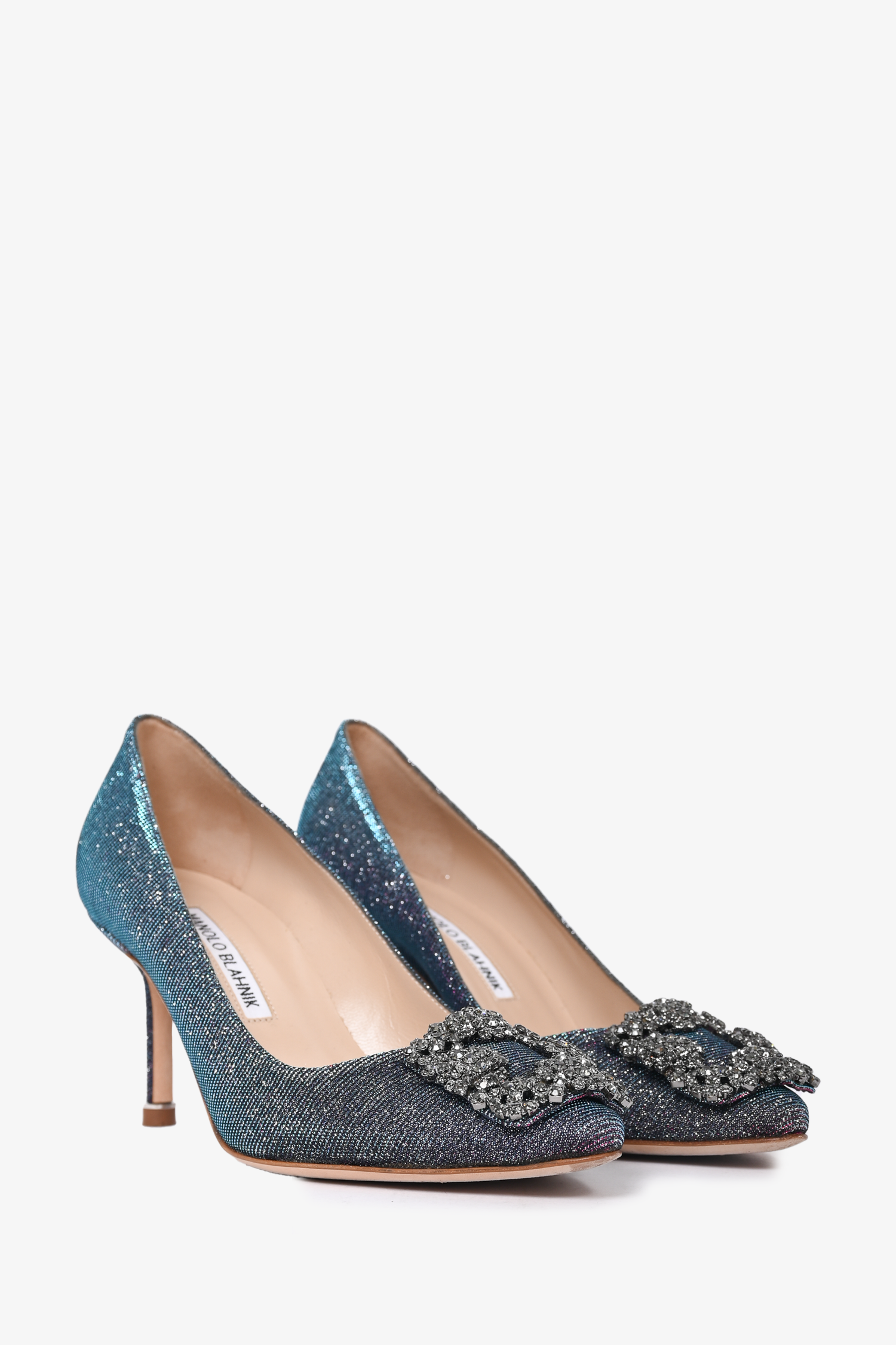 Refresh availabilityManolo Blahnik Blue Iridescent Shimmer Hangisi 70 Heels. Slip-on. Pointed toe with embellished buckle. Tonal stitching.