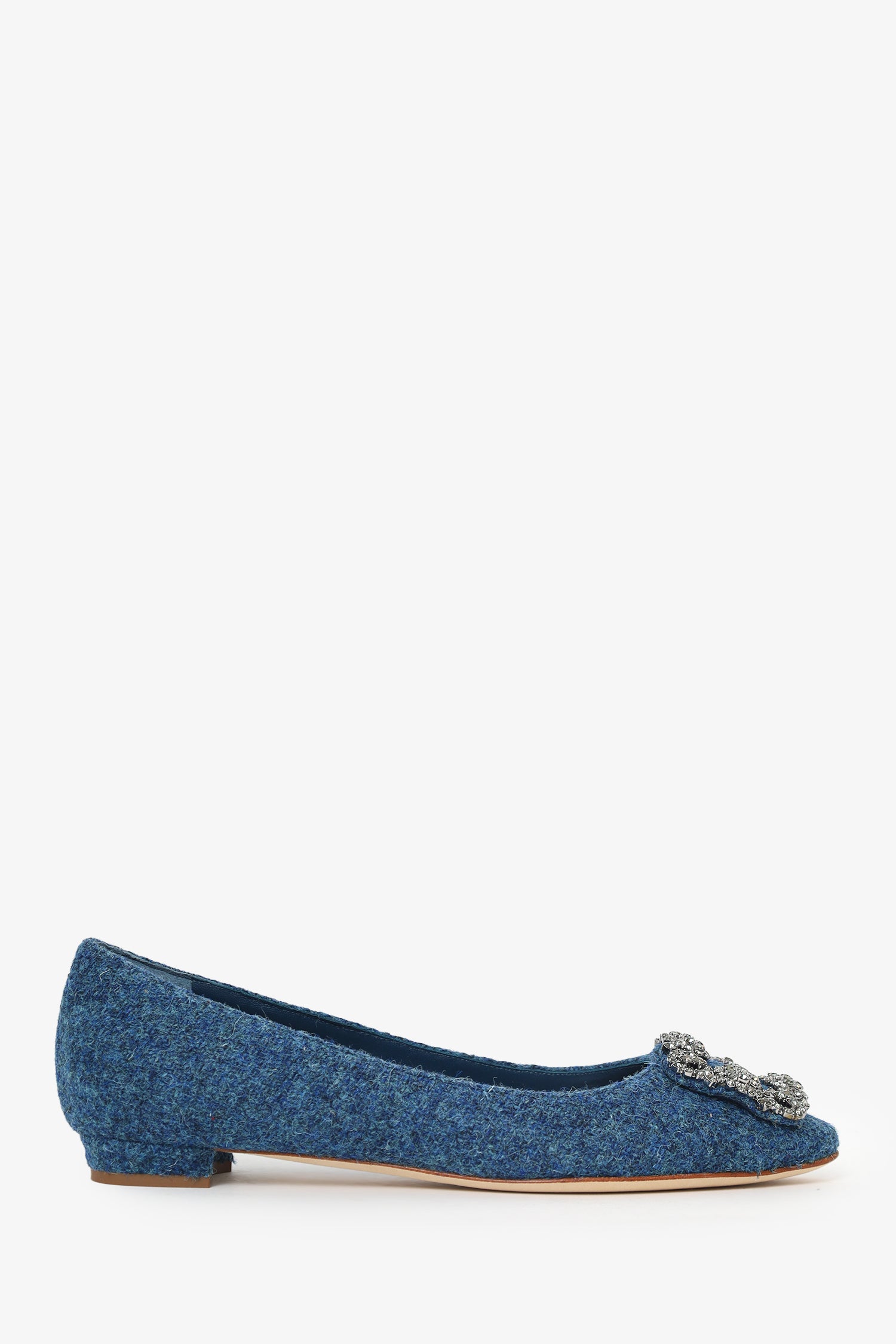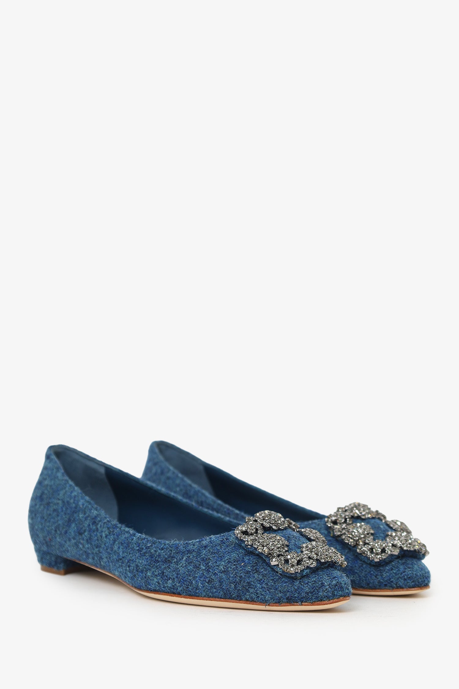 Refresh availabilityManolo Blahnik Blue Woven Hangisi Crystal Flat. Slip-on. Pointed toe. Crystal-tone hardware. Tonal stitching.