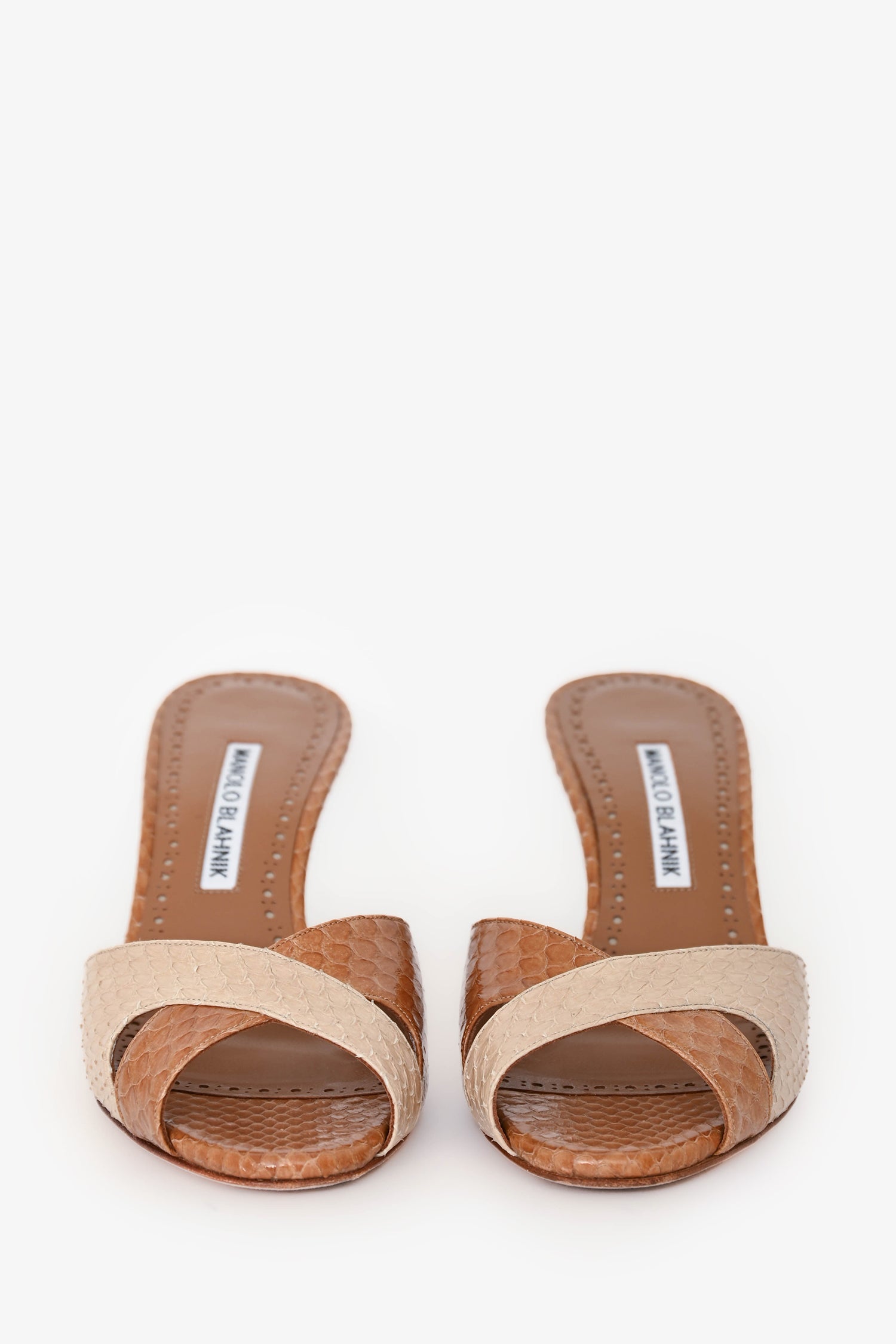 Refresh availabilityManolo Blahnik Brown Snakeskin Heels. Round, open toe. Leather-lined interior. Tonal hardware. Tonal stitching.