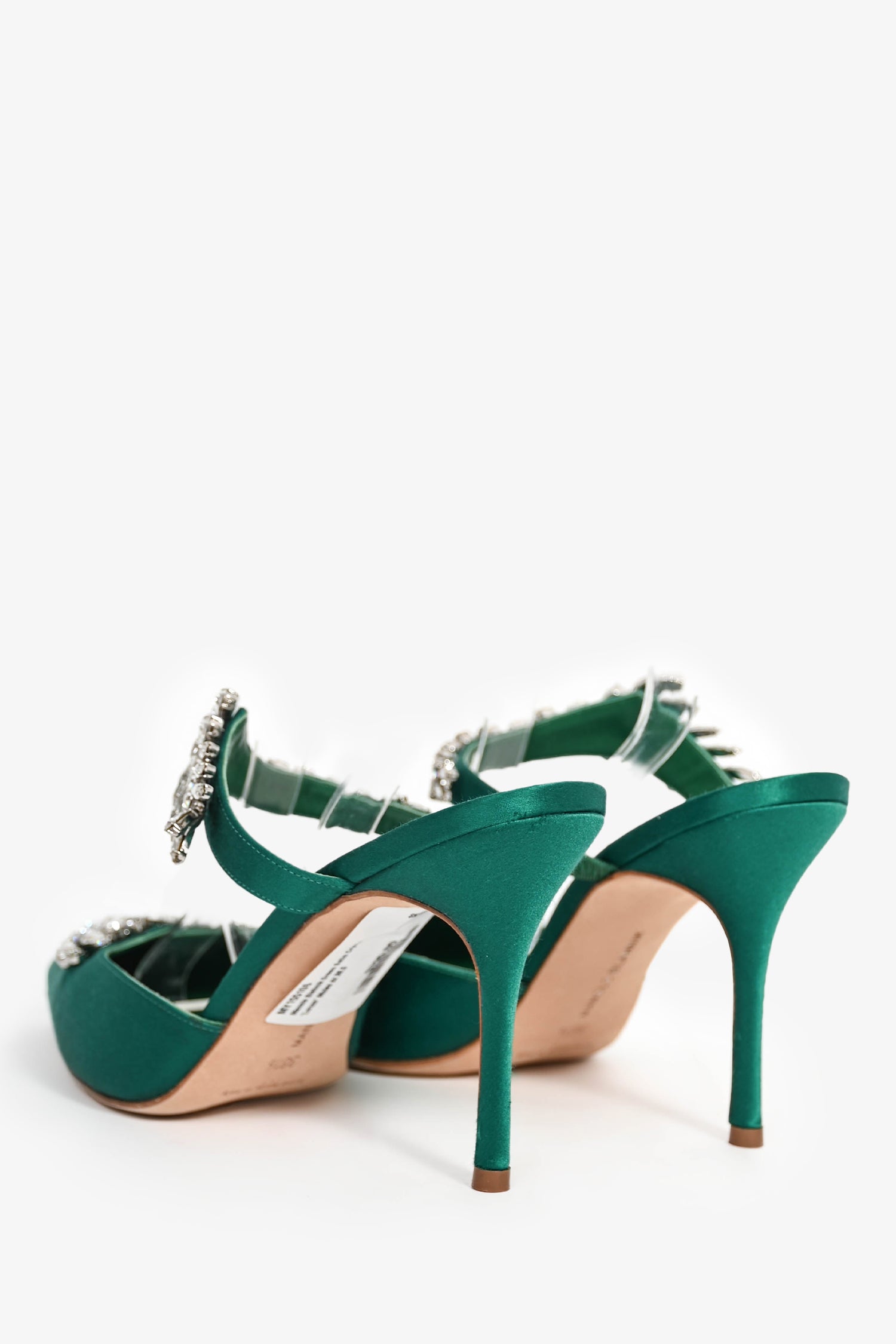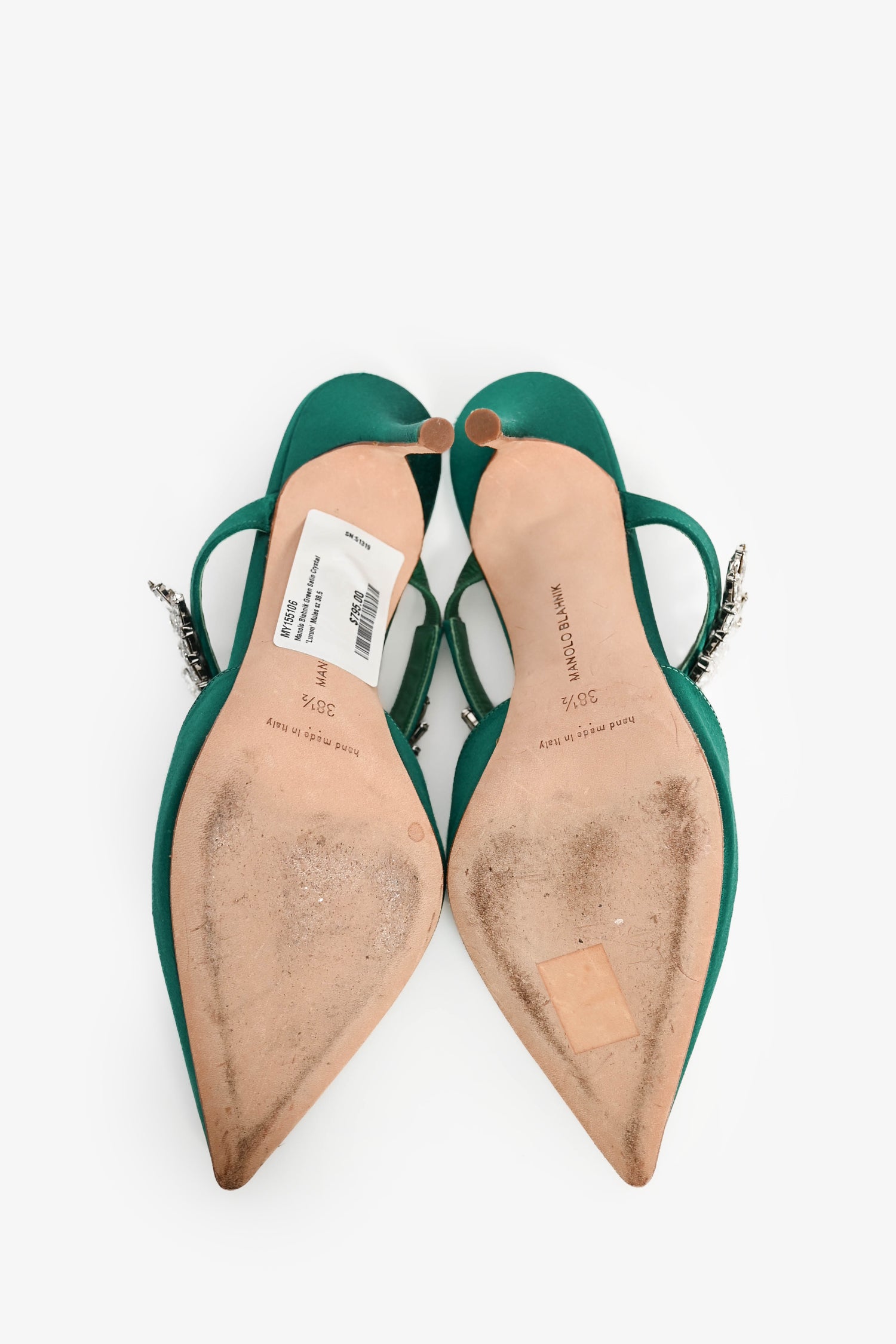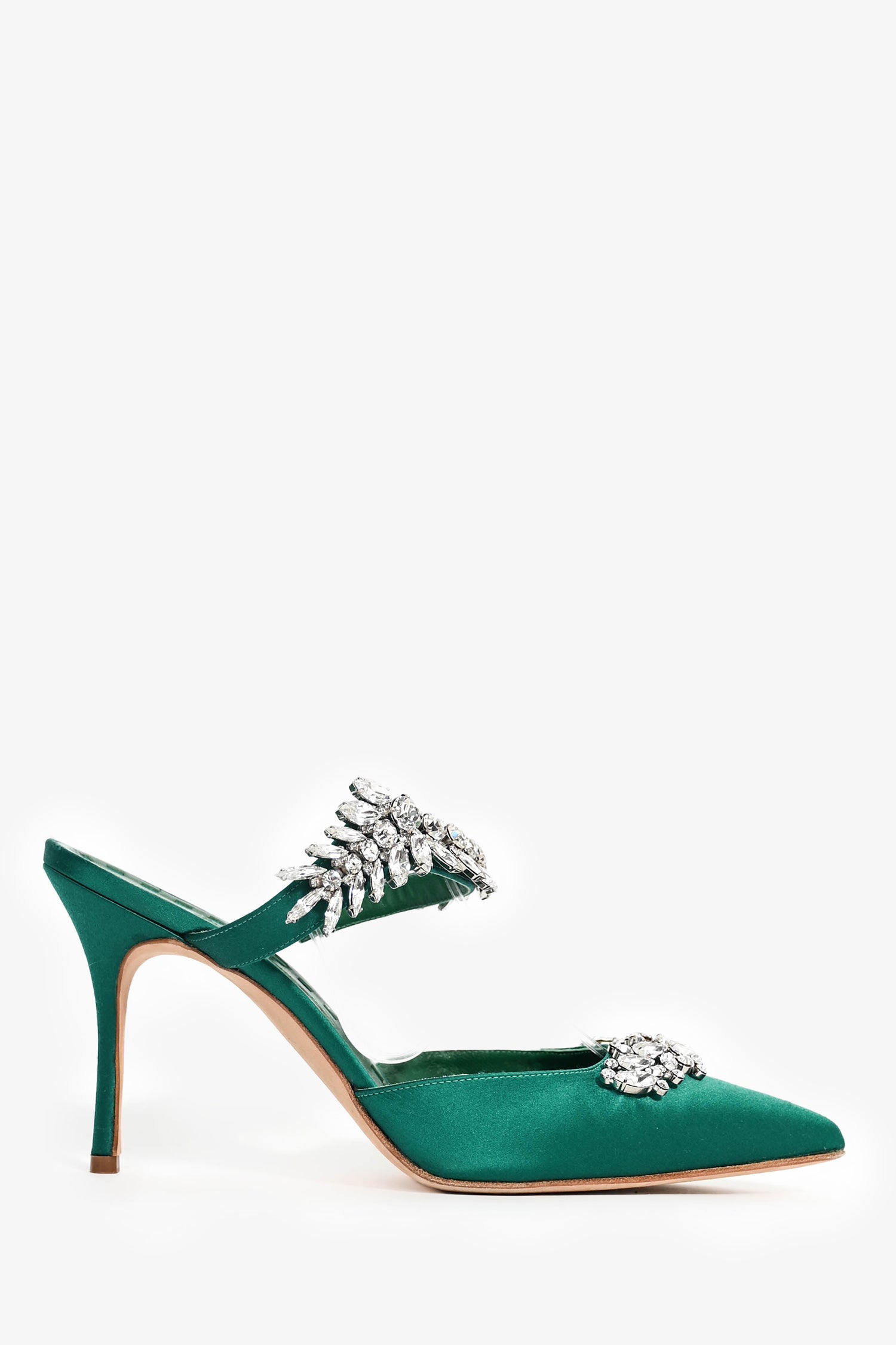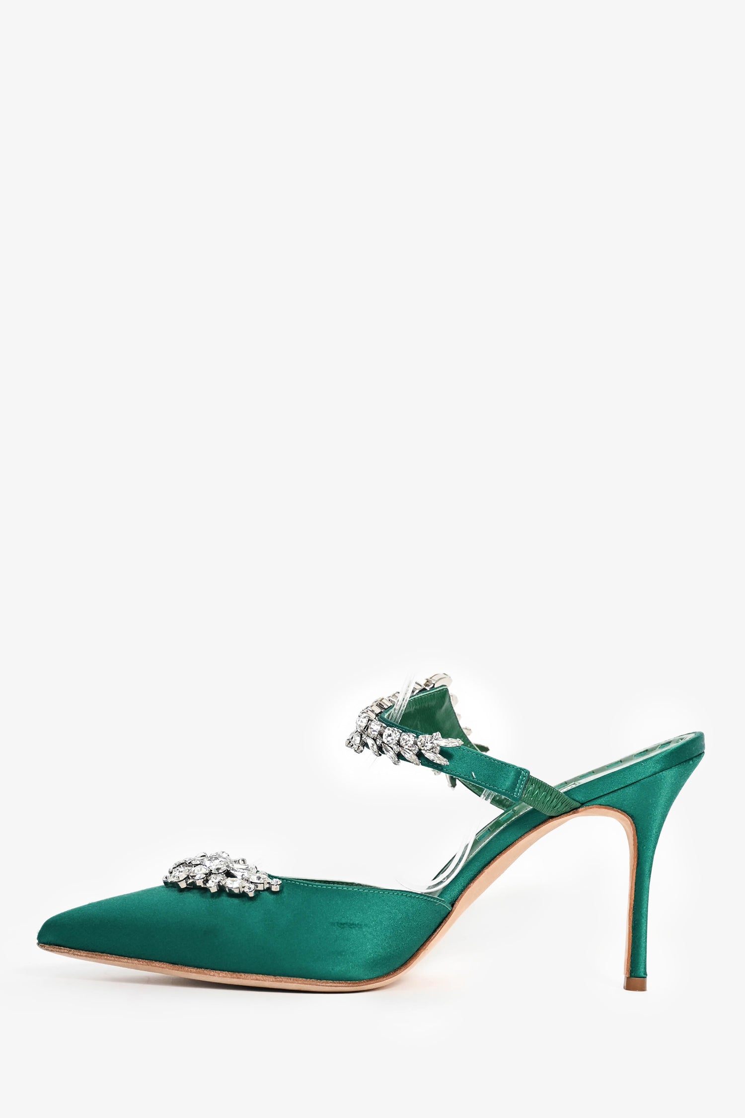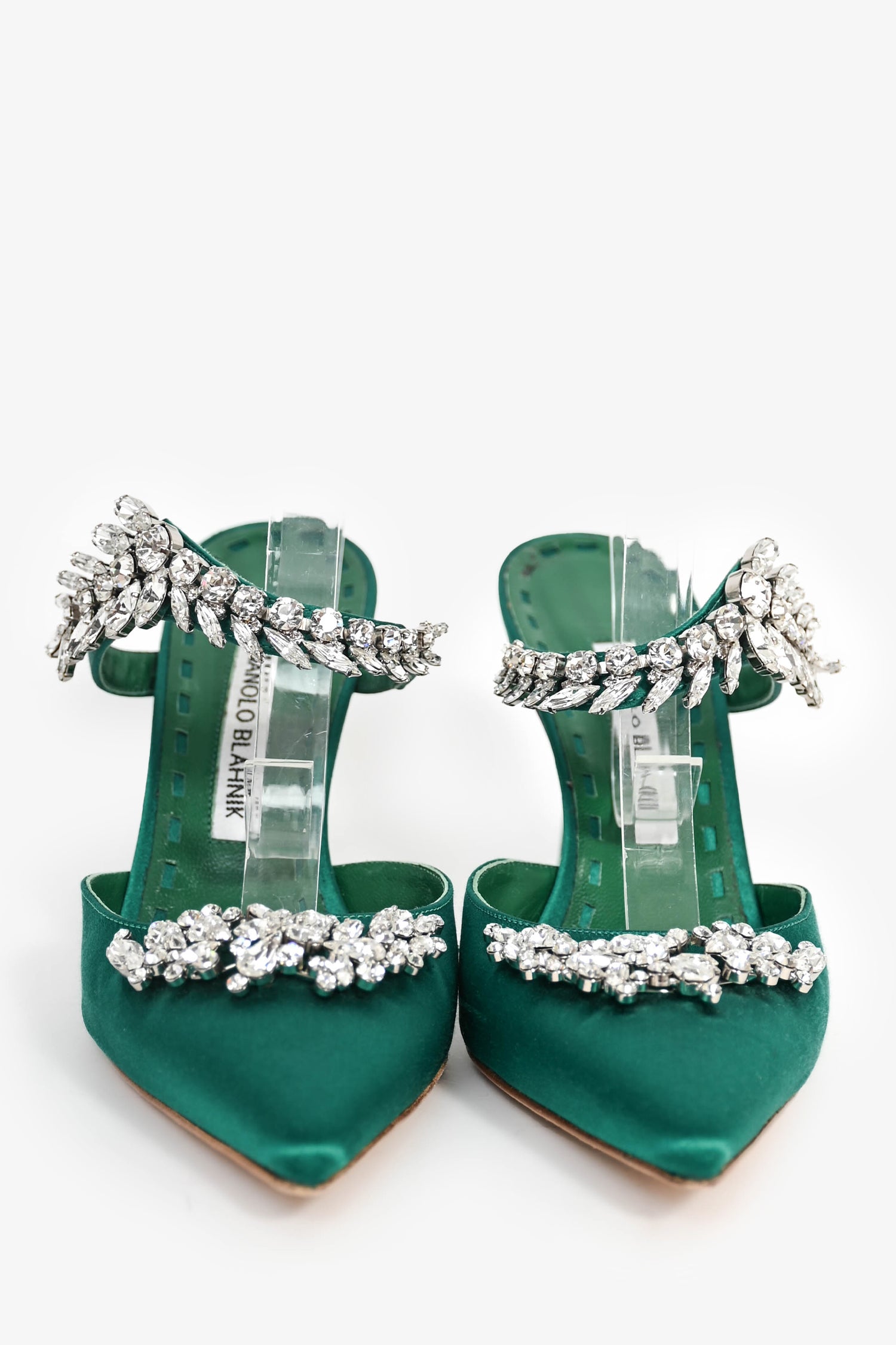 Refresh availabilityManolo Blahnik Green Satin Crystal 'Lurum' Mules. Pointed toe front. Leather insole. Covered satin exterior. Tonal stitching.