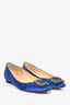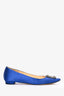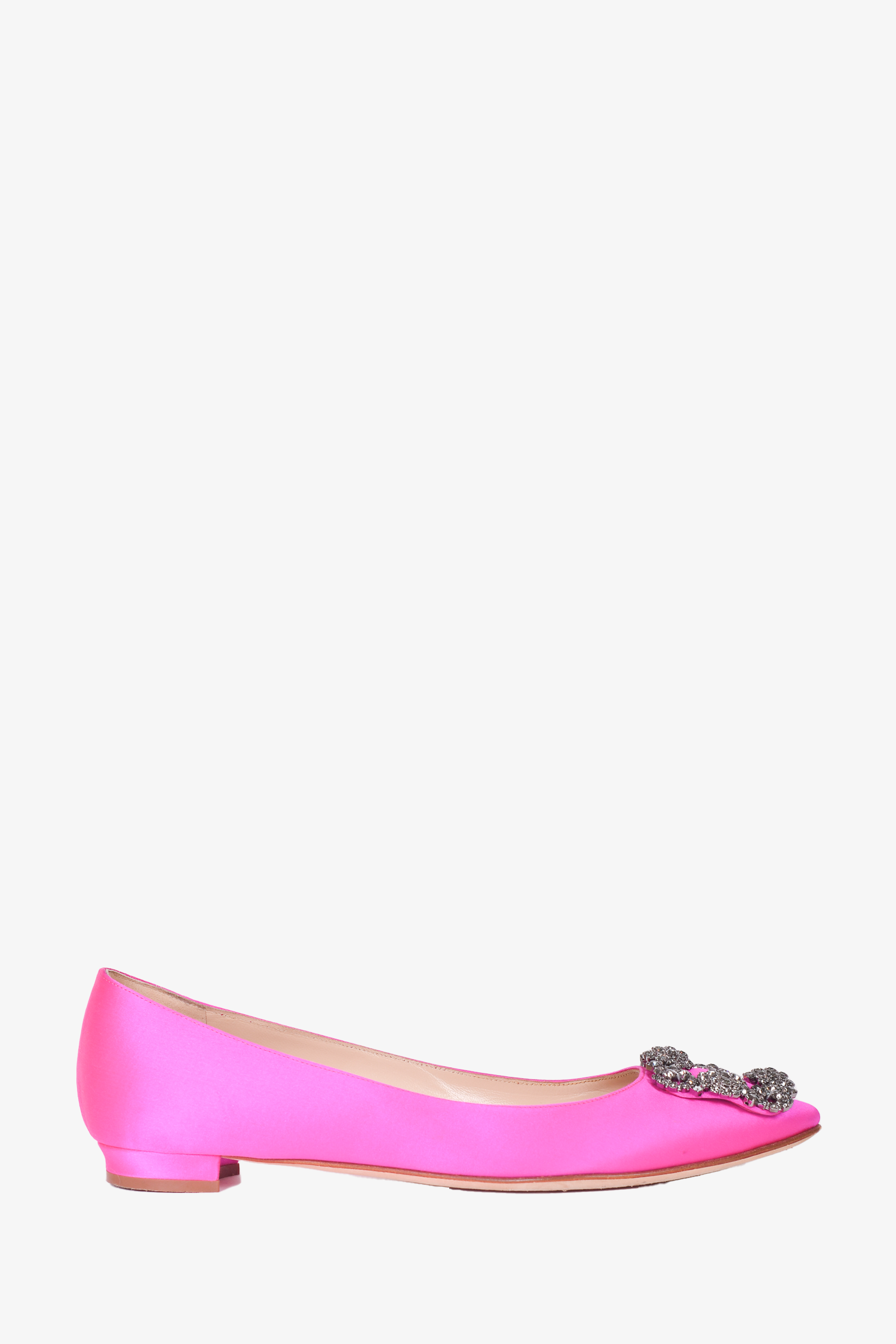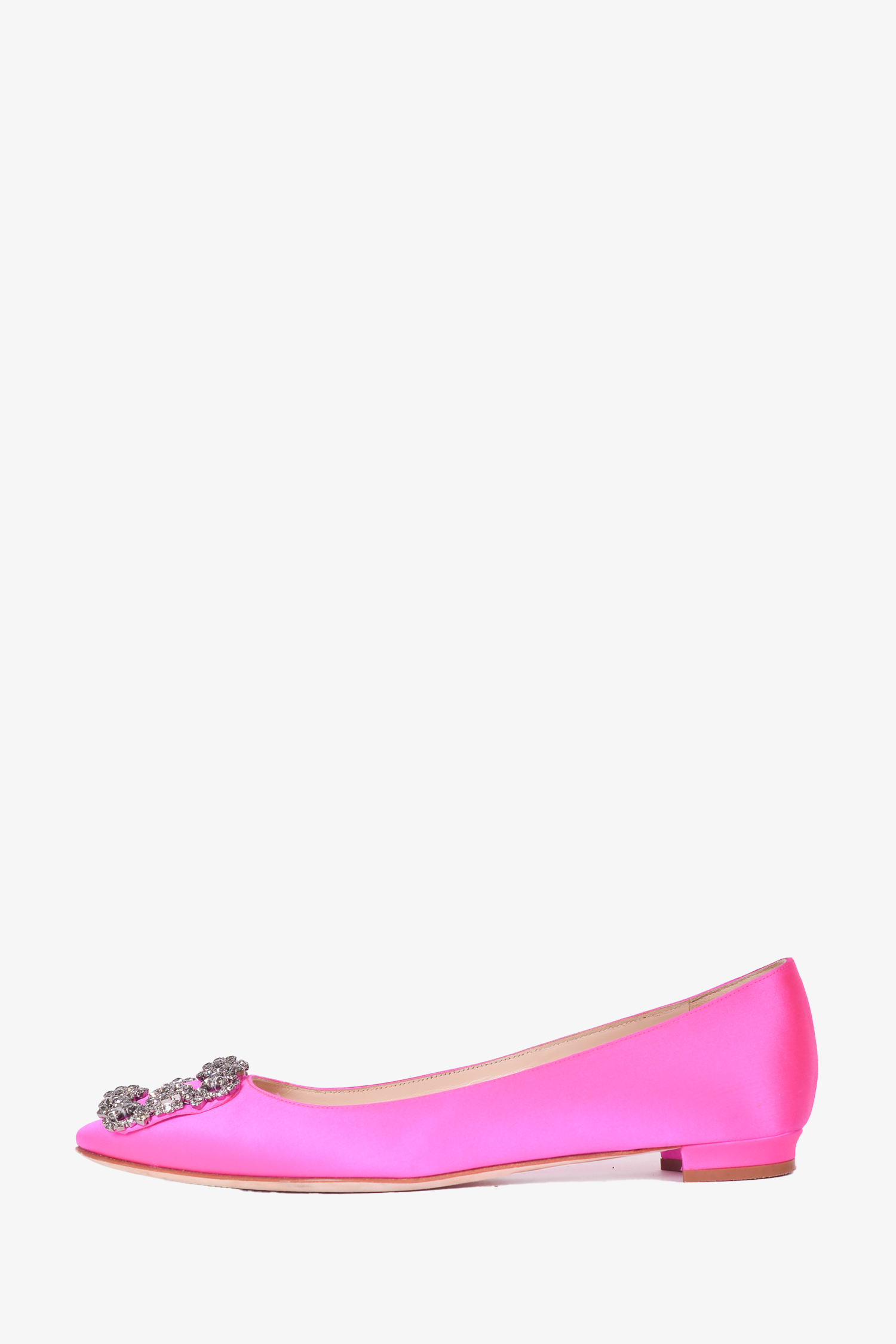 Manolo Blahnik Hot Pink Satin Hangisi Flats. Slip-on. Pointed toe. Embellished buckle detail at the upper. Tonal stitching.