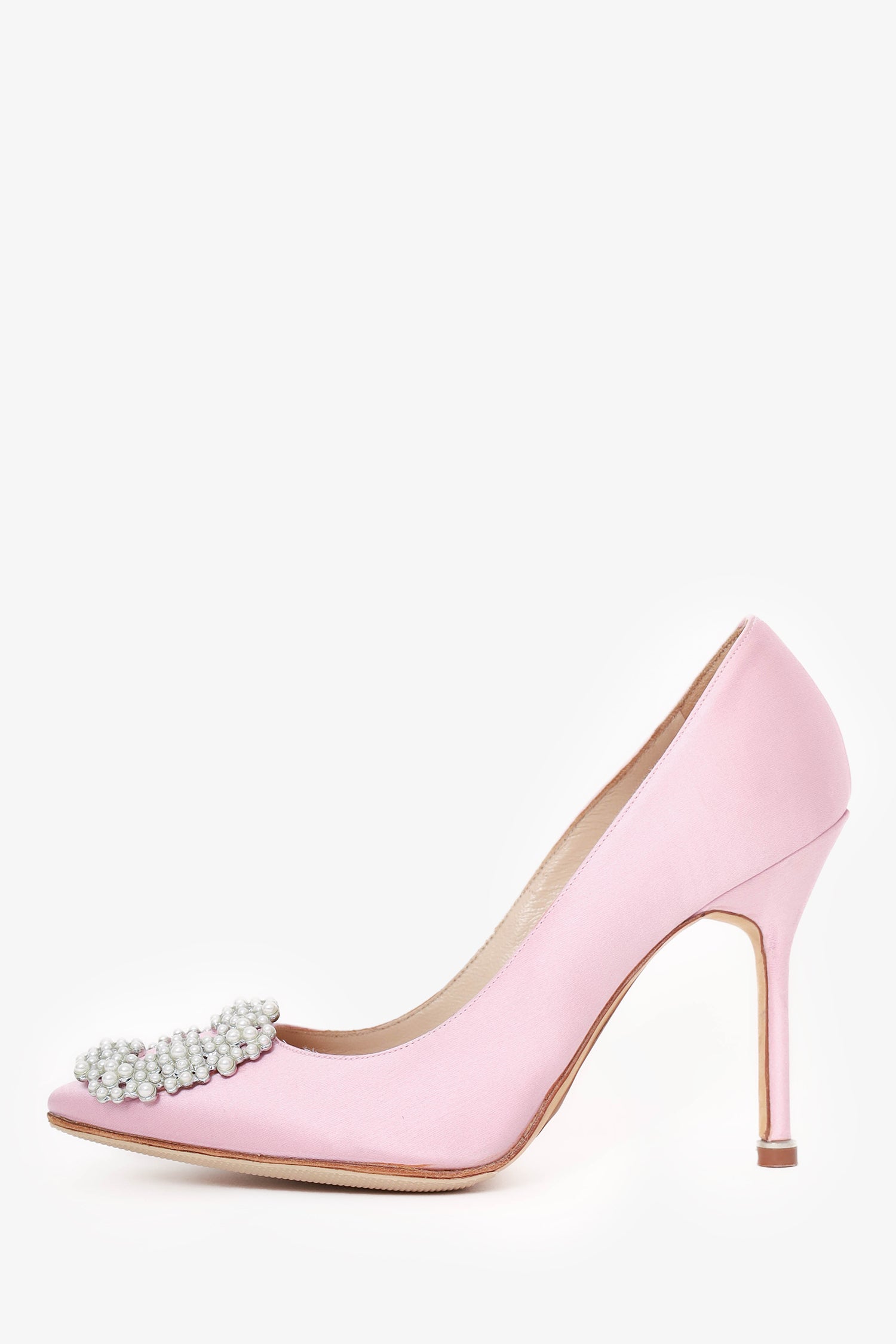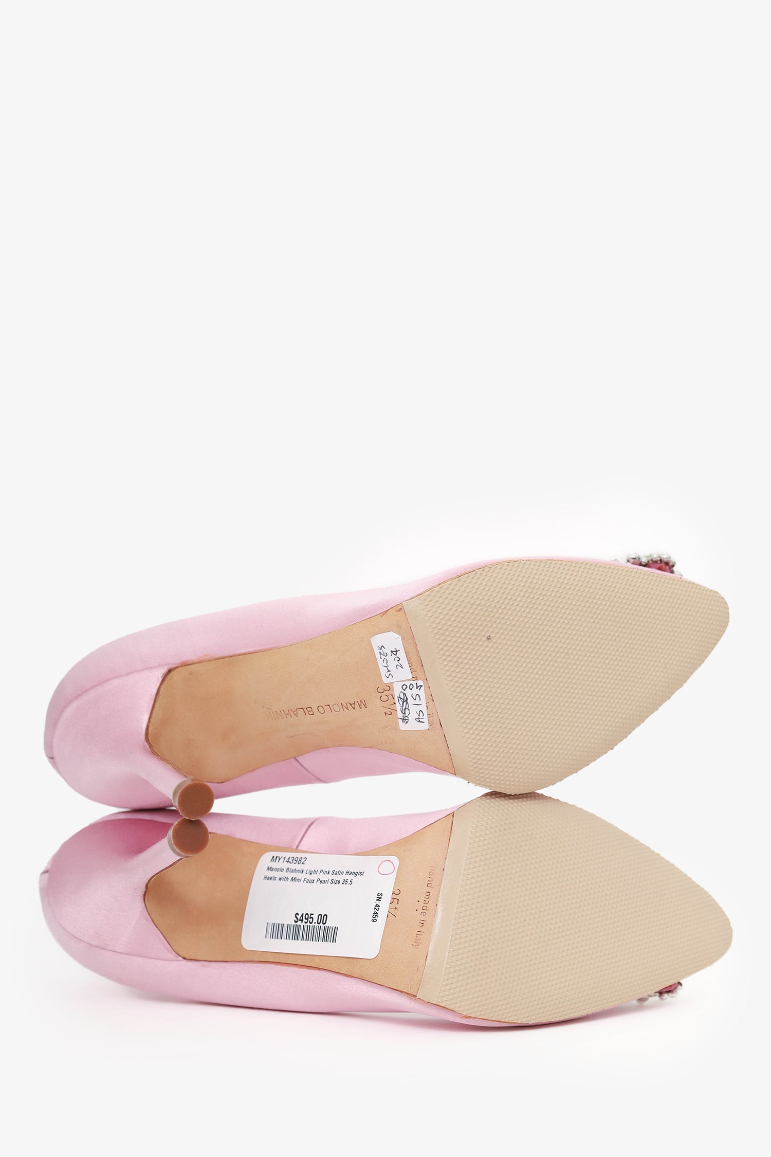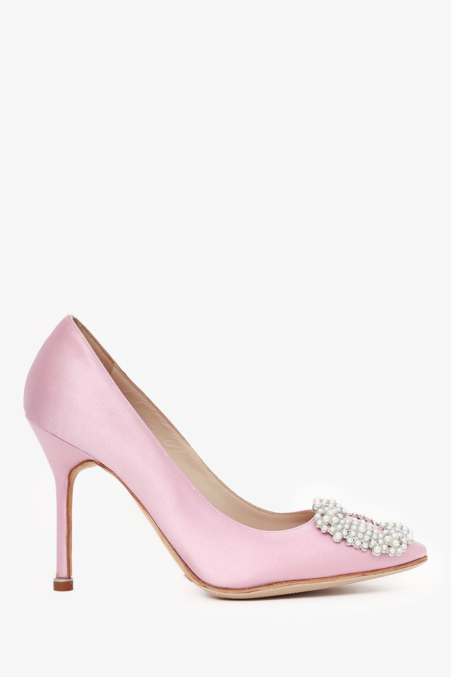 Refresh availabilityManolo Blahnik Light Pink Satin Hangisi Heels with Mini Faux Pearl. Slip-on. Pointed toe. Silver-tone hardware. Tonal stitching.